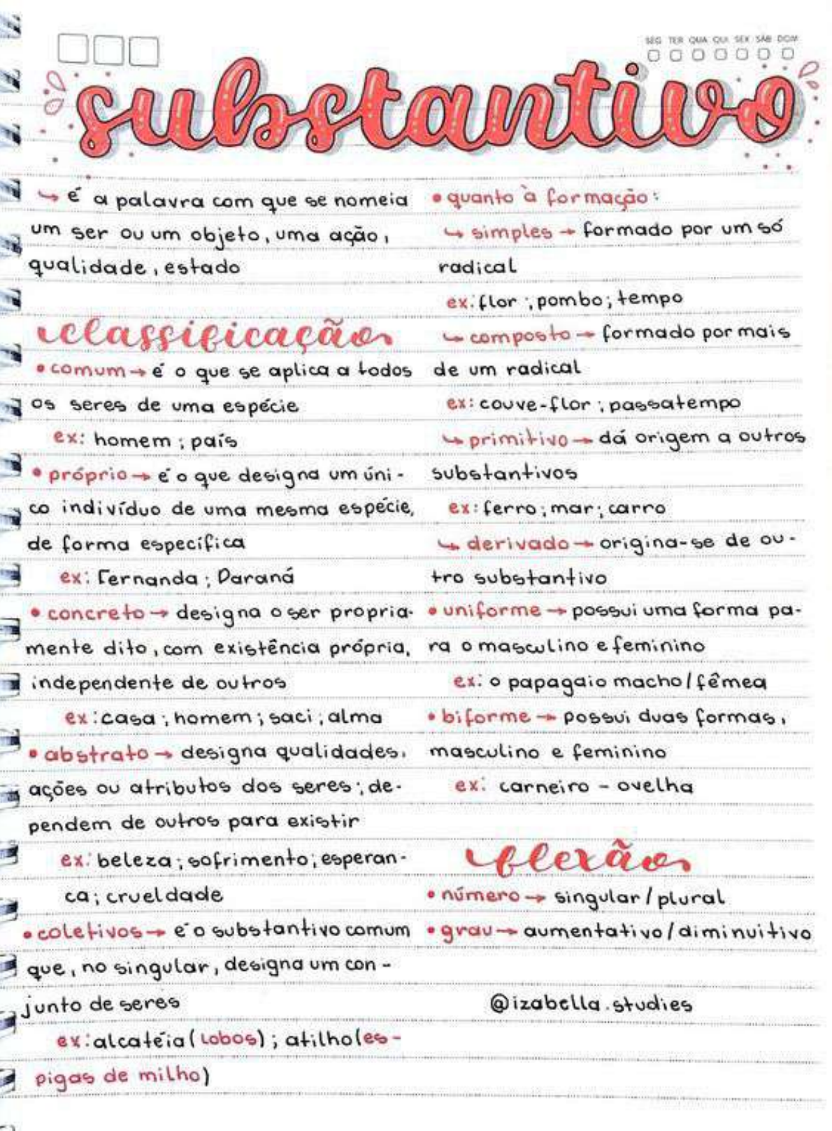 <p>QUA SEX a palavra com que se nomeia quanto a um ser ou um uma ação simples formado por um estado radical ex. flor pombo; tempo composto formado por mais comum que se aplica a todos de um radical seres de especie ex: couve-flor passatempo ex: homem primitivo da origem a outros próprio que designa um substantivos de uma mesma especie, ex: mar; carro de forma especifica derivado origina-se de ex: Darana tro substantivo concre designa oser propria- uniforme possui uma forma pa- mente dito, com existência ra e feminino independente de outros ex: papagaio macho ex: casa homem; alma biforme possui duas formas, abstrato designa qualidades, masculino e feminino ações ou atributos dos seres : de- ex: carneiro - ovelha pendem de outros para existir ex. beleza; ca; crueldade número singular/plural coletivos comum que, no singular, designa um con- junto de seres studies ex: alcateia (Lobos) ; atilholes- pigas de milho)</p>