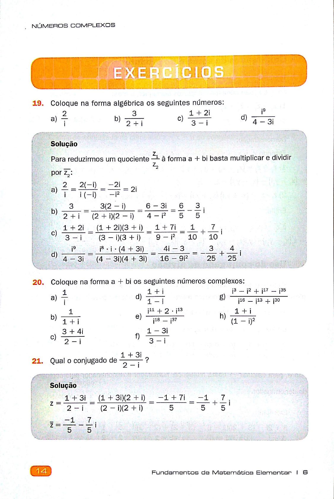 <p>NÚMEROS COMPLEXOS EXERCÍCIOS 19. Coloque na forma algébrica os seguintes números: Solução Para reduzirmos um forma a + bi basta multiplicar e dividir = 2i i = = 20. Coloque na forma a + bi os seguintes números complexos: 21. Qual conjugado de ? o Solução 7 i 5 14 Fundamentos de Matemática Elementar 16</p><p>NÚMEROS COMPLEXOS 22. Determine o conjugado de . i 23. Calcule o conjugado do inverso do número 24. Sejam u e V dois números complexos tais que - i (u e V conjugados de v). Calcule 25. Sejam os números complexos u = Calcule 26. Variando quais possíveis que complexo 1 o inteiro n, os valores o número pode assumir? 27. Dê as condições necessárias e suficientes para que (com C + di # seja um: a) imaginário puro; b) real. Solução - = - C + di a) Re(z) = 0 b) ad=0 28. 1 calcule o valor da parte real do número complexo . 29. Seja Z = iy, + # = - 1, X e y reais). Qual é a condição para que real? 30. são números complexos, + são ambos reais, o que se pode afirmar sobre e 31. Determine x(x E R) de modo que o número Z = seja imaginário puro. 32. Determine a(a E R) de modo que o número Z = seja real. 2 + ai 15 6 I Fundamentos de Matemática</p><p>NÚMEROS COMPLEXOS 33. Determine o número complexo cujo produto por 5 + 8i é real e cujo quociente por 1 + i é imaginário puro. 34. Determine número complexo tal que Z - = 1 o Z 35. Determine Z E C tal que Solução Fazendo temos: X yi = yi)i => X - então portanto 36. Sejam dados os números complexos e 2 Sendo IN o conjugado de z, calcule as partes real e imaginária do número complexo = 37. Demonstre que Zn para todo n natural. 38. Prove que se a equação x2 + (a + bi)x + (c + di) = em que a, b, d E R, admite uma raiz real, então abd = + 39. Determine os números complexos Z tais que 13 6i. 40. Determine Z E C tal que = 41. Determine Z E C tal que 42. Determine Z E C tal que 43. Sendo + = 1, prove que iy. 1 iy 44. Prove que 1 - sen X - i para todo X real, X 16 Fundamentos de Matemática Elementar I 6</p><p>NÚMEROS COMPLEXOS 46. Calcule o módulo dos seguintes números: c) e) i d) 0 f) 47. Calcule o módulo de com a e b reais. - , 48. Calcule o módulo do número complexo 1 X 49. Calcule na forma trigonométrica os números: d) 11 g) +i e) 2i h) i(1+i) c) -8 i) 50. Coloque na forma algébrica os seguintes números: a) 3 4 b) 2 + i sen 5 + 2 Solução a) = 2 + 2 + i 2 = + 51. Calcule o módulo dos números: a) (1 - b) 2i Solução Vamos aplicar as propriedades do módulo: = 26 Fundamentos de Matemática Elementar I 6</p><p>NÚMEROS COMPLEXOS = 52. Calcule o módulo dos números: a) (1 + i)3 (1 i)(2 + 2i)(4 + 4i) b) (1 - i)4 c) (5 + 12i) 53. Escreva na forma trigonométrica os números: a) c) 5 Solução a) 1 2 27 6 I Fundamentos de Matemática Elementar</p>