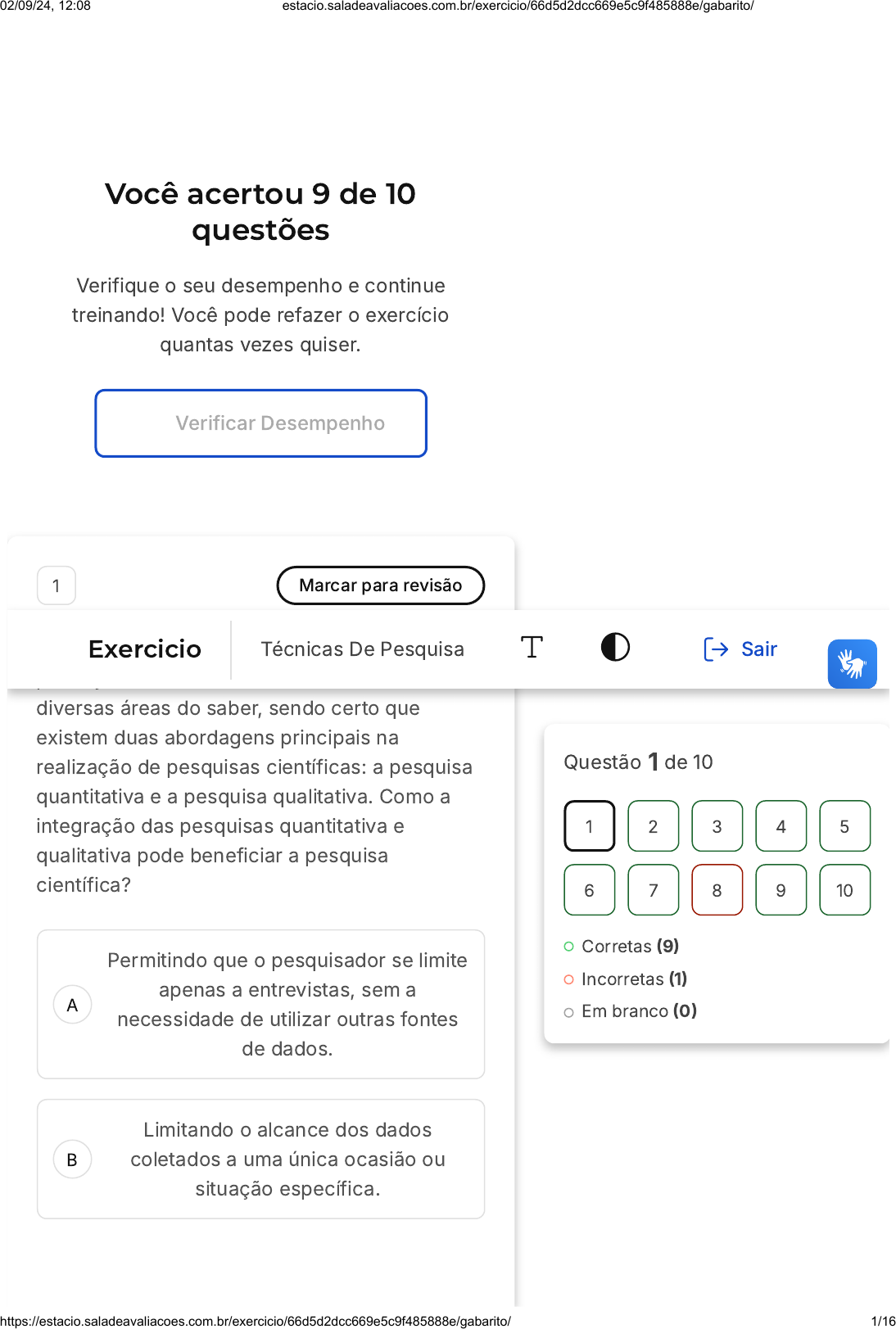 <p>Você acertou 9 de 10</p><p>questões</p><p>Verifique o seu desempenho e continue</p><p>treinando! Você pode refazer o exercício</p><p>quantas vezes quiser.</p><p>Verificar Desempenho</p><p>A</p><p>B</p><p>1 Marcar para revisão</p><p>A pesquisa é uma atividade fundamental para a</p><p>produção do conhecimento científico em</p><p>diversas áreas do saber, sendo certo que</p><p>existem duas abordagens principais na</p><p>realização de pesquisas científicas: a pesquisa</p><p>quantitativa e a pesquisa qualitativa. Como a</p><p>integração das pesquisas quantitativa e</p><p>qualitativa pode beneficiar a pesquisa</p><p>científica?</p><p>Permitindo que o pesquisador se limite</p><p>apenas a entrevistas, sem a</p><p>necessidade de utilizar outras fontes</p><p>de dados.</p><p>Limitando o alcance dos dados</p><p>coletados a uma única ocasião ou</p><p>situação específica.</p><p>Questão 1 de 10</p><p>Corretas �9�</p><p>Incorretas �1�</p><p>Em branco �0�</p><p>1 2 3 4 5</p><p>6 7 8 9 10</p><p>Exercicio Técnicas De Pesquisa Sair</p><p>02/09/24, 12:08 estacio.saladeavaliacoes.com.br/exercicio/66d5d2dcc669e5c9f485888e/gabarito/</p><p>https://estacio.saladeavaliacoes.com.br/exercicio/66d5d2dcc669e5c9f485888e/gabarito/ 1/16</p><p>C</p><p>D</p><p>E</p><p>Permitindo que o pesquisador tenha</p><p>maior confiança em seus dados e</p><p>conclusões, ao fazer um cruzamento</p><p>entre os resultados obtidos de</p><p>diferentes métodos.</p><p>Impedindo que o pesquisador colete</p><p>dados estatísticos e fontes</p><p>documentais.</p><p>Dificultando a aplicação de</p><p>questionários e entrevistas repetidas.</p><p>Resposta correta</p><p>Parabéns, você selecionou a</p><p>alternativa correta. Confira o</p><p>gabarito comentado!</p><p>Gabarito Comentado</p><p>A integração das pesquisas quantitativa e</p><p>qualitativa permite que o pesquisador faça</p><p>um cruzamento de suas conclusões de</p><p>modo a ter maior confiança de que seus</p><p>dados não são produto de um</p><p>procedimento específico ou de alguma</p><p>situação particular. Ele não se limita ao que</p><p>pode ser coletado em uma entrevista: pode</p><p>entrevistar repetidamente, pode aplicar</p><p>questionários, pode investigar diversas</p><p>questões em diferentes ocasiões, pode</p><p>utilizar fontes documentais e dados</p><p>estatísticos.</p><p>2 Marcar para revisão</p><p>02/09/24, 12:08 estacio.saladeavaliacoes.com.br/exercicio/66d5d2dcc669e5c9f485888e/gabarito/</p><p>https://estacio.saladeavaliacoes.com.br/exercicio/66d5d2dcc669e5c9f485888e/gabarito/ 2/16</p><p>A</p><p>B</p><p>C</p><p>D</p><p>E</p><p>"Pesquisa científica é a realização concreta de</p><p>uma investigação planejada, desenvolvida e</p><p>redigida de acordo com as normas da</p><p>metodologia consagradas pela ciência" �RUIZ,</p><p>1985�. Para se tornar um pesquisador é preciso</p><p>planejamento, organização e definições de</p><p>etapas. Para que o problema se torne concreto</p><p>e explícito, três passos são aconselháveis:</p><p>I� Imersão de forma sistemática no assunto</p><p>escolhido.</p><p>II� Estudar as fontes literárias existentes.</p><p>III� Desconsiderar pesquisas anteriores no</p><p>campo de estudo, para não influenciar a</p><p>produção.</p><p>Somente II é correta</p><p>Somente I é correta</p><p>Somente I e II são corretas</p><p>Somente III é correta</p><p>Somente II e III são corretas</p><p>Resposta correta</p><p>Parabéns, você selecionou a</p><p>alternativa correta. Confira o</p><p>gabarito comentado!</p><p>Gabarito Comentado</p><p>As etapas I e II são fundamentais para a</p><p>realização de uma pesquisa científica. A</p><p>imersão sistemática no assunto escolhido</p><p>�I) permite ao pesquisador um</p><p>entendimento profundo e abrangente do</p><p>02/09/24, 12:08 estacio.saladeavaliacoes.com.br/exercicio/66d5d2dcc669e5c9f485888e/gabarito/</p><p>https://estacio.saladeavaliacoes.com.br/exercicio/66d5d2dcc669e5c9f485888e/gabarito/ 3/16</p><p>tema, enquanto o estudo das fontes</p><p>literárias existentes �II) fornece um</p><p>panorama do que já foi produzido e</p><p>publicado sobre o assunto, permitindo</p><p>identificar lacunas e oportunidades para</p><p>novas pesquisas. A etapa III, por outro lado,</p><p>não é aconselhável, pois as pesquisas</p><p>anteriores no campo de estudo são</p><p>fundamentais para embasar e</p><p>contextualizar a nova pesquisa, além de</p><p>evitar a repetição de estudos já realizados.</p><p>Portanto, as alternativas I e II são as</p><p>corretas.</p><p>3 Marcar para revisão</p><p>"[...] a pesquisa não se reduz a certos</p><p>procedimentos metodológicos", afirma a</p><p>Antropóloga Mirian Goldenberg em seu livro</p><p>"Como fazer pesquisa qualitativa em Ciências</p><p>Sociais" �2004, p. 11�. Portanto, é necessário</p><p>que o pesquisador esteja aberto às várias</p><p>possibilidades. Neste sentido, comparando a</p><p>abordagem da pesquisa qualitativa e a</p><p>abordagem da pesquisa quantitativa, avalie as</p><p>assertivas a seguir.</p><p>I� A pesquisa qualitativa identifica conceitos,</p><p>problemas, variações e situações que apenas</p><p>podem ser analisadas qualitativamente.</p><p>II� Sentimentos, motivações, crenças e atitudes</p><p>individuais são difíceis de ser quantificáveis,</p><p>portanto, nesta situação a pesquisa de</p><p>abordagem qualitativa é mais indicada.</p><p>III� Os limites de cada abordagem podem ser</p><p>compensados pela integração entre elas,</p><p>portanto a pesquisa e qualitativa podem</p><p>mutuamente se ajudar.</p><p>02/09/24, 12:08 estacio.saladeavaliacoes.com.br/exercicio/66d5d2dcc669e5c9f485888e/gabarito/</p><p>https://estacio.saladeavaliacoes.com.br/exercicio/66d5d2dcc669e5c9f485888e/gabarito/ 4/16</p><p>A</p><p>B</p><p>C</p><p>D</p><p>E</p><p>Somente I e II estão corretas.</p><p>Somente II está correta.</p><p>Somente II e III estão corretas.</p><p>Somente I e III estão corre