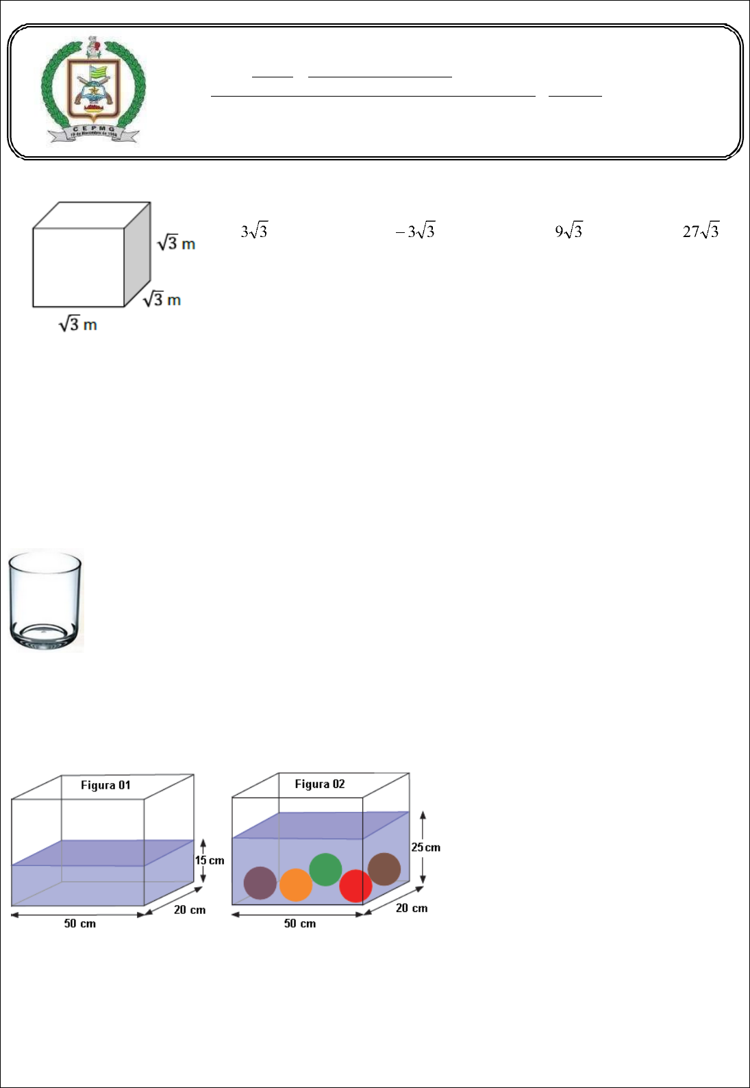 <p>ATIVIDADE PARA OFICINA</p><p>01) (MEARIM - MA). Observe a figura abaixo.</p><p>A expressão que melhor representa o volume dessa figura é:</p><p>(A) m3 (B) m3 (C) m3 (D) m3</p><p>02) (SAEMS). Uma piscina na forma de um paralelepípedo retângulo tem 5m de comprimento, 3m de largura</p><p>e 2m de profundidade. Qual é a capacidade máxima dessa piscina?</p><p>A) 10 m3 B) 20 m3 C) 30 m3 D) 62 m3</p><p>03) (PROEB). Uma piscina com a forma de um paralelepípedo retângulo tem 15 m de comprimento, 8 m de</p><p>largura e 3 m de profundidade. A piscina está com água até a metade e precisa ser totalmente esvaziada.</p><p>Qual é o volume de água a ser retirado dessa piscina?</p><p>A) 120 m3 B) 180 m3 C) 360 m3 D) 720 m3</p><p>04) (SARESP-2011). Sabe-se que 1 cm3 = 1 mℓ.</p><p>Desta forma, cabem em um copo cilíndrico com 20 cm de altura, cuja base tem área de 12 cm2, em mililitros:</p><p>(A) 120 (B) 200 (C) 240 (D) 300</p><p>05) (Saresp-2010). Um aquário possui o formato de um bloco retangular, cujas dimensões da base são 50 cm e</p><p>20 cm, e a água contida em seu interior está atingindo um nível de altura 15 cm (Figura 1). Mergulhando, a seguir,</p><p>5 bolas coloridas de metal, de volumes iguais, o nível de água do aquário atinge uma altura de 25 cm (Figura 2).</p><p>Calcule o volume, em cm3, ocupado por cada bola.</p><p>A) 15.000 cm³ B) 10.000 cm³ C) 2000 cm³ D) 1000 cm³</p><p>Colégio Estadual da Polícia Militar de Goiás Professor Ivan Ferreira</p><p>Pires do Rio, de 2024.</p><p>Nome: 1ª</p><p>Professor (a): Dra. Thaianne Lopes</p><p>Disciplina: Estudo Orientado Matemática</p><p>06) (SALTO – TO /Adaptada). Uma caixa d’água, com a forma de um cilindro, mede 3 m de altura e 2 m de</p><p>raio, conforme a figura abaixo: (considere: π = 3,14).</p><p>O volume da caixa d’água, em m2, é</p><p>(A) 10,56</p><p>(B) 12,56</p><p>(C) 11,56</p><p>(D) 37,68</p>
