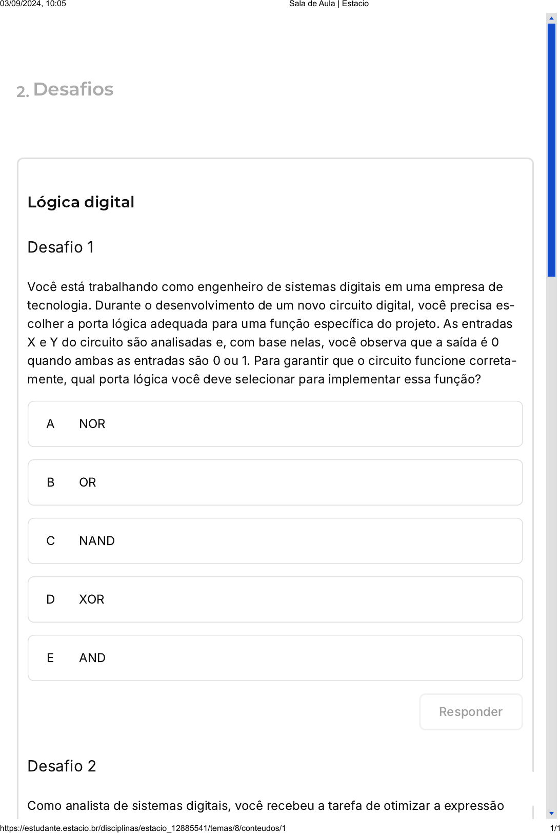 <p>2.Desa�os</p><p>Lógica digital</p><p>Desafio 1</p><p>Você está trabalhando como engenheiro de sistemas digitais em uma empresa de</p><p>tecnologia. Durante o desenvolvimento de um novo circuito digital, você precisa es-</p><p>colher a porta lógica adequada para uma função específica do projeto. As entradas</p><p>X e Y do circuito são analisadas e, com base nelas, você observa que a saída é 0</p><p>quando ambas as entradas são 0 ou 1. Para garantir que o circuito funcione correta-</p><p>mente, qual porta lógica você deve selecionar para implementar essa função?</p><p>A NOR</p><p>B OR</p><p>C NAND</p><p>D XOR</p><p>E AND</p><p>Desafio 2</p><p>Como analista de sistemas digitais, você recebeu a tarefa de otimizar a expressão</p><p>Responder</p><p>03/09/2024, 10:05 Sala de Aula | Estacio</p><p>https://estudante.estacio.br/disciplinas/estacio_12885541/temas/8/conteudos/1 1/1</p>