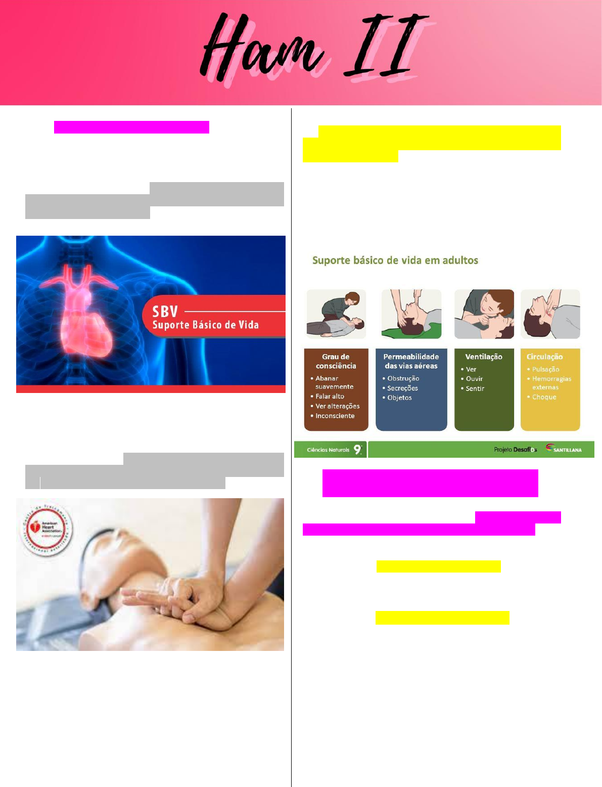 <p>Júlia Carvalho</p><p>@juliacarvalhovg</p><p>O Suporte Básico de Vida (SBV), conhecido no</p><p>termo em inglês como Basic Life Support (BLS), é</p><p>um conjunto de providências em sequência realizados</p><p>por pessoa leiga no local, um leigo treinado (que fez</p><p>um curso de resgate), profissionais de saúde e/ou</p><p>resgate, que visam dar o primeiro atendimento com</p><p>suporte básico de vida à vítima até a chegada do</p><p>suporte avançado de vida.</p><p>O SBV é essencial até a chegada do serviço</p><p>médico de emergência profissional, que fará o</p><p>transporte até um hospital. A missão principal é</p><p>manter a pressão de perfusão cerebral ou pressão de</p><p>perfusão coronária com intuito de restabelecer um</p><p>retorno de circulação espontâneo mantendo oxigênio</p><p>no cérebro até atendimento especializado.</p><p>A American Heart Association (Associação</p><p>Americana do Coração) estima que cerca de 350.000</p><p>paradas cardíacas ocorrem fora dos hospitais todos</p><p>os anos nos Estados Unidos. Dessas ocorrências,</p><p>cerca de 90% são fatais. No entanto, o fornecimento</p><p>imediato de Suporte Básico de Vida, principalmente a</p><p>realização de compressões torácicas, pode dobrar ou</p><p>até mesmo triplicar a taxa de sobrevivência das</p><p>vítimas.</p><p>Além disso, estudos mostram que a rápida</p><p>implementação do SBV também é crucial em casos</p><p>de engasgamento. Segundo a Cruz Vermelha</p><p>Americana, cerca de 4.500 mortes por asfixia ocorrem</p><p>anualmente nos Estados Unidos. Sendo a principal</p><p>causa, a obstrução das vias respiratórias. O</p><p>reconhecimento precoce do engasgamento e a</p><p>aplicação de manobras de desobstrução das vias</p><p>aéreas, como a Manobra de Heimlich, podem salvar</p><p>vidas e prevenir danos cerebrais irreversíveis.</p><p>*Sequência do SBV em adultos</p><p>No atendimento à pessoa em PCR (sem pulso</p><p>central, respiração e responsividade), o</p><p>mnemônico CAB ou CABD descreve a ordem das</p><p>intervenções. Essas medidas visam a restabelecer o</p><p>quanto antes a circulação espontânea, a perfusão</p><p>dos órgãos vitais e a chegada da equipe de</p><p>ressuscitação. Vejamos:</p><p>1. C – (check) Checagem: Checar a</p><p>segurança do local, checar a</p><p>responsividade da vítima, checar o pulso e</p><p>a respiração, chamar por ajuda e iniciar as</p><p>compressões. As compressões devem ser</p><p>feitas em ciclos de 30 compressões,</p><p>intercalados com a ventilação, ou contínuas,</p><p>na frequência de 100 a 120 compressões por</p><p>minuto, com uma profundidade de em média</p><p>5cm, permitindo o retorno do tórax após cada</p><p>compressão. O socorrista que está realizando</p><p>a compressão deve ser substituído a cada</p><p>dois minutos ou antes, se houver cansaço; No</p><p>https://www.google.com/url?sa=i&url=https://ead.foxtreinamentos.com/course/sbv-suporte-basico-de-vida/&psig=AOvVaw3gdQQJHc40mThVNW8U4_Ly&ust=1712016731018000&source=images&cd=vfe&opi=89978449&ved=0CBIQjRxqFwoTCJDEm8bdn4UDFQAAAAAdAAAAABAD</p><p>https://www.google.com/url?sa=i&url=https://ensino.einstein.br/csr_bls_suporte_basico_vida_p0762/p&psig=AOvVaw3gdQQJHc40mThVNW8U4_Ly&ust=1712016731018000&source=images&cd=vfe&opi=89978449&ved=0CBIQjRxqFwoTCJDEm8bdn4UDFQAAAAAdAAAAABAI</p><p>https://www.google.com/url?sa=i&url=https://br.pinterest.com/pin/278026976981734993/&psig=AOvVaw1WoUzn-LWNke0rjXAlpx5Y&ust=1711917605428000&source=images&cd=vfe&opi=89978449&ved=0CBIQjRxqFwoTCLCk-JzsnIUDFQAAAAAdAAAAABAD</p><p>https://www.google.com/url?sa=i&url=https://portal.wemeds.com.br/suporte-basico-de-vida-bls-pcr/&psig=AOvVaw1WoUzn-LWNke0rjXAlpx5Y&ust=1711917605428000&source=images&cd=vfe&opi=89978449&ved=0CBIQjRxqFwoTCLCk-JzsnIUDFQAAAAAdAAAAABAN</p><p>Júlia Carvalho</p><p>@juliacarvalhovg</p><p>caso de 1 ou dois socorristas 30:</p><p>compressões.</p><p>2. A – (airway) Abertura da via Aérea:</p><p>A abertura da via aérea pode ser feita com a</p><p>inclinação da cabeça para trás e elevação do</p><p>queixo (manobra de Chin-Lift) ou com a</p><p>anteriorização da mandíbula (manobra de</p><p>Jaw-Thrust).</p><p>3. B – (breath) ventilação: A oferta da</p><p>ventilação pode ser feita utilizando um</p><p>dispositivo bolsa-válvula-máscara (ambu) ou</p><p>uma máscara de bolso (pocket-mask), na</p><p>frequência de 2 ventilações a cada 30</p><p>compressões. É importante observar se</p><p>durante a ventilação existem sinais de</p><p>permeabilidade aérea, como a</p><p>expansibilidade torácica ou abdominal durante</p><p>a ventilação. Caso o socorrista não se sinta</p><p>seguro para realizar a ventilação, a prioridade</p><p>é a compressão de alta qualidade.</p><p>4. D – Desfibrilação: o uso de um DEA</p><p>ajuda o socorrista a identificar se a vítima está</p><p>em PCR, se é um ritmo chocável e, quando é</p><p>o caso, aplica o choque na tentativa de</p><p>reverter a PCR.</p><p>As manobras de ressuscitação cardiopulmonar</p><p>podem ser interrompidas por exaustão dos</p><p>socorristas, se a cena se tornar insegura, se o</p><p>paciente acordar, tossir ou houver retorno da</p><p>circulação espontânea.</p><p>-Situações em que as medidas de SBV não</p><p>estão indicadas</p><p>Em algumas situações, não é indicado realizar</p><p>as medidas de SBV, como:</p><p> Em caso de cena insegura para o socorrista,</p><p>como área com risco de desmoronamento, fiação</p><p>elétrica exposta, rua onde não seja possível</p><p>interromper o fluxo de carros, dentre outras. Se</p><p>não for possível modificar a cena de modo a</p><p>garantir segurança para o socorrista, as equipes</p><p>de resgate e salvamento devem ser acionadas</p><p>na tentativa de socorrer as vítimas.</p><p> Em caso de vítima carbonizada, decapitada,</p><p>em rigor mortis ou com grande evisceração.</p><p> Em pessoas que apresentam consciência</p><p>preservada