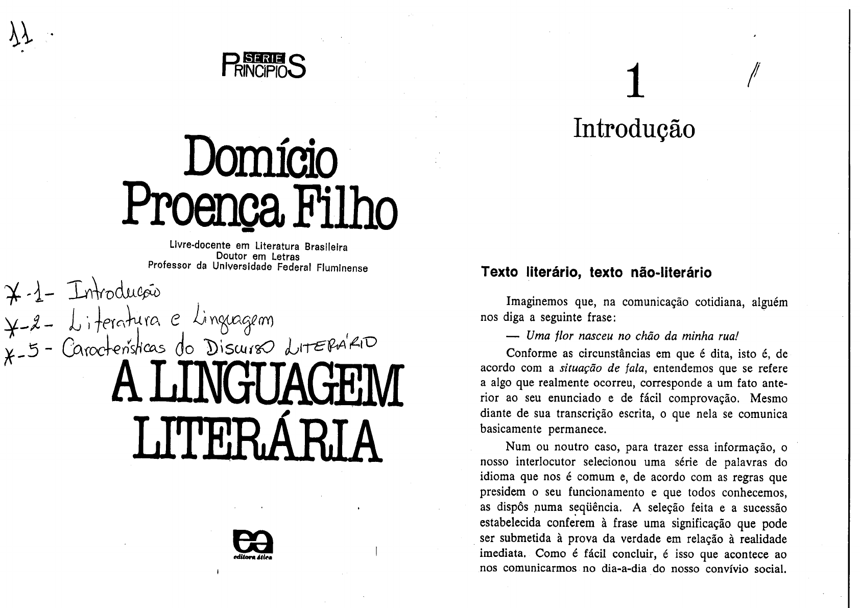 <p>S 1 Introdução Domício Proença Filho Livre-docente em Literatura Brasileira Doutor em Letras Professor da Universidade Federal Fluminense Texto literário, texto não-literário Imaginemos que, na comunicação cotidiana, alguém Literatura e nos diga a seguinte frase: - do Discurso LITERARIO - Uma flor nasceu no chão da minha rua! Conforme as circunstâncias em que é dita, isto é, de ALINGUAGEM acordo com a situação de fala, entendemos que se refere a algo que realmente ocorreu, corresponde a um fato ante- rior ao seu enunciado e de fácil comprovação. Mesmo diante de sua transcrição escrita, o que nela se comunica LITERÁRIA basicamente permanece. Num ou noutro caso, para trazer essa informação, o nosso interlocutor selecionou uma série de palavras do idioma que nos é comum e, de acordo com as regras que presidem o seu funcionamento e que todos conhecemos, as dispôs numa A seleção feita e a sucessão estabelecida conferem à frase uma significação que pode ser submetida à prova da verdade em relação à realidade imediata. Como é fácil concluir, é isso que acontece ao nos comunicarmos no dia-a-dia do nosso convívio social.</p><p>6 7 Retomemos a nossa frase inicial, agora ligeiramente a existir em função do conjunto em que a palavra se en- modificada e combinada com outros elementos: contra. É claro que os versos remetem a uma realidade Uma flor nasceu na rual dos homens e do mundo, mas muito mais profunda do que Passem de longe, bondes, ônibus, rios de aço do tráfego. a realidade imediatamente perceptível e traduzida no dis- Uma flor ainda desbotada curso comum das pessoas. É o que acontece com essa ilude a polícia, rompe o asfalto. modalidade de linguagem, a linguagem da literatura, tanto Façam completo silêncio, paralisem os negócios, na prosa, como nas manifestações em verso. garanto que uma flor nasceu. Na prosa, por exemplo, podemos encontrar a palavra flor em outro contexto e com outro sentido, que Sua cor não se percebe. lhe é conferido exatamente por essa nova circunstância: Suas pétalas não se abrem. trata-se do romance Memórias póstumas de Brás Cubas, Seu nome não está nos livros. onde o termo aparece numa afirmação vinculada a um É feia. Mas é realmente uma flor. famoso personagem criado pelo escritor: "Uma flor, o Percebemos, desde logo, que estamos diante de uma Quincas Borba". utilização especial da língua que falamos. O ritmo que Aí está um conteúdo inteiramente distinto do que se caracteriza o texto, a natureza do que se comunica e, ao configura no poema drummondiano e que só pode ser per- chegar até nós por escrito, a distribuição das palavras no cebido plenamente, na força de sua causticante ironia, espaço do papel, justificam essa conclusão. A nossa frase- quando a frase é considerada'na totalidade do romance -exemplo depende também, como ato lingüístico que é, da de que faz parte. É possível perceber a estreita relação gesticulação e da entoação que a acompanharem ao ser entre a dimensão e a dimensão literária que en- enunciada; por força, entretanto, de sua situação nesse con- volve a significação das palavras quando estas integram o junto e da associação com as demais afirmações que a ela sistema semiótico que é o texto literário. se vinculam, abre-se para um sentido múltiplo, ganha mar- Os três exemplos que acabamos de examinar permi- cas de no contexto do fragmento transcrito tem algumas conclusões: e da totalidade do poema de que faz parte "A flor e A fala ou discurso é, no uso cotidiano, um instru- a náusea", de Carlos Drummond de pode- mento da informação e da ação e não exige, no mais das mos entender essa flor como esperança de mudança, por vezes, atitude interpretativa. A significação das palavras, exemplo. Mas esse sentido que o texto a ela confere não reproduz nenhuma realidade imediata; nasce tão-somente nesse caso, tem por base o jogo de relações configuradoras do próprio texto. A flor dessa rua deixa de ser um ele- do idioma que falamos. mento vegetal para alçar-se à condição de símbolo, ganha A fala comum se caracteriza pela transparência. O uma significação que vai além do real concreto e que passa mesmo não acontece com o discurso literário. Este se en- contra a serviço da criação artística. O texto da litera- 1 A rosa do povo. In: Nova reunião: 19 livros de poesia. Rio tura é um objeto de linguagem ao qual se associa uma re- de Janeiro/Brasília, J. Olympio/INL, 1983. 1, p. presentação de realidades físicas, sociais e emocionais me-</p><p>8 9 diatizadas pelas palavras da língua na configuração de Vale recordar que o conceito de literatura não é ma- um objeto estético. texto repercute em nós na medida téria pacífica entre os estudiosos que a ela se dedicam. em que revele emoções profundas, coincidentes com as Mesmo neste último sentido, tem vivido variações signifi- que em nós se abriguem como seres sociais. O artista da cativas ao longo da história. Foge ao propósito deste vo- palavra, copartícipe da nossa humanidade, incorpora ele- lume rastrear tais perspectivas; indicam-se, entretanto, na mentos dessa dimensão que nos são culturalmente comuns. bibliografia do final do volume, algumas obras que podem Nosso entendimento do que nele se comunica passa a ser ser esclarecedoras a propósito do assunto. proporcional ao nosso repertório cultural, enquanto recep- Essa posição não impede, porém, que sejam assinala- tores e usuários de um saber comum. das duas concepções que a têm identificado com maior O discurso literário traz, em certa medida, a marca relevo no âmbito da cultura da opacidade: abre-se a um tipo específico de descodifi- Há os que entendem que a obra literária envolve cação ligado à capacidade e ao universo cultural do re- uma representação e uma visão do mundo, além de ceptor. uma tomada de posição diante dele. Tal posicionamento Já se percebe o alto índic