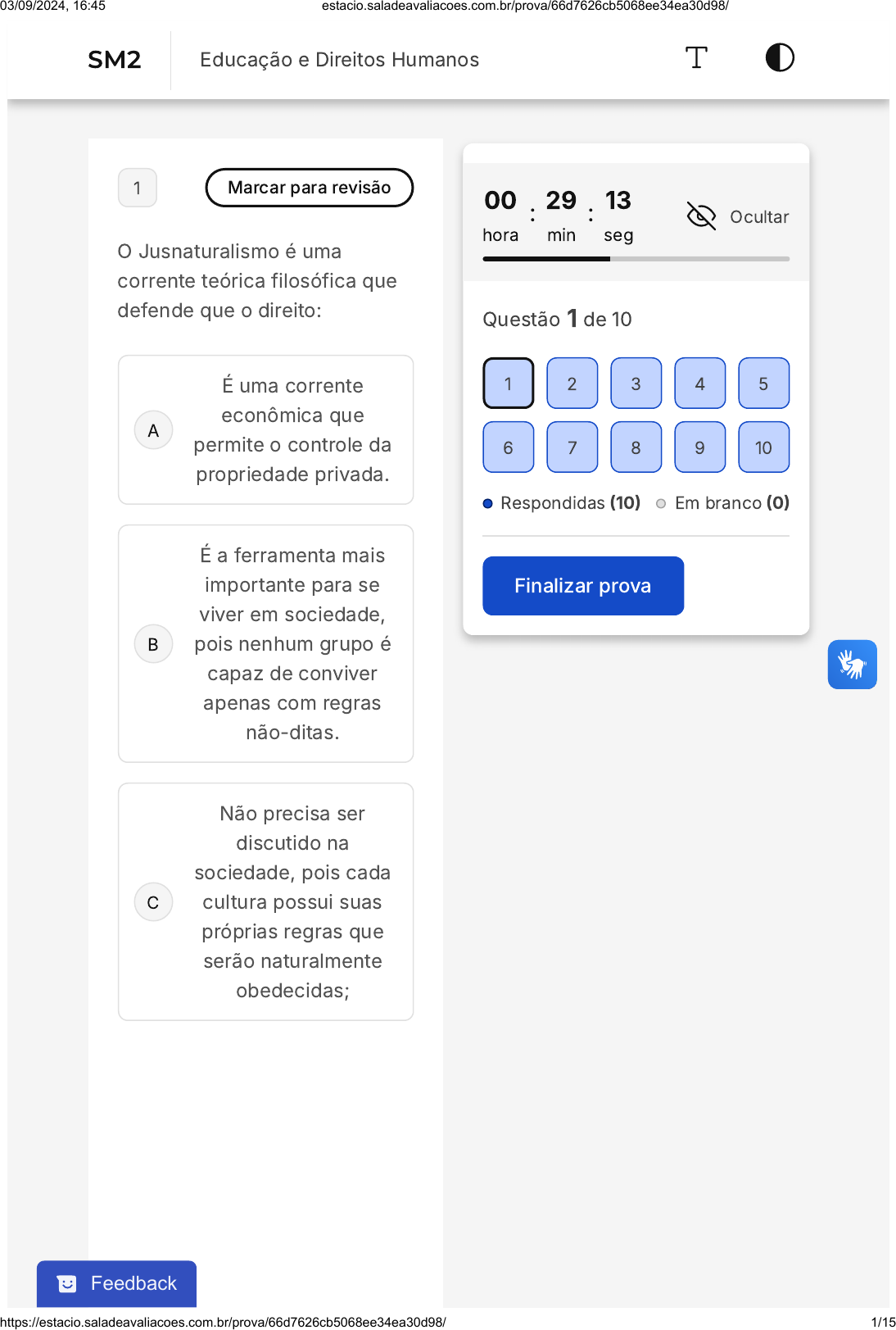 <p>A</p><p>B</p><p>C</p><p>1 Marcar para revisão</p><p>O Jusnaturalismo é uma</p><p>corrente teórica filosófica que</p><p>defende que o direito:</p><p>É uma corrente</p><p>econômica que</p><p>permite o controle da</p><p>propriedade privada.</p><p>É a ferramenta mais</p><p>importante para se</p><p>viver em sociedade,</p><p>pois nenhum grupo é</p><p>capaz de conviver</p><p>apenas com regras</p><p>não-ditas.</p><p>Não precisa ser</p><p>discutido na</p><p>sociedade, pois cada</p><p>cultura possui suas</p><p>próprias regras que</p><p>serão naturalmente</p><p>obedecidas;</p><p>00</p><p>hora</p><p>: 29</p><p>min</p><p>: 13</p><p>seg</p><p>Ocultar</p><p>Questão 1 de 10</p><p>Respondidas �10� Em branco �0�</p><p>Finalizar prova</p><p>1 2 3 4 5</p><p>6 7 8 9 10</p><p>Feedback</p><p>SM2 Educação e Direitos Humanos</p><p>03/09/2024, 16:45 estacio.saladeavaliacoes.com.br/prova/66d7626cb5068ee34ea30d98/</p><p>https://estacio.saladeavaliacoes.com.br/prova/66d7626cb5068ee34ea30d98/ 1/15</p><p>D</p><p>E</p><p>A</p><p>B</p><p>Só é válido a partir do</p><p>momento que a</p><p>sociedade clama por</p><p>ele, e ele se</p><p>transforma em leis</p><p>reconhecidas pelo</p><p>Estado;</p><p>É inerente ao ser</p><p>humano e que</p><p>algumas regras</p><p>sequer precisam ser</p><p>transformadas em leis</p><p>para valerem na</p><p>sociedade;</p><p>2 Marcar para revisão</p><p>Sobre a teoria das gerações</p><p>dos Direitos Humanos, é</p><p>correto afirmar que:</p><p>A quarta geração é a</p><p>última e procura</p><p>debater sobre direitos</p><p>ambientais, que são,</p><p>atualmente, a maior</p><p>preocupação do</p><p>mundo;</p><p>A primeira geração</p><p>dos Direitos Humanos</p><p>defendia o princípio</p><p>religioso como</p><p>fundamento da moral</p><p>humana.</p><p>03/09/2024, 16:45 estacio.saladeavaliacoes.com.br/prova/66d7626cb5068ee34ea30d98/</p><p>https://estacio.saladeavaliacoes.com.br/prova/66d7626cb5068ee34ea30d98/ 2/15</p><p>C</p><p>D</p><p>E</p><p>A terceira geração</p><p>corresponde aos</p><p>direitos sobre</p><p>indivíduos e busca a</p><p>garantia da</p><p>propriedade privada e</p><p>dos investimentos</p><p>financeiros;</p><p>A segunda geração</p><p>reafirmou as ideias da</p><p>primeira geração e</p><p>procurou construir a</p><p>ideia de igualdade</p><p>entre todos os seres</p><p>humanos;</p><p>A primeira geração</p><p>corresponde ao</p><p>momento em que os</p><p>Direitos Humanos</p><p>surgiram como um</p><p>contraponto aos</p><p>direitos naturais;</p><p>3 Marcar para revisão</p><p>Sobre a história dos Direitos</p><p>Humanos, é possível afirmar</p><p>que:</p><p>03/09/2024, 16:45 estacio.saladeavaliacoes.com.br/prova/66d7626cb5068ee34ea30d98/</p><p>https://estacio.saladeavaliacoes.com.br/prova/66d7626cb5068ee34ea30d98/ 3/15</p><p>A</p><p>B</p><p>C</p><p>Pouco conhecemos</p><p>sobre os antigos</p><p>Direitos Humanos,</p><p>pois as primeiras</p><p>sociedades que</p><p>discutiram o assunto</p><p>não deixaram</p><p>registros escritos</p><p>sobre isso;</p><p>O Iluminismo foi um</p><p>movimento</p><p>fundamental para</p><p>iniciar a confecção</p><p>das primeiras</p><p>declarações, pois já</p><p>defendiam conceitos</p><p>como a liberdade e a</p><p>igualdade.</p><p>Ele é uma invenção do</p><p>pós-Guerra Mundial</p><p>como resultado das</p><p>atrocidades nazistas.</p><p>03/09/2024, 16:45 estacio.saladeavaliacoes.com.br/prova/66d7626cb5068ee34ea30d98/</p><p>https://estacio.saladeavaliacoes.com.br/prova/66d7626cb5068ee34ea30d98/ 4/15</p><p>D</p><p>E</p><p>Não é possível falar</p><p>sobre uma história</p><p>dos Direitos Humanos,</p><p>pois, até a criação das</p><p>Nações Unidas, não</p><p>havia uma</p><p>preocupação sobre o</p><p>assunto;</p><p>A discussão sobre</p><p>Direitos Humanos vem</p><p>desde a Antiguidade,</p><p>quando os gregos se</p><p>reuniam nos templos</p><p>religiosos para</p><p>discutir os direitos dos</p><p>cidadãos;</p><p>4 Marcar para revisão</p><p>Sobre a composição dos</p><p>Direitos Universais das Nações</p><p>Unidas, é correto afirmar:</p><p>03/09/2024, 16:45 estacio.saladeavaliacoes.com.br/prova/66d7626cb5068ee34ea30d98/</p><p>https://estacio.saladeavaliacoes.com.br/prova/66d7626cb5068ee34ea30d98/ 5/15</p><p>A</p><p>B</p><p>C</p><p>D</p><p>E</p><p>A primeira fase foi a</p><p>de debates, que</p><p>aconteceu</p><p>simultaneamente com</p><p>a Segunda Guerra</p><p>Mundial;</p><p>A quarta fase dos</p><p>Direitos Humanos</p><p>corresponde à</p><p>formação dos</p><p>Sistemas</p><p>Internacionais de</p><p>proteção aos Direitos</p><p>Humanos.</p><p>A segunda fase</p><p>corresponde à criação</p><p>da Declaração</p><p>assinada por todos os</p><p>países envolvidos na</p><p>Segunda Guerra</p><p>Mundial;</p><p>As declarações dos</p><p>direitos universais são</p><p>falsas, afinal os países</p><p>optam por seguir ou</p><p>não.</p><p>A terceira fase está</p><p>acontecendo no</p><p>século XXI e</p><p>corresponde à</p><p>observação e aos</p><p>esforços de acesso</p><p>aos Direitos</p><p>Humanos;</p><p>03/09/2024, 16:45 estacio.saladeavaliacoes.com.br/prova/66d7626cb5068ee34ea30d98/</p><p>https://estacio.saladeavaliacoes.com.br/prova/66d7626cb5068ee34ea30d98/ 6/15</p><p>A</p><p>B</p><p>C</p><p>D</p><p>E</p><p>5 Marcar para revisão</p><p>Considere as afirmativas a</p><p>seguir:</p><p>I � A cidadania global</p><p>corresponde ao entendimento</p><p>de que o cidadão pertence a</p><p>uma comunidade mais ampla,</p><p>além das fronteiras nacionais,</p><p>enfatizando a nossa</p><p>humanidade comum.</p><p>II � A Unesco entende que o</p><p>cidadão global é o conjunto de</p><p>indivíduos que pensa e age</p><p>para um mundo mais justo,</p><p>pacífico e sustentável.</p><p>III � As tecnologias digitais e a</p><p>interconectividade que dela</p><p>resulta permitem articular o</p><p>local e o global, contribuindo</p><p>para a cidadania global.</p><p>É correto o que se afirma em:</p><p>I, apenas.</p><p>II, apenas.</