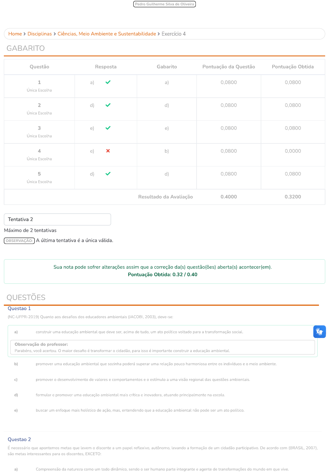 <p>Pedro Guilherme Silva de Oliveira Home > Disciplinas > Ciências, Meio Ambiente e Sustentabilidade > Exercício 4 GABARITO Questão Resposta Gabarito Pontuação da Questão Pontuação Obtida 1 a) a) 0,0800 0,0800 Única Escolha 2 d) d) 0,0800 0,0800 Única Escolha 3 e) e) 0,0800 0,0800 Única Escolha 4 e) b) 0,0800 0,0000 Única Escolha 5 d) d) 0,0800 0,0800 Única Escolha Resultado da Avaliação 0.4000 0.3200 Tentativa 2 Máximo de 2 tentativas OBSERVAÇÃO: A última tentativa é a única válida. Sua nota pode sofrer alterações assim que a correção da(s) questão(ões) aberta(s) acontecer(em). Pontuação Obtida: 0.32 / 0.40 QUESTÕES Questao 1 (NC-UFPR-2019) Quanto aos desafios dos educadores ambientais (JACOBI, 2003), deve-se: a) construir uma educação ambiental que deve ser, acima de tudo, um ato político voltado para a transformação social. Observação do professor: você acertou. maior desafio é transformar cidadão, para isso é importante construir a educação b) promover uma educação ambiental que sozinha poderá superar uma relação pouco harmoniosa entre os indivíduos e o meio c) promover desenvolvimento de valores e comportamentos e o estímulo a uma visão regional das questões d) formular e promover uma educação ambiental mais crítica e inovadora, atuando principalmente na escola. e) buscar um enfoque mais holístico de ação, mas, entendendo que a educação ambiental não pode ser um ato político. Questao 2 É necessário que apontemos metas que levem o discente a um papel reflexivo, autônomo, levando a formação de um cidadão participativo. De acordo com (BRASIL, 2007), são metas interessantes para os discentes, EXCETO: a) Compreensão da natureza como um todo dinâmico, sendo ser humano parte integrante e agente de transformações do mundo em que vive.</p><p>Pedro Guilherme Silva de Oliveira b) Compreensão da saúde como bem individual e comum. que deve ser promovido pela ação coletiva. c) Formulação de questões para diagnosticar e propor soluções para problemas reais, a partir de elementos das Ciências Naturais, colocando em prática conceitos, atitudes e procedimentos desenvolvidos no aprendizado escolar. d) Colocar um alvo e persegui-lo sempre, mesmo que para isso, ele deva se distanciar, em algum momento, das vivências positivas e benéficas aprendidas com o educador Observação do professor: Parabéns, você acertou. Neste caso, distanciar não é uma boa opção, pois as vivências positivas podem auxiliar na educação ambiental, neste caso, seria melhor uma aproximação cada vez mais constante. e) Compreensão da tecnologia como meio para suprir necessidades humanas, distinguindo usos corretos e necessários daqueles prejudiciais ao equilíbrio da natureza e ao Questao 3 Dentro das novas metodologias que estão disponíveis, podemos explicitar algumas que vão de encontro e podem ser aplicadas ao ensino de ciências. Analise as opções abaixo e indique a opção FALSA. a) O ensino híbrido busca combinar práticas pedagógicas do ensino presencial e do ensino a distância, com o objetivo de melhorar desempenho dos alunos em ambos os ensinos. b) PBL é a aprendizagem baseada em problema. É uma abordagem pedagógica que utiliza problemas do mundo real e estudos de casos hipotéticos. c) Flipped classroom é típico ensino com professor em sala e os elementos da tarefa de casa são invertidos, ou seja, vídeos curtos sobre a aula são vistos em casa, antes da aula presencial, enquanto que tempo em sala de aula é dedicado para a realização de exercícios, projetos e d) conceito do ensino adaptado é amplo e comporta toda a gama de métodos. técnicas e tecnologias que oferecem um ensino personalizado aos alunos. e) modelo híbrido é idêntico ao Flipped seu diferencial é combinar ferramentas iguais otimizadas para uma melhor aprendizagem dos alunos. Observação do professor: você acertou! Esse é um modelo híbrido, ou seja, ele está alicerçado em pilares teóricos e práticos, presencial e a distância. Questao 4 A ciência ocorre pela junção entre teorias, leis, modelos e interpretações que visam a busca pela realidade, de forma contínua e ampla, esse processo resulta em novas metodologias. Dentre essas novas metodologias, podemos inferir pela figura abaixo que: intelectual está no centro do processo de aprendizagem. gerencial e comunicacional Disponível Acesso em: 08 set. 2019. a) O Discente, conjuntamente como Docente passa por todo processo de aprendizagem como um influenciar, ele está no âmago do processo, sendo capaz de liderar seu raciocínio, suas convicções de certo e errado, sua forma de expressar, seja em palavras ou não, centrado nas emoções. b) Discente passa por todo processo de aprendizagem como um influenciador, ele está no âmago do processo, sendo capaz de liderar seu raciocínio, suas convicções de certo e errado, sua forma de expressar, seja em palavras ou não, centrado nas</p><p>Pedro Guilherme Silva de Oliveira incertezas, ficando em dúvida quanto ao certo e errado, sua forma de expressar, seja em palavras ou não, centrado nas d) Docente passa por todo processo de aprendizagem como um influenciar, ele está no âmago do processo, sendo capaz de liderar seu suas de certo e errado, sua forma de expressar, seja em palavras ou não, centrado nas emoções e) Discente passa por todo processo de aprendizagem como um ser passivo, no entanto, ele está no âmago do processo, sendo capaz de liderar seu raciocínio, suas de certo e errado, sua forma de expressar, seja em palavras ou não, centrado nas Observação do professor: Que pena, você errou! Questao 5 Quando tratamos de educadores ambientais, cabe ressaltar a importância de se desenvolver hábitos e práticas sociais, que levam a uma formação construindo uma Educação Ambiental forte e Existem quatro correntes da educação ambiental que levam a reflexões importantes para o educador ambiental, que são: a) Quest