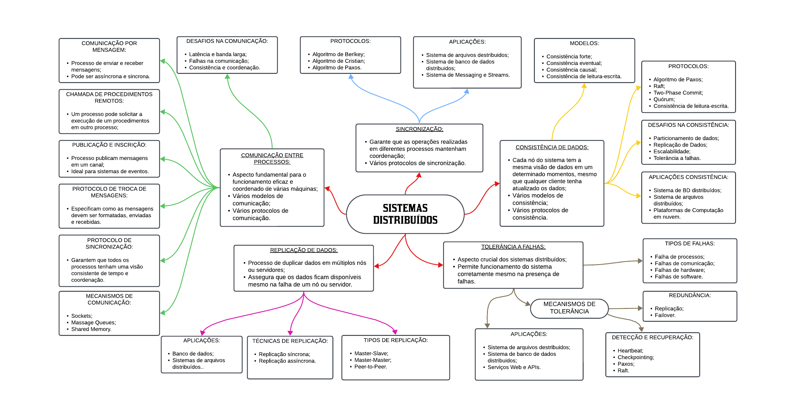 <p>SISTEMAS</p><p>DISTRIBUÍDOS</p><p>COMUNICAÇÃO ENTRE</p><p>PROCESSOS:</p><p>- Aspecto fundamental para o</p><p>funcionamento eficaz e</p><p>coordenado de várias máquinas;</p><p>- Vários modelos de</p><p>comunicação;</p><p>- Vários protocolos de</p><p>comunicação.</p><p>COMUNICAÇÃO POR</p><p>MENSAGEM:</p><p>- Processo de enviar e receber</p><p>mensagens;</p><p>- Pode ser assíncrona e sincrona.</p><p>CHAMADA DE PROCEDIMENTOS</p><p>REMOTOS:</p><p>- Um processo pode solicitar a</p><p>execução de um procedimentos</p><p>em outro processo;</p><p>PUBLICAÇÃO E INSCRIÇÃO:</p><p>- Processo publicam mensagens</p><p>em um canal;</p><p>- Ideal para sistemas de eventos.</p><p>PROTOCOLO DE TROCA DE</p><p>MENSAGENS:</p><p>- Especificam como as mensagens</p><p>devem ser formatadas, enviadas</p><p>e recebidas.</p><p>PROTOCOLO DE</p><p>SINCRONIZAÇÃO:</p><p>- Garantem que todos os</p><p>processos tenham uma visão</p><p>consistente de tempo e</p><p>coordenação.</p><p>DESAFIOS NA COMUNICAÇÃO:</p><p>- Latência e banda larga;</p><p>- Falhas na comunicação;</p><p>- Consistência e coordenação.</p><p>MECANISMOS DE</p><p>COMUNICAÇÃO:</p><p>- Sockets;</p><p>- Massage Queues;</p><p>- Shared Memory.</p><p>SINCRONIZAÇÃO:</p><p>- Garante que as operações realizadas</p><p>em diferentes processos mantenham</p><p>coordenação;</p><p>- Vários protocolos de sincronização.</p><p>PROTOCOLOS:</p><p>- Algoritmo de Berlkey;</p><p>- Algoritmo de Cristian;</p><p>- Algoritmo de Paxos.</p><p>APLICAÇÕES:</p><p>- Sistema de arquivos destribuidos;</p><p>- Sistema de banco de dados</p><p>distribuidos;</p><p>- Sistema de Messaging e Streams.</p><p>CONSISTÊNCIA DE DADOS:</p><p>- Cada nó do sistema tem a</p><p>mesma visão de dados em um</p><p>determinado momentos, mesmo</p><p>que qualquer cliente tenha</p><p>atualizado os dados;</p><p>- Vários modelos de</p><p>consistência;</p><p>- Vários protocolos de</p><p>consistência.</p><p>MODELOS:</p><p>- Consistência forte;</p><p>- Consistência eventual;</p><p>- Consistência causal;</p><p>- Consistência de leitura-escrita.</p><p>PROTOCOLOS:</p><p>- Algoritmo de Paxos;</p><p>- Raft;</p><p>- Two-Phase Commit;</p><p>- Quórum;</p><p>- Consistência de leitura-escrita.</p><p>DESAFIOS NA CONSISTÊNCIA:</p><p>- Particionamento de dados;</p><p>- Replicação de Dados;</p><p>- Escalabilidade;</p><p>- Tolerância a falhas.</p><p>APLICAÇÕES CONSISTÊNCIA:</p><p>- Sistema de BD distribuídos;</p><p>- Sistema de arquivos</p><p>distribuídos;</p><p>- Plataformas de Computação</p><p>em nuvem.</p><p>TOLERÂNCIA A FALHAS:</p><p>- Aspecto crucial dos sistemas distribuídos;</p><p>- Permite funcionamento do sistema</p><p>corretamente mesmo na presença de</p><p>falhas.</p><p>TIPOS DE FALHAS:</p><p>- Falha de processos;</p><p>- Falhas de comunicação;</p><p>- Falhas de hardware;</p><p>- Falhas de software.</p><p>MECANISMOS DE</p><p>TOLERÂNCIA</p><p>REDUNDÂNCIA:</p><p>- Replicação;</p><p>- Failover.</p><p>DETECÇÃO E RECUPERAÇÃO:</p><p>- Heartbeat;</p><p>- Checkpointing;</p><p>- Paxos;</p><p>- Raft.</p><p>APLICAÇÕES:</p><p>- Sistema de arquivos destribuidos;</p><p>- Sistema de banco de dados</p><p>distribuidos;</p><p>- Serviços Web e APIs.</p><p>REPLICAÇÃO DE DADOS:</p><p>- Processo de duplicar dados em múltiplos nós</p><p>ou servidores;</p><p>- Assegura que os dados ficam disponíveis</p><p>mesmo na falha de um nó ou servidor.</p><p>TIPOS DE REPLICAÇÃO:</p><p>- Master-Slave;</p><p>- Master-Master;</p><p>- Peer-to-Peer.</p><p>TÉCNICAS DE REPLICAÇÃO:</p><p>- Replicação síncrona;</p><p>- Replicação assíncrona.</p><p>APLICAÇÕES:</p><p>- Banco de dados;</p><p>- Sistemas de arquivos</p><p>distribuídos..</p><p>Novo mural</p><p>Page 1</p>