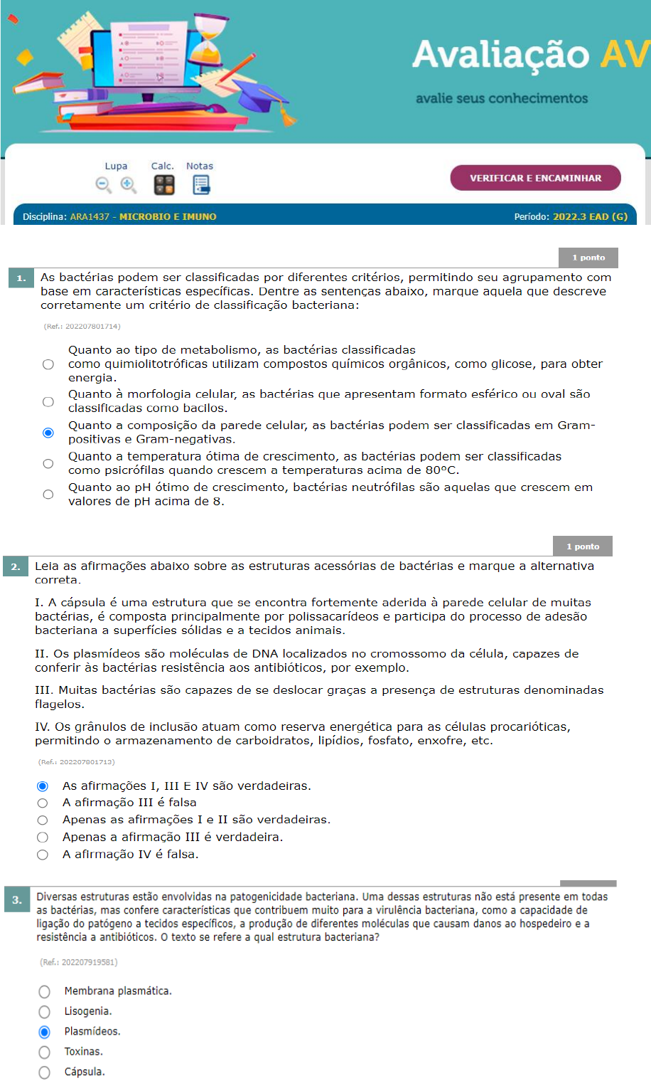 <p>Avaliação AV avalie seus conhecimentos Lupa Calc. Notas VERIFICAR E ENCAMINHAR Disciplina: ARA1437 - MICROBIO E IMUNO Período: 2022.3 EAD (G) 1 ponto 1. As bactérias podem ser classificadas por diferentes critérios, permitindo seu agrupamento com base em características específicas. Dentre as sentenças abaixo, marque aquela que descreve corretamente um critério de classificação bacteriana: (Ref.: 202207801714) Quanto ao tipo de metabolismo, as bactérias classificadas como quimiolitotróficas utilizam compostos químicos orgânicos, como glicose, para obter energia. Quanto à morfologia celular, as bactérias que apresentam formato esférico ou oval são classificadas como bacilos. Quanto a composição da parede celular, as bactérias podem ser classificadas em Gram- positivas e Gram-negativas. Quanto a temperatura ótima de crescimento, as bactérias podem ser classificadas como psicrófilas quando crescem a temperaturas acima de 80°C. Quanto ao pH ótimo de crescimento, bactérias neutrófilas são aquelas que crescem em valores de pH acima de 8. 1 ponto 2. Leia as afirmações abaixo sobre as estruturas acessórias de bactérias e marque a alternativa correta. I. A cápsula é uma estrutura que se encontra fortemente aderida à parede celular de muitas bactérias, é composta principalmente por polissacarídeos e participa do processo de adesão bacteriana a superfícies sólidas e a tecidos animais. II. Os plasmídeos são moléculas de DNA localizados no cromossomo da célula, capazes de às bactérias resistência aos antibióticos, por exemplo. III. Muitas bactérias são capazes de se deslocar graças a presença de estruturas denominadas flagelos. IV. Os grânulos de inclusão atuam como reserva energética para as células procarióticas, permitindo armazenamento de carboidratos, lipídios, fosfato, enxofre, etc. (Ref. 202207801713) As afirmações I, III E IV são verdadeiras. A afirmação III é falsa Apenas as afirmações I e II são verdadeiras. Apenas a afirmação III é verdadeira. A afirmação IV é falsa. 3. Diversas estruturas estão envolvidas na patogenicidade bacteriana. Uma dessas estruturas não está presente em todas as bactérias, mas confere características que contribuem muito para a virulência bacteriana, como a capacidade de ligação do patógeno a tecidos específicos, a produção de diferentes moléculas que causam danos ao hospedeiro e a resistência a antibióticos. o texto se refere a qual estrutura bacteriana? (Ref.: 202207919581) Membrana plasmática. Lisogenia. Toxinas. Cápsula.</p><p>4. Com base na figura abaixo, que representa crescimento microbiano em função da disponibilidade de oxigênio, assinale a opção correta. 1 2 3 4 Fonte da figura: própria autora. (Ref.: 202207922555) No tubo 3, observa-se o crescimento de microrganismos anaeróbios e aeróbios. No tubo 1, observa-se o crescimento de microrganismos facultativos. No tubo 2, observa-se o crescimento de microrganismos microaerófilos. No tubo 3, observa-se o crescimento de microrganismos microaerófilos. No tubo 4, observa-se o crescimento de microrganismos anaeróbios. 5. Os receptores de antígenos possuem funções muito importantes para a resposta imunológica. Assinale a alternativa correta sobre essas estruturas. (Ref.: 202207829567) Nos receptores antigênicos, existem regiões que estão relacionadas com o reconhecimento do antígeno e outras regiões com a integridade estrutural do receptor. As moléculas acessórias são responsáveis pela diminuição da adesão entre o linfócito T e a APC, de maneira que essas células se desassociem após o reconhecimento. Os receptores de células T realizam uma ligação inicial com o complexo de extrema afinidade. Os receptores antigênico das células T são capazes de reconhecer uma variedade muito de estruturas químicas que os receptores presentes nas células B. Os receptores das células B, que são formados por anticorpos, reconhecem somente apresentados pelo MHC. 6. Assinale a alternativa com a definição correta sobre as respostas imunológicas anormais: (Ref.: Na imunodeficiência, o corpo desencadeia uma resposta excessiva a antígenos que pode lesar tecidos normais. A resposta imunológica anormal ativa e mobiliza componentes do sistema de defesa contra um antígeno infeccioso. Artrite reumatoide, tireoidite de hashimoto e lúpus eritematoso sistêmico são exemplos de doenças decorrentes de imunodeficiência. Indivíduos com imunodeficiência são mais suscetíveis a infecções, no entanto apresentam respostas imunológicas eficientes para combatê-las. A doença autoimune se desenvolve por uma resposta imunológica anormal, em que o organismo reconhece o próprio corpo como estranho.</p><p>7. Leia as afirmativas abaixo relacionadas a soroterapia e assinale a alternativa correta. I. A soroterapia é definida pela administração de soro com anticorpos já prontos para o tratamento de variadas doenças. II. A soroterapia é responsável pela indução da imunidade ativa. III. É caracterizada por baixos custos e poucos efeitos colaterais, porém a resposta é lenta. IV. A soroterapia é muito indicada nos casos em que o indivíduo possui deficiência de linfócitos T. (Ref.: As afirmativas I e IV estão corretas. As afirmativas I, II e III estão corretas. Somente a afirmativa I está correta. As afirmativas II e III estão corretas. As afirmativas I e II estão corretas. 1 ponto 8. "A síndrome de hemofagocítica (HLH) caracteriza-se por um processo inflamatório sistêmico com ativação, proliferação e infiltração excessiva de macrófagos e linfócitos para diversos órgãos, é associada à produção elevada e sustentada de citocinas pró- inflamatórias. Uma característica tardia, mas marcante destes distúrbios é a ingestão dos eritrócitos por macrófagos ativados (hemofagocitose). Além disso, a secreção de perforinas e granzimas é defeituosa. As mutações no gene da perforina