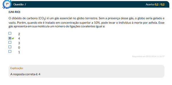 <p>Questão / (UNI-RIO) O de carbono (CO2) é um gás essencial no globo terrestre. Sem a presença desse gás, globo seria gelado e vazio. quando ele é inalado em concentração superior a 10% pode levar à morte por asfixia Esse gás apresenta em sua molecula um numero de ligações covalentes igual a: 2 4 3 0 1 Respondido em 28/02/2024 11:16:57 Explicação: A resposta correta é: 4</p>
