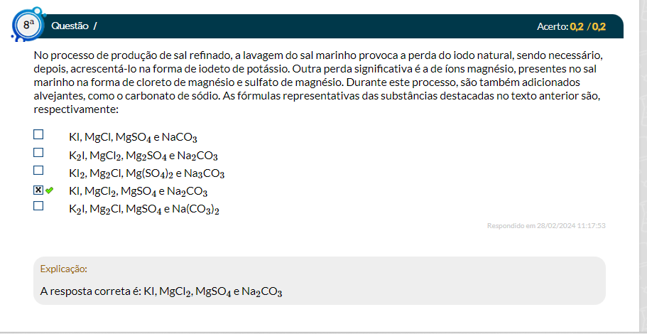 <p>Questão / Acerto: 0,2 / 0.2 No processo de produção de sal refinado, a lavagem do sal marinho provoca a perda do iodo sendo necessário, depois, acrescentá-lo na forma de de Outra perda significativa é a de magnésio, presentes no sal marinho na forma de cloreto de magnésio e sulfato de magnésio. Durante este processo, são também adicionados alvejantes, como carbonato de sódio. As fórmulas representativas das substâncias destacadas no texto anterior são, respectivamente: KI, MgCl, MgSO4 e MgCl2, Mg2SO4 e Na2CO3 Mg2Cl, e KI, MgSO4 e MgSO4 e Respondido em 28/02/2024 11:17:53 Explicação: A resposta correta é: KI, MgSO4 e</p>