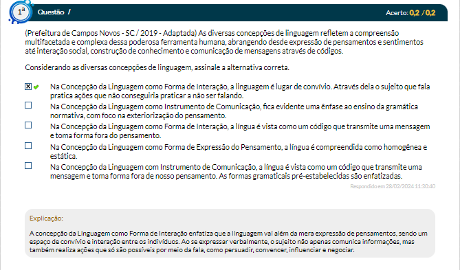 <p>Questão / Acerto: (Prefeitura de Campos Novos - SC / 2019 - Adaptada) As diversas concepções de linguagem refletem a compreensão multifacetada e complexa dessa poderosa ferramenta humana, abrangendo desde expressão de pensamentos e sentimentos até interação social, construção de conhecimento e comunicação de mensagens através de códigos. Considerando as diversas concepções de assinale a alternativa correta Na Concepção da Linguagem como Forma de a linguagem é lugar de Através dela sujeito que fala pratica ações que não conseguiria praticar a não ser Na Concepção da Linguagem como Instrumento de fica evidente uma ênfase ao ensino da com foco na exteriorização do pensamento. Na Concepção da Linguagem como Forma de a língua é vista como um código que transmite uma mensagem e toma forma fora do Na Concepção da Linguagem como Forma de Expressão do Pensamento, a língua é compreendida como homogênea e Na Concepção da Linguagem com Instrumento de a língua é vista como um código que transmite uma mensagem e toma forma fora de nosso pensamento. As formas gramaticais pré-estabelecidas são Respondido em Explicação: A concepção da Linguagem como Forma de Interação enfatiza que a linguagem vai além da mera expressão de pensamentos, sendo um espaço de convívio e interação entre os Ao se expressar verbalmente, sujeito não apenas comunica mas também realiza ações que só são possíveis por meio da fala, como persuadir, convencer, influenciar e negociar.</p>
