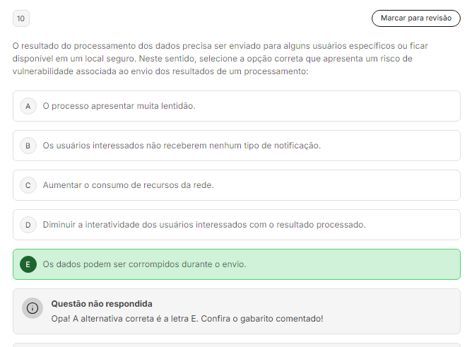 <p>10 Marcar para revisão O resultado do processamento dos dados precisa ser enviado para alguns usuários específicos ou ficar disponível em um local seguro. Neste sentido, selecione a opção correta que apresenta um risco de vulnerabilidade associada ao envio dos resultados de um processamento: A O processo apresentar muita B Os usuários interessados não receberem nenhum tipo de notificação. C Aumentar consumo de recursos da rede. D Diminuir a interatividade dos usuários interessados com O resultado processado. E Os dados podem ser corrompidos durante envio. Questão não respondida Opa! A alternativa correta é a letra E. Confira gabarito comentado!</p>