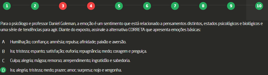 <p>1 2 3 4 5 6 7 8 10 Para psicólogo e professor Daniel Goleman, a emoção é um sentimento que está relacionado a pensamentos distintos, estados psicológicos e biológicos e uma série de tendências para agir. Diante do exposto, assinale a alternativa CORRETA que apresenta emoções básicas: A Humilhação; confiança; amnésia; repulsa; afinidade; paixão e aversão. B Ira: tristeza; espanto; euforia; medo; coragem e preguiça. Culpa; alegria; mágoa; remorso; ingratidão e sabedoria. D alegria; tristeza; medo; prazer; amor, surpresa; nojo e vergonha.</p>
