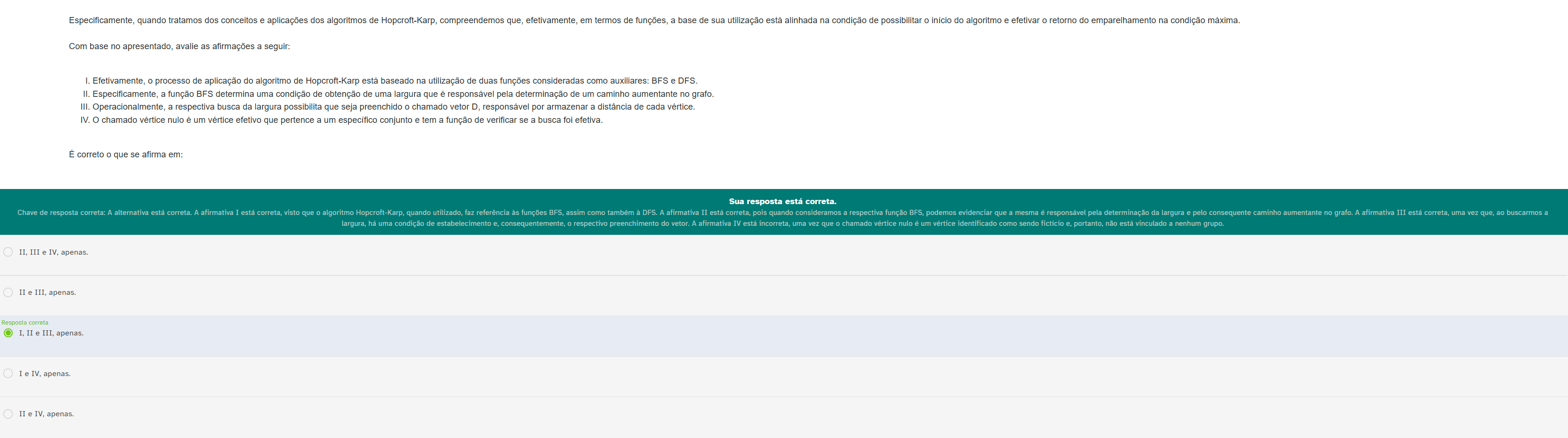 <p>Especificamente, quando tratamos dos conceitos e aplicações dos algoritmos de Hopcroft-Karp, compreendemos que, efetivamente, em termos de funções, a base de sua utilização está alinhada na condição de possibilitar o início do algoritmo e efetivar retorno do emparelhamento na condição Com base no apresentado, avalie as afirmações a seguir: I. Efetivamente, processo de aplicação do algoritmo de Hopcroft-Karp está baseado na utilização de duas funções consideradas como auxiliares: BFS e II. Especificamente, a função BFS determina uma condição de obtenção de uma largura que é responsável pela determinação de um caminho aumentante no grafo. III. Operacionalmente, a respectiva busca da largura possibilita que seja preenchido o chamado vetor D. responsável por armazenar a distância de cada vértice. IV. o chamado vértice nulo é um vértice efetivo que pertence a um específico conjunto tem função de verificar se a busca foi efetiva. É correto que se afirma em: Sua resposta está correta. Chave de resposta correta A alternativa está correta A afirmativa está correta, visto que algoritmo Hopcroft-Karp, quando utilizado. faz referência às funções BFS, assim como também DFS A afirmativa II está correta pois quando consideramos respectiva função BFS, podemos evidenciar que mesma responsável pela determinação da largura pelo consequente caminho aumentante no A afirmativa III está correta, uma vez que, ao buscarmos a largura, há uma condição de estabelecimento e consequentemente, respectivo preenchimento do vetor A afirmativa IV está incorreta, uma vez que chamado vértice nulo um identificado como sendo portanto, não está vinculado nenhum grupo II. III IV. II III. apenas Resposta correta I. III. IV. IV.</p>