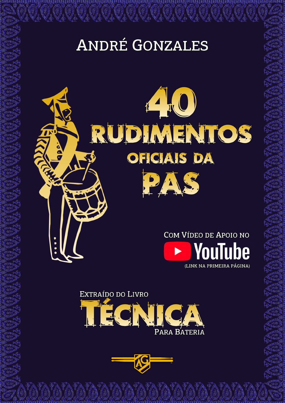 <p>2</p><p>Olá, baterista.</p><p>Eis o PDF com os 40 Rudimentos Oficiais da Percussive Arts Society por mim</p><p>explicados.</p><p>O conteúdo aqui disponibilizado faz parte de meu livro TÉCNICA, com 129 páginas</p><p>reunindo todo o conhecimento que reuní acerca do tema.</p><p>Este livro, assim como todos os outros livros restantes da coleção BEAT, podem ser</p><p>adquiridos comigo tanto no formato impresso quanto no formato digital:</p><p>Por email andregonzales73@gmail.com</p><p>Pelo WhatsApp: (11) 98561-8855</p><p>Este PDF dos 40 Rudimentos é gratuito – um presente meu para você – e tem um vídeo</p><p>de apoio no YouTube para que você possa compreendê-los e praticá-los de uma maneira</p><p>completa e fácil.</p><p>Para acessar o vídeo, basta clicar:</p><p>https://youtu.be/xii_lwShtjE</p><p>Aproveite também e se inscreva no canal, lembrando também de clicar no sininho para</p><p>receber as notificações.</p><p>Ah, não deixe de visitar meu site, para saber mais sobre meus livros, trabalhos e</p><p>carreira, além de acessar mais vídeos e lições:</p><p>www.andregonzales.com</p><p>Grande abraço, e bons estudos!</p><p>André Gonzales</p><p>mailto:andregonzales73@gmail.com</p><p>https://youtu.be/xii_lwShtjE</p><p>http://www.andregonzales.com/</p><p>40 RUDIMENTOS</p><p>DA PERCUSSIVE ARTS SOCIETY</p><p>Rudimento, pela definição do dicionário, significa "primeiro princípio de qualquer</p><p>língua, arte ou ciência." Eles foram criados por percussionistas de caixa, mas através</p><p>dos anos os rudimentos evoluíram objetivando desenvolver a técnica e a uniformidade</p><p>de execução dos toques em qualquer instrumento de percussão tocado com baquetas.</p><p>Mas, como surgiram os rudimentos? Os suíços reivindicam a invenção dos rudimentos</p><p>por causa de um livro para pífano e tambor, escrito pelo Dr. Fritz Berger, intitulado Das</p><p>Basler Trommeln. Este livro, publicado em 1928, mostra em sua capa uma imagem de</p><p>um pífano e um tambor, datada de 1525. O principal objetivo do livro foi estabelecer</p><p>um padrão aos percussionistas deste tipo de conjunto, pois eles tinham que tocar em</p><p>uníssono. Isso vem de 400 anos atrás, época em que a notação musical como</p><p>conhecemos hoje não existia, e os percussionistas tocavam de memória. Para ilustrar, o</p><p>rulo longo era conhecido como “da-da-ma-ma” e começava com a mão esquerda, para o</p><p>desenvolvimento e fortalecimento da mão mais fraca (destros).</p><p>A notação para bateria apareceu também na Suíça por volta de 1620. O uso desta</p><p>notação se espalhou para outros países e foi sendo modificada de acordo com o tipo de</p><p>música local, passando a princípio pela França, Inglaterra e Escócia.</p><p>Os rudimentos começaram a ser usados nos EUA entre os séculos 16 e 17 pelos</p><p>regimentos ingleses e, infelizmente, não há registro da notação usada nesta época. O</p><p>primeiro livro a utilizar o termo rudimento para percussão, A New Useful and</p><p>Complete System of Drum Beating, foi escrito por Charles Stewart Ashworth e</p><p>lançado em 1812 nos EUA.</p><p>Entre o final do séc. 19 e início do séc. 20 ocorreram grandes mudanças na música e</p><p>também na percussão. Surgiram as bandas de baile, tambores suspensos em estantes,</p><p>pedais, ragtime, filmes mudos musicados ao vivo – uma infinidade de transformações.</p><p>A Washington Marine Band, conduzida pelo grande compositor de marchas militares</p><p>John Philip Sousa, se utilizou dos rudimentos existentes mais do que qualquer outro</p><p>neste período.</p><p>Uma necessidade da uniformização nos rudimentos levou à formação da NARD</p><p>(National Association Of Rudimental Drummers, ou Associação Nacional dos</p><p>Percussionistas Rudimentares). Foi então reunido, em 1932, um grupo de proeminentes</p><p>percussionistas para discutir o assunto e chegar a um sistema prático que todos</p><p>pudessem usar e que respeitasse os livros didáticos mais importantes, resultando num</p><p>total de 26 rudimentos. A NARD foi dissolvida em 1978 e reativada em 2008, mas hoje</p><p>em dia cabe à PAS (Percussive Arts Society, ou Sociedade das Artes Percussivas) a</p><p>tarefa de regular os rudimentos usados pelos percussionistas no mundo inteiro.</p><p>Hoje existem 40 rudimentos reconhecidos oficialmente pela PAS, divididos em 4</p><p>categorias: Rulos, Diddles, Flams e Drags. Estes rudimentos são a combinação dos 26</p><p>rudimentos americanos com alguns suíços e franceses. Vamos agora estudá-los,</p><p>seguindo tanto as manulações iniciadas com a direita quanto com a esquerda, e</p><p>observando atentamente as divisões e a aplicação da dinâmica.</p><p>3</p><p>RULOS</p><p>1) RULOS DE TOQUES SIMPLES (Single Stroke Roll Rudiments)</p><p>01 RULO SIMPLES</p><p>(SINGLE STROKE ROLL)</p><p>02 RULO SIMPLES DE 4 TOQUES</p><p>(SINGLE STROKE FOUR)</p><p>G</p><p>03 RULO SIMPLES DE 7 TOQUES</p><p>(SINGLE STROKE SEVEN)</p><p>.</p><p>_______________________________________________________________________________________________________</p><p>2) RULOS DE TOQUES MÚLTIPLOS (Multiple Bounce Roll Rudiments)</p><p>04 RULO TRIPLO ou TRÊS FRANCÊS</p><p>(TRIPLE STROKE ROLL)</p><p>05 RUFO ou RULO DE PRESSÃO</p><p>(BUZZ ou MULTIPLE BOUNCE ROLL)</p><p>.</p><p>_______________________________________________________________________________________________________</p><p>3) RULOS DE TOQUES DUPLOS (Double Stroke Open Roll Rudiments)</p><p>06 RULO DUPLO</p><p>(DOUBLE STROKE OPEN ROLL)</p><p>07 RULO DE 5 TOQUES</p><p>(5 STROKE ROLL)</p><p>.</p><p>08 RULO DE 6 TOQUES</p><p>(6 STROKE ROLL)</p><p>09 RULO DE 7 TOQUES</p><p>(7 STROKE ROLL)</p><p>.</p><p>4</p><p>5</p><p>10 RULO DE 9 TOQUES</p><p>(9 STROKE ROLL)</p><p>11 RULO DE 10 TOQUES</p><p>(10 STROKE ROLL)</p><p>.</p><p>12 RULO DE 11 TOQUES</p><p>(11 STROKE ROLL)</p><p>13 RULO DE 13 TOQUES</p><p>(13 STROKE ROLL)</p><p>.</p><p>14 RULO DE 15 TOQUES</p><