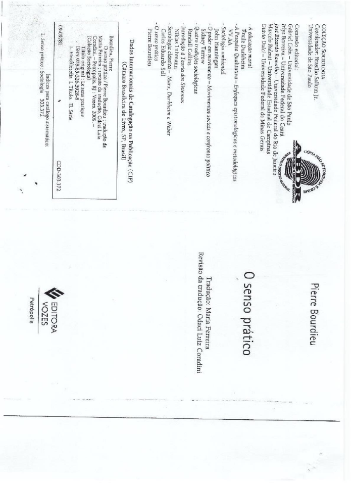<p>COLEÇÃO SOCIOLOGIA Brasílio Sallum Jr. Universidade de São Paulo AUTORIZADA Pierre Bourdieu Comissão editorial: Gabriel Cohn - Universidade de São Paulo Irlys Barreira - Universidade Federal do Ceará Ricardo Ramalho - Universidade Federal do Rio de Janeiro Marcelo Ridenti - Universidade Estadual de Campinas Otávio Dulci - Universidade Federal de Minas Gerais - A educação moral 0 senso prático Emile Durkheim - A Pesquisa Qualitativa - Enfoques epistemológicos e metodológicos VV.AA - Sociologia ambiental John Hanningan o poder em movimento - Movimentos sociais e confronto politico Tradução: Maria Ferreira Sidney Tarrow Revisão da tradução: Odaci Luiz Coradini - Quatro tradições sociológicas Randall Collins - Introdução Teoria dos Sistemas Niklas Luhmann Sociologia classica - Marx, Durkheim Weber Carlos Eduardo Sell - senso prático Pierre Bourdieu Dados Internacionais de Catalogação na Publicação (CIP) (Câmara Brasileira do Livro, SP, Brasil) Bourdieu, Pierre senso prático / Pierre Bourdieu : tradução de Maria Ferreira revisão da Odaci Luiz Coradini. - RJ : Vozes, 2009. - (Coleção Sociologia) original : Le sens pratique ISBN 1. Etnofilosofia II. 09-09781 CDD-303.372 EDITORA Índices para catálogo VOZES 1. Senso prático : Sociologia 303.372 Petrópolis</p><p>1980 by Les de Minuit Título original Le sens prazique Sumário Direitos de publicação em língua portuguesa Brasil: Editora Vozes Ltda. Rua Frei Luis, 100 25689-900 Petrópolis, RJ Internet: http://www.vozes.com.br Brasil Apresentação da coleção, 7 Todos os reservados. Nenhuma parte desta obra poderá ser 9 reproduzida ou transmitida por qualquer forma e/ou quaisquer meios ou mecânico, incluindo fotocópia e ou arquivada em Livro 1 Critica da razão teórica, 41 qualquer sistema ou banco de dados sem permissão escrita da Prólogo, 43 1 a 50 editorial Frei Antônio Moser 2 A antropologia imaginária do subjetivismo, 70 3 Estruturas, 86 Editores Ana Paula Santos Matos 4 A crença e o corpo, 108 Maria da Silva 5 A lógica da prática, 133 Peretti Marilac Loraine Oleniki 6 A ação do tempo, 164 Secretário executivo 7 o capital 187 João Batista Kreuch 8 Os modos de dominação, 203 9 A objetividade do subjetivo, 226 Editoração: Maria da Conceição B. de Sousa Projeto gráfico: AG.SR Gráfico Livro 2 Lógicas práticas, 239 Juliana Teresa Hannickel Prólogo, 241 1 A terra e as estratégias matrimoniais, 244 ISBN (edição brasileira) ISBN 2-7073-0298-8 (edição 2 Os usos sociais do 266 3 demônio da analogia, 329 Editado conforme D novo acordo Anexo A casa ou mundo invertido, 437 Bibliografia, 457 Indice remissivo, 463 Este livro foi composto impresso pela Editora Vozes Ltda.</p><p>Apresentação da coleção Brasilio Sallum It A Coleção Sociologia ambiciona reunir contribuições impor- tantes desta disciplina para a da sociedade moderna. Nascida no século XIX, a sociologia expandiu-se rapidamente sob o impulso de intelectuais de grande estatura - considerados hoje clássicos da disciplina -, formulou técnicas próprias de investigação e fertilizou o desenvolvimento de tradições teóricas que orientam o investiga- dor de maneiras distintas para o mundo empírico. Não o que la- mentar o fato de a sociologia não ter um corpus teórico único e aca- bado. E, menos ainda, há que esperar que este seja construído no fu- turo. É da própria natureza da disciplina - de fato, uma de suas ca- racteristicas mais estimulantes intelectualmente - renovar conceitos, focos de investigação e conhecimentos produzidos. Este é um dos ensinamentos mais duradouros de Max Weber: a sociologia e as ou- tras disciplinas que estudam a sociedade estão condenadas à eternal juventude, a renovar permanentemente seus conceitos à luz de no- vos problemas suscitados pela marcha incessante da história. No período histórico atual este ensinamento é mais verdadeiro do que nunca, pois as sociedades nacionais, que foram os alicerces da cons- trução da disciplina, estão passando por processos de inclusão, de intensidade variável, em uma sociedade mundial em formação. Os sociólogos têm respondido com vigor aos desafios desta mudança) histórica, ajustando o foco da disciplina em suas várias especialida- des. A Coleção Sociologia pretende oferecer aos leitores de lingua portuguesa um conjunto de obras que espelhe o tanto quanto possi- vel o desenvolvimento teórico e metodológico da disciplina. A cole- ção conta com a orientação de comissão editorial, composta por 7</p><p>profissionais relevantes da disciplina, para selecionar os livros a se- rem nela publicados. A par de editar seus autores clássicos, a Coleção Sociologia abrirá espaço para obras representativas de suas várias correntes teóricas e de suas especialidades, voltadas para estudo de esferas Prefácio específicas da vida social. Deverá também suprir as necessidades de ensino da Sociologia para um público mais amplo, inclusive por Quais afinidades particulares the pareciam existir entre a lua a mulher? meio de manuais Por último mas não menos importante a Coleção Sociologia almeja oferecer ao público trabalhos sociolo- Sua antiguidade que precedeu a das gerações e sua predominancia sua gicos sobre a sociedade brasileira. Deseja, deste modo, contribuir dependência de reflexão luminar; sua constância para que ela possa adensar a reflexão científica sobre suas próprias durante todas as suas fases, levantando-se e deitando-se em características e problemas. Tem a esperança de que, com isso, pos- horas fixas, crescente e minguante; a invariabilidade sa ajudar a impulsioná-la no rumo do desenvolvimento e da demo- obrigada de sew aspecto; sua resposta indeterminada questnes não afirmativas: sua potência sobre fluxo e poder de tornar de mortificar, de revestir de beleza, de tornar louco, de empurrar para mal e de a calma de seu rosto; horror sagrado de sua vizinhança dominadora, e resplandecente; seus pr