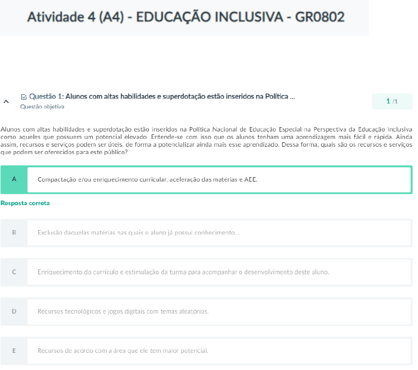 <p>Atividade 4 (A4) - EDUCAÇÃO INCLUSIVA - GR0802 Questão 1: Alunos com altas habilidades e superdotação estão inseridos na Política 1 /1 Questão objetiva Alunos com altas habilidades e superdotação estão inseridos na Política Nacional de Educação Especial na Perspectiva da Educação Inclusiva como aqueles que possuem um potencial elevado. Entende-se com isso que os alunos tenham uma aprendizagem mais fácil e rápida. Ainda assim, recursos e serviços podem ser úteis, de forma a potencializar ainda mais esse aprendizado. Dessa forma, quais são os recursos e serviços que podem ser oferecidos para este público? A Compactação e/ou enriquecimento curricular, aceleração das matérias e AEE. Resposta correta B Exclusão daquelas matérias nas quais aluno já possui conhecimento. C Enriquecimento do currículo e estimulação da turma para acompanhar o desenvolvimento deste aluno. D Recursos tecnológicos e jogos digitais com temas E Recursos de acordo com a área que ele tem maior</p><p>Questão 2: Sobre os alunos com altas habilidades e superdotação é importante dizer que 1 /1 Questão objetiva Sobre os alunos com altas habilidades e superdotação é importante dizer que eles podem ser excelentes em determinada disciplina e ter dificuldades em Assim, é fundamental que professor elabore estratégias pedagógicas que estejam de acordo com as suas singularidades. Assim, é importante que o professor considere alguns aspectos necessários para a aprendizagem. professor deve considerar os aspectos: A emocional e B Biológico e cognitivo. C psicoafetivo e D Mental e E Biológico, sociocultural e psicoafetivo. Resposta correta Questão 3: Sobre processo de escolarização, Vigotski acreditava que todo indivíduo é 1/1 Questão objetiva Sobre processo de escolarização, Vigotski acreditava que todo indivíduo é capaz de aprender. Segundo ele, sujeito é um ser ativo, que interage e modifica meio, assim como meio modifica Pensando nessa perspectiva, como professor deve agir no processo de escolarização dos alunos com Síndrome de Down? A Já que a inclusão prevê a inserção destes alunos na sala não deve haver nenhuma modificação na prática do professor. B professor deve mediar a relação do aluno com conhecimento, possibilitando a criação, desenvolvimento e a aprendizagem e acreditando que todos são capazes. Resposta correta C professor da sala regular deve repassar os conteúdos para que aluno aprenda de modo adaptado na sala de Educação D aluno com Síndrome de Down deve possuir um professor de apoio dentro da sala de aula, para que ele transcreva os conteúdos da forma que ele entenda. E professor deve adaptar os conteúdos para que aluno com Síndrome de Down aprenda ao menos uma parte do que está sendo ensinado à</p><p>Questão 4: A Síndrome de Down é caracterizada por uma alteração no cromossomo 21. Nessa 1/1 Questão objetiva A Síndrome de Down é caracterizada por uma alteração no cromossomo 21. Nessa encontramos diversas características físicas e no desenvolvimento do sujeito. Entre as características mais comuns, podemos citar: A atraso na problemas de articulação. B globo ocular pequeno, fenda no palato labial, malformações graves no sistema nervoso central. C cabeça sola arredondada dos pés. D baixa mãos encurtadas, hipotonia. Resposta correta E tiques motores ou vocais, olhos puxados e baixa estatura. Questão 5: Os conteúdos curriculares não são suficientes para a aprendizagem dos alunos 1 /1 Questão objetiva Os conteúdos curriculares não são suficientes para a aprendizagem dos alunos regulares, e são menos ainda se pensarmos nos alunos público alvo da Educação Especial. Então, como os professores podem desenvolver sua prática de forma mais proveitosa em sala de aula, pensando nos alunos com TEA? A Mantendo conteúdo e aplicando-o de forma individual para os alunos com TEA. B Repassando as atividades para professor da Educação para que mesmo aplique e desenvolva os conteúdos com aluno com TEA. C professor deve manter sua não fazendo diferenciação entre alunos com TEA e os outros. D Utilizar linguagem simples, observar a linguagem corporal, orientar atividades mostrando como fazer, proporcionar momentos que revelem Resposta correta E Encaminhar aluno para Atendimento Educacional Especializado.</p><p>Questão 6: A Política Nacional de Educação Especial na Perspectiva da Educação Inclusiva... 1 Questão objetiva A Política Nacional de Educação Especial na Perspectiva da Educação Inclusiva apresenta também como público alvo os alunos com Transtorno Global do Ela os define como "[...] aqueles que apresentam alterações qualitativas das interações sociais recíprocas e na comunicação, um repertório de interesses e atividades restrito, estereotipado e repetitivo" (BRASIL, 2008, p. 11). Política Nacional de Educação Especial na Perspectiva da Educação Inclusiva. Brasília: Ministério da Educação, 2008. em em julho/2019. De acordo com a literatura mais atual, existe uma nomenclatura mais adequada para estes alunos. Qual seria? A Transtornos de interação e B Transtornos do desenvolvimento. C Transtornos do Espectro Autista. Resposta correta D Transtorno Opositivo E Transtorno Questão 7: Na Educação Especial, termo "público-alvo" passou a ser utilizado a partir 1 /1 Questão objetiva Na Educação Especial, termo "público-alvo" passou a ser utilizado a partir da Política Nacional de Educação Especial na Perspectiva da Educação Inclusiva (2008), antes disso, estes sujeitos eram vistos apenas a partir da sua própria limitação. Diante dessas mudanças, é importante que os professores e profissionais da educação estejam sempre atentos para agir e se referirem de forma adequada aos seus De que forma estes profissionais podem se atualizar, já que as mudanças são constantes? A Elaborando pesquisas próprias sobre questões relativas a B Fazendo cursos que ensinem a diagnosti
