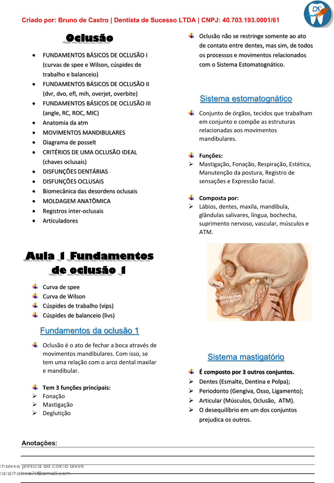 <p>Criado por: Bruno de Castro | Dentista de Sucesso LTDA | CNPJ: 40.703.193.0001/61</p><p>Anotações:</p><p>Oclusão</p><p>• FUNDAMENTOS BÁSICOS DE OCLUSÃO I</p><p>(curvas de spee e Wilson, cúspides de</p><p>trabalho e balanceio)</p><p>• FUNDAMENTOS BÁSICOS DE OCLUSÃO II</p><p>(dvr, dvo, efl, mih, overjet, overbite)</p><p>• FUNDAMENTOS BÁSICOS DE OCLUSÃO III</p><p>(angle, RC, ROC, MIC)</p><p>• Anatomia da atm</p><p>• MOVIMENTOS MANDIBULARES</p><p>• Diagrama de posselt</p><p>• CRITÉRIOS DE UMA OCLUSÃO IDEAL</p><p>(chaves oclusais)</p><p>• DISFUNÇÕES DENTÁRIAS</p><p>• DISFUNÇÕES OCLUSAIS</p><p>• Biomecânica das desordens oclusais</p><p>• MOLDAGEM ANATÔMICA</p><p>• Registros inter-oclusais</p><p>• Articuladores</p><p>Aula 1 Fundamentos</p><p>de oclusão 1</p><p>Curva de spee</p><p>Curva de Wilson</p><p>Cúspides de trabalho (vips)</p><p>Cúspides de balanceio (livs)</p><p>Fundamentos da oclusão 1</p><p>Oclusão é o ato de fechar a boca através de</p><p>movimentos mandibulares. Com isso, se</p><p>tem uma relação com o arco dental maxilar</p><p>e mandibular.</p><p>Tem 3 funções principais:</p><p>➢ Fonação</p><p>➢ Mastigação</p><p>➢ Deglutição</p><p>Oclusão não se restringe somente ao ato</p><p>de contato entre dentes, mas sim, de todos</p><p>os processos e movimentos relacionados</p><p>com o Sistema Estomatognático.</p><p>Sistema estomatognático</p><p>Conjunto de órgãos, tecidos que trabalham</p><p>em conjunto e compõe as estruturas</p><p>relacionadas aos movimentos</p><p>mandibulares.</p><p>Funções:</p><p>➢ Mastigação, Fonação, Respiração, Estética,</p><p>Manutenção da postura, Registro de</p><p>sensações e Expressão facial.</p><p>Composta por:</p><p>➢ Lábios, dentes, maxila, mandíbula,</p><p>glândulas salivares, língua, bochecha,</p><p>suprimento nervoso, vascular, músculos e</p><p>ATM.</p><p>Sistema mastigatório</p><p>É composto por 3 outros conjuntos.</p><p>➢ Dentes (Esmalte, Dentina e Polpa);</p><p>➢ Periodonto (Gengiva, Osso, Ligamento);</p><p>➢ Articular (Músculos, Oclusão, ATM).</p><p>➢ O desequilíbrio em um dos conjuntos</p><p>prejudica os outros.</p><p>Criado por: Bruno de Castro | Dentista de Sucesso LTDA | CNPJ: 40.703.193.0001/61</p><p>Anotações:</p><p>Fundamentos da oclusão I</p><p>Alinhamentos dentários:</p><p>➢ Dentes anteriores são mais</p><p>vestibularizados.</p><p>➢ Dentes posteriores inferiores são mais</p><p>lingualizados e mesializados.</p><p>➢ Dentes posteriores superiores são mais</p><p>vestibularizados e distalizados.</p><p>Curva de Spee: Curva côncava formada na</p><p>linha traçada nas pontas das cúspides</p><p>vestibulares dos dentes posteriores</p><p>inferiores em um mesmo hemi-arco (Visão</p><p>Lateral).</p><p>Curva de Wilson: Curva côncava formada</p><p>na linha traçada nas pontas das cúspides</p><p>dos dentes posteriores inferiores entre um</p><p>hemi-arco e outro (Visão Frontal).</p><p>Cúspides dos dentes posteriores:</p><p>- Pré-molares tem de 2 à 3 cúspides.</p><p>- Molares tem de 4 à 5 cúspides.</p><p>Cúspide de Trabalho (VIPS): São cúspides</p><p>triturantes. Cúspides Vestibulares dos</p><p>Inferiores e Palatina dos Superiores.</p><p>Cúspide de Não - Trabalho (LIVS): São</p><p>cúspides de equilíbrio. Cúspides Linguais</p><p>dos Inferiores e Vestibulares dos</p><p>Superiores.</p><p>Aula 2 Fundamentos</p><p>de oclusão II</p><p>• Dimensão vertical de repouso</p><p>• Dimensão vertical de oclusão</p><p>• Espaço funcional livre</p><p>• Máxima intercuspidação habitual</p><p>• Overjet e overbite</p><p>Criado por: Bruno de Castro | Dentista de Sucesso LTDA | CNPJ: 40.703.193.0001/61</p><p>Anotações:</p><p>Fundamentos da oclusão II</p><p>Dimensões Verticais: São medidas</p><p>tomadas da base do nariz até a base do</p><p>mento. Servem para manter e/ou devolver</p><p>o equilíbrio do Sistema Estomatognâtico</p><p>em relação à mastigação, fonação,</p><p>deglutição, etc...</p><p>Caso essa medida seja perdida (reduzida)</p><p>o paciente começa a ter problemas no S.</p><p>Estomatognático.</p><p>- Disfunções Temporomandibulares (DTM).</p><p>- Dores musculares.</p><p>- Má postura.</p><p>- Apertamentos e ranger dos dentes.</p><p>- Desgastes e traumas dentários.</p><p>Dimensões Verticais de Repouso (DVR):</p><p>- Medida da base do nariz até a base do</p><p>mento com o paciente relaxado e lábios</p><p>com leve toque. Dentes não estão em</p><p>contato.</p><p>Dimensões Verticais de Oclusão (DVO):</p><p>- Medida da base do nariz até a base do</p><p>mento com o paciente com os dentes em</p><p>contato (MIH).</p><p>Máxima Intercuspidação Habitual (MIH):</p><p>- Não é uma medida. É só uma classificação</p><p>que caracteriza quando o paciente está</p><p>ocluindo, ou seja, os dentes estão tocando</p><p>as cúspides.</p><p>Espaço Funcional Livre (EFL):</p><p>- Medida que fica entre as cúspides dos</p><p>dentes quando o paciente está em</p><p>repouso.</p><p>Overjet:</p><p>- Medida no sentido HORIZONTAL da relação</p><p>entre incisivos superiores e inferiores.</p><p>Overbite:</p><p>- Medida no sentido VERTICAL da relação</p><p>entre incisivos superiores e inferiores.</p><p>- O normal dessas medidas giram em torno</p><p>de 2 à 3 milímetros.</p><p>- Quando foge desse padrão entramos em</p><p>algumas classificações de má-oclusões.</p><p>Mordida cruzada:</p><p>- Quando se tem apinhamentos dentários</p><p>que se cruzam entre as arcadas.</p><p>Criado por: Bruno de Castro | Dentista de Sucesso LTDA | CNPJ: 40.703.193.0001/61</p><p>Anotações:</p><p>Aula 3 Fundamentos</p><p>de oclusão III</p><p>• Classificação de angle</p><p>• Relação cêntrica</p><p>• Oclusão em relação cêntrica</p><p>Classificação de angle</p><p>Classificação oclusal que analisa</p><p>posicionamento dentário.</p><p>Classe I:</p><p>- Quando a cúspide MV do 1º Molar superior</p><p>está ocluindo