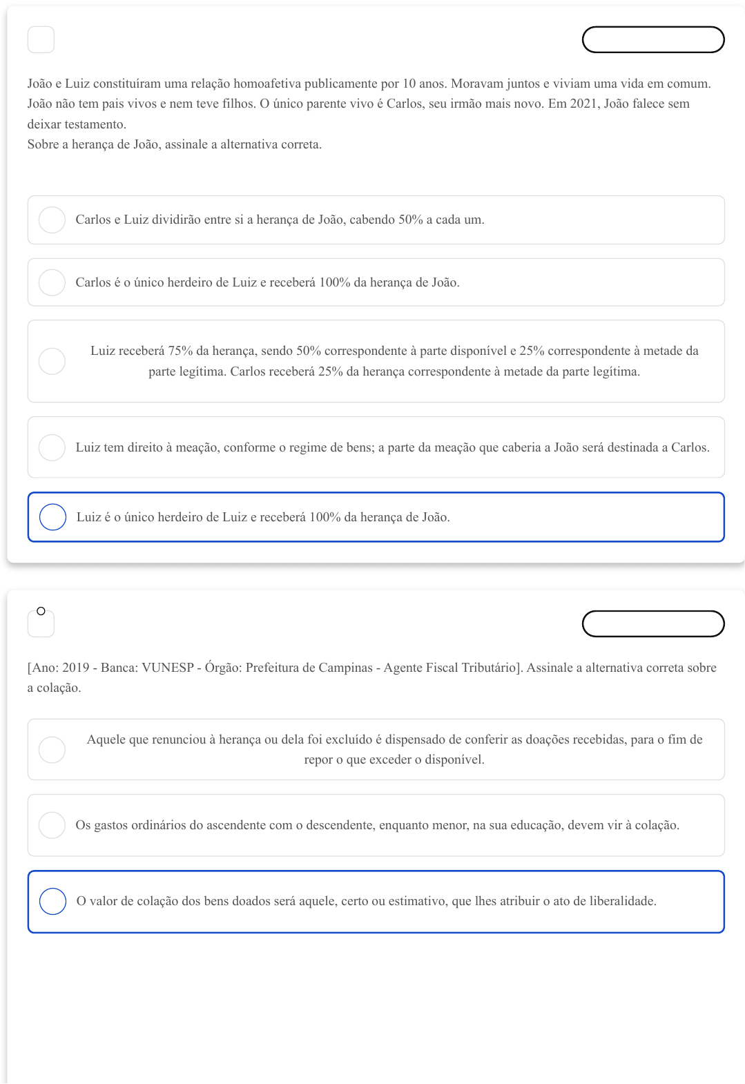 <p>15/03/2024, 16:17 estacio.saladeavaliacoes.com.br/exercicio/65f49a8b2a078bebef459af1/</p><p>https://estacio.saladeavaliacoes.com.br/exercicio/65f49a8b2a078bebef459af1/ 1/6</p><p>A</p><p>B</p><p>C</p><p>D</p><p>E</p><p>A</p><p>B</p><p>C</p><p>1 Desmarcar para revisão</p><p>João e Luiz constituíram uma relação homoafetiva publicamente por 10 anos. Moravam juntos e viviam uma vida em comum.</p><p>João não tem pais vivos e nem teve filhos. O único parente vivo é Carlos, seu irmão mais novo. Em 2021, João falece sem</p><p>deixar testamento.</p><p>Sobre a herança de João, assinale a alternativa correta.</p><p>Carlos e Luiz dividirão entre si a herança de João, cabendo 50% a cada um.</p><p>Carlos é o único herdeiro de Luiz e receberá 100% da herança de João.</p><p>Luiz receberá 75% da herança, sendo 50% correspondente à parte disponível e 25% correspondente à metade da</p><p>parte legítima. Carlos receberá 25% da herança correspondente à metade da parte legítima.</p><p>Luiz tem direito à meação, conforme o regime de bens; a parte da meação que caberia a João será destinada a Carlos.</p><p>Luiz é o único herdeiro de Luiz e receberá 100% da herança de João.</p><p>2 Desmarcar para revisão</p><p>[Ano: 2019 - Banca: VUNESP - Órgão: Prefeitura de Campinas - Agente Fiscal Tributário]. Assinale a alternativa correta sobre</p><p>a colação.</p><p>Aquele que renunciou à herança ou dela foi excluído é dispensado de conferir as doações recebidas, para o fim de</p><p>repor o que exceder o disponível.</p><p>Os gastos ordinários do ascendente com o descendente, enquanto menor, na sua educação, devem vir à colação.</p><p>O valor de colação dos bens doados será aquele, certo ou estimativo, que lhes atribuir o ato de liberalidade.</p><p>15/03/2024, 16:17 estacio.saladeavaliacoes.com.br/exercicio/65f49a8b2a078bebef459af1/</p><p>https://estacio.saladeavaliacoes.com.br/exercicio/65f49a8b2a078bebef459af1/ 2/6</p><p>D</p><p>E</p><p>A</p><p>B</p><p>C</p><p>D</p><p>E</p><p>A</p><p>B</p><p>C</p><p>As doações remuneratórias de serviços feitos ao ascendente estão sujeitas à colação.</p><p>É vedada a doação com dispensa de colação prevista pelo doador em testamento, ou no próprio título de liberalidade.</p><p>3 Desmarcar para revisão</p><p>Não é instrumento que pode ser utilizado em um planejamento sucessório</p><p>O usufruto.</p><p>O inventário extrajudicial.</p><p>A deserdação.</p><p>A constituição de previdência privada.</p><p>A governança corporativa.</p><p>4 Desmarcar para revisão</p><p>Maria é viúva e sem descendentes e ascendentes. Possui somente dois irmãos, José e Carlos, como parentes. Já com a idade</p><p>avançada e possuindo um patrimônio considerável, Maria decide celebrar um testamento público no qual realiza uma partilha de</p><p>seus bens entre José e Carlos. Tempos depois, Maria refletiu e decidiu que não queria mais deixar sua herança para seu irmão</p><p>Carlos, pois sempre tiveram uma relação conflituosa. Assim, procurou novamente o cartório para lavrar um segundo testamento</p><p>no qual destina todo o seu patrimônio ao seu irmão José. Meses depois, Maria falece. Assinale a alternativa correta:</p><p>O segundo testamento não tem eficácia, pois o primeiro testamento é irrevogável. Logo, cada irmão tem direito a</p><p>50% da herança da irmã.</p><p>Ambos os testamentos de Maria são inválidos, pois Maria não reservou a parte legítima de sua herança para ambos os</p><p>irmãos, a que José tem direito.</p><p>O segundo testamento revogou o primeiro e, assim, todo o patrimônio de Maria será herdado por José.</p><p>15/03/2024, 16:17 estacio.saladeavaliacoes.com.br/exercicio/65f49a8b2a078bebef459af1/</p><p>https://estacio.saladeavaliacoes.com.br/exercicio/65f49a8b2a078bebef459af1/ 3/6</p><p>D</p><p>E</p><p>A</p><p>B</p><p>C</p><p>D</p><p>E</p><p>A</p><p>B</p><p>C</p><p>Se desejava excluir Carlos da herança, Maria deveria ter emendado o primeiro testamento com a cláusula de</p><p>deserdação.</p><p>Para a validade do segundo testamento, é preciso que ele seja lavrado no mesmo cartório em que foi lavrado o</p><p>primeiro.</p><p>5 Desmarcar para revisão</p><p>Assinale a alternativa que contém ato que incumbe ao inventariante e que ele não necessita de autorização judicial para realizar:</p><p>Fazer as despesas necessárias para a conservação e o melhoramento dos bens do espólio.</p><p>Pagar dívidas do espólio.</p><p>Transigir quanto a dívidas do espólio.</p><p>Representar o espólio se este for réu em uma ação judicial de cobrança.</p><p>Alienar bens de qualquer espécie.</p><p>6 Desmarcar para revisão</p><p>Sobre o seguro de vida e a previdência privada como formas de planejamento sucessório, analise as proposições abaixo:</p><p>I. Planos de previdência podem não ser vantajosos, pois há incidência de Imposto de Renda e, em alguns Estados, incidência de</p><p>ITCMD.</p><p>II. O seguro de vida é mais vantajoso que os planos de previdência privada porque não há incidência de impostos, ou seja, não</p><p>haverá incidência de Imposto de Renda e nem de ITCMD.</p><p>III. Planos de previdência são mais vantajosos que o seguro de vida porque sobre a previdência incide Imposto de Renda e sobre</p><p>o seguro de vida incide o ITCMD, cuja alíquota é maior que a do Imposto de Renda.</p><p>Estão corretas as proposições</p><p>I, III</p><p>III</p><p>II, III</p><p>15/03/2024, 16:17 estacio.saladeavaliacoes.com.br/exercicio/65f49a8b2a078bebef459af1/</p><p>https://estacio.saladeavaliacoes.com.br/exercicio/65f49a8b2a078bebef459af1/ 4/6</p><p>D</p><p>E</p><p>A</p><p>B</p><p>C</p><p>D</p><p>E</p><p>A</p><p>B</p><p>C</p><p>I, II, III</p><p>I, II</p><p>7 Desmarcar para revisão</p><p>Analise as proposições abaixo:</p><p>I . O filho adotivo, embora seja herdeiro, não pode ser inventariante por causa da ausência de vínculos consanguíneos.</p><p>II. O tutor do h