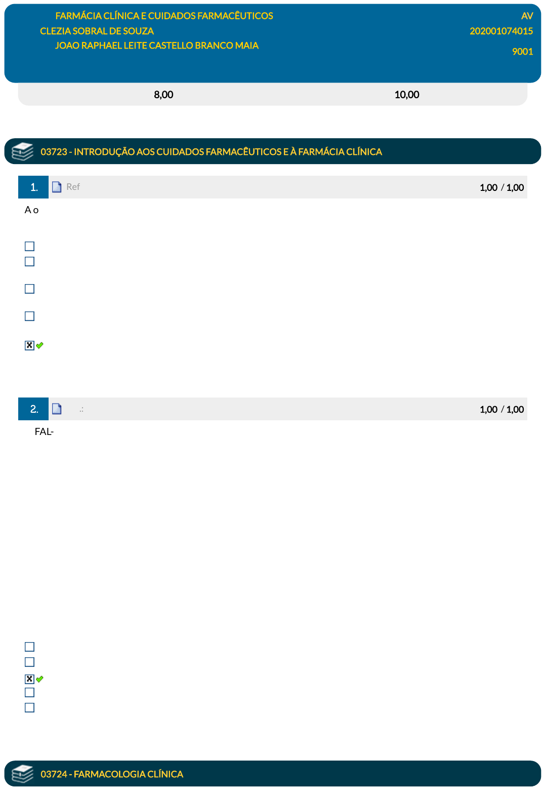 <p>Disciplina: FARMÁCIA CLÍNICA E CUIDADOS FARMACÊUTICOS AV</p><p>Aluno: CLEZIA SOBRAL DE SOUZA 202001074015</p><p>Professor: JOAO RAPHAEL LEITE CASTELLO BRANCO MAIA</p><p>Turma: 9001</p><p>DGT1165_AV_202001074015 (AG) 14/03/2023 21:22:20 (F)</p><p>Avaliação: 8,00 pts Nota SIA: 10,00 pts</p><p>03723 - INTRODUÇÃO AOS CUIDADOS FARMACÊUTICOS E À FARMÁCIA CLÍNICA</p><p>1. Ref.: 7664881 Pontos: 1,00 / 1,00</p><p>A orientação ao paciente é o momento de concretização do plano de cuidado e deve ocorrer de maneira clara e com</p><p>o paciente de acordo com o de�nido. Pode-se considerar que a orientação ao paciente tem como objetivos:</p><p>Uso seguro dos medicamentos, adesão ao tratamento pelo paciente, piora da qualidade de vida.</p><p>Aumento do gasto com medicamentos pelo paciente, modi�cação da rotina diária do paciente, melhoria da</p><p>qualidade de vida.</p><p>Aumentar o número de medicamentos utilizados pelo paciente, uso irracional dos medicamentos, baixa</p><p>adesão ao tratamento pelo paciente.</p><p>Uso seguro adequado e seguro dos medicamentos, pouca adesão atracamento pelo paciente, manter a</p><p>qualidade de vida atual do paciente.</p><p>Uso adequado e seguro dos medicamentos, Adesão ao tratamento pelo paciente, melhoria da qualidade de</p><p>vida.</p><p>2. Ref.: 7663552 Pontos: 1,00 / 1,00</p><p>(UFAL- 2017- MG - adaptada) ''A dispensação de medicamentos é uma atividade que permite ao farmacêutico</p><p>estabelecer uma relação de proximidade e con�ança com o paciente, garantindo a ele a entrega adequada e racional</p><p>de medicamentos.'' CRF-SP. Farmacêutico, a dispensação de medicamentos é sua responsabilidade.</p><p>Analise as a�rmativas quanto relacionadas à Dispensação de Medicamentos.</p><p>I. Comprar e armazenar medicamentos e material médico.</p><p>II. Proporcionar atenção farmacêutica de qualidade e minimizar erros de prescrição.</p><p>III. Contribuir para a adesão ao tratamento.</p><p>IV.Garantir o cumprimento da prescrição por meio do fornecimento de medicamento correto e em quantidade</p><p>adequada</p><p>Marque a alternativa que apresenta a(s) a�rmativa(s) correta(s).</p><p>I, II, III e IV.</p><p>I e III</p><p>II, III e IV</p><p>II e IV</p><p>I</p><p>03724 - FARMACOLOGIA CLÍNICA</p><p>3. Ref.: 7599134 Pontos: 1,00 / 1,00</p><p>Durante um treinamento sobre os principais aspectos da farmacologia clínica, foi a�rmado para que os médicos</p><p>tenham cautela na prescrição de fármacos com janela terapêutica estreita. Assinale a alternativa verdadeira em</p><p>relação a utilidade clínica desta informação.</p><p>Re�ete uma alta variação entre a concentração efetiva mínima desejada e a adversa, capaz de assegurar a</p><p>e�cácia do fármaco sem os efeitos tóxicos.</p><p>Re�ete a extensão de tempo em que ocorrem os processos de distribuição, metabolismo e excreção,</p><p>necessário para que a concentração plasmática seja reduzida à metade.</p><p>Re�ete uma pequena variação entre a concentração efetiva mínima desejada e a adversa, capaz de</p><p>assegurar a e�cácia do fármaco sem os efeitos tóxicos.</p><p>Extensão de tempo que um organismo leva, a partir de uma administração, para produzir anticorpos que</p><p>possam ser detectados por exames de sangue.</p><p>Refere a quantidade de fármaco que permanece inalterada na circulação sistêmica, ou seja, o balanço da</p><p>absorção e da eliminação do fármaco.</p><p>4. Ref.: 7598964 Pontos: 1,00 / 1,00</p><p>A ___________________ é o ramo da farmacologia que estuda como a variabilidade genética altera a forma com a qual</p><p>cada indivíduo responde a um medicamento. Possui o objetivo de "personalizar" ou "individualizar" a terapia</p><p>medicamentosa, visando maximizar a e�cácia do fármaco e reduzindo a incidência de reações adversas. Assinale a</p><p>alternativa que preenche corretamente a lacuna.</p><p>Farmacogenômica</p><p>Farmacoeconomia</p><p>Farmacovigilância</p><p>Farmacodinâmica</p><p>Farmacocinética</p><p>03725 - MONITORAMENTO CLÍNICO</p><p>5. Ref.: 6117493 Pontos: 1,00 / 1,00</p><p>De acordo com a de�nição estabelecida pela Organização Mundial de Saúde, o Uso racional de medicamentos é a</p><p>atitude que garante ao paciente receber medicamentos apropriados à sua condição clínica, nas doses adequadas,</p><p>pelo tempo necessário e ao menor custo possível. Baseado nestes princípios e no cuidado à saúde, a prescrição de</p><p>medicamentos deve ser realizada através de uma série de etapas racionais. Dentre as etapas racionais descritas</p><p>abaixo, assinale a alternativa correta.</p><p>Durante a escolha do fármaco e do esquema posológico apropriado a ser utilizado no tratamento, não é</p><p>necessário considerar características como faixa etária, outras doenças e fármacos usados pelo paciente.</p><p>Durante a prescrição o médico deve estar preparado para repetir, estender e reforçar as informações</p><p>transmitidas ao paciente tantas vezes quanto for necessário, através de programas educacionais, com intuito</p><p>de aumentar a adesão ao tratamento.</p><p>As prescrições racionais devem considerar a �siopatologia do diagnóstico estabelecido, embora possam ser</p><p>realizadas apenas com base no desejo de satisfazer as necessidades psicológicas do paciente por algum tipo</p><p>de tratamento.</p><p>Após o estabelecimento do diagnóstico, pode-se determinar apenas um único objetivo terapêutico para cada</p><p>processo �siopatológico, e assim, escolher medicamentos a serem utilizados no tratamento.</p><p>O pro�ssional deve ser capaz de descrever ao paciente os efeitos esperados com o uso do fármaco e a forma</p><p>como serão monitorados, omitindo sinais e sintomas que o paciente possa apresentar.</p><p>6. Ref.: 6117488 Pontos: 1,00 / 1,00</p><p>Uma mulher descobre que possui uma mutação nos genes BRCA1 e BRCA2. Assinale a opção que indica