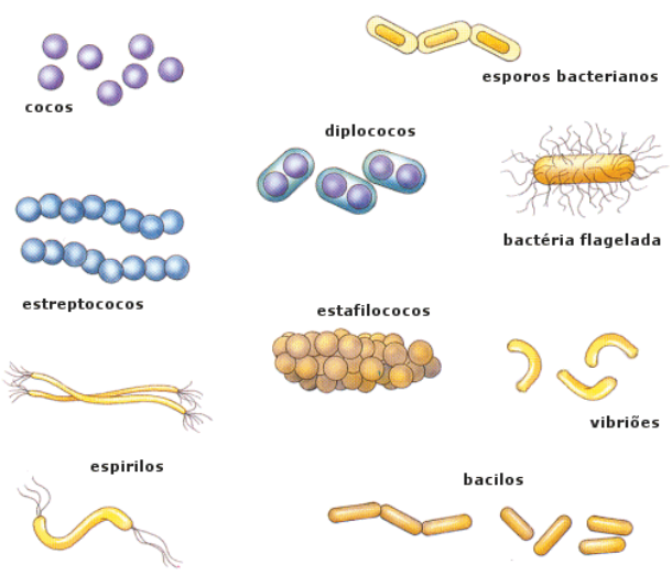 <p>esporos bacterianos cocos diplococos bactéria flagelada estreptococos estafilococos vibriões espirilos bacilos</p>