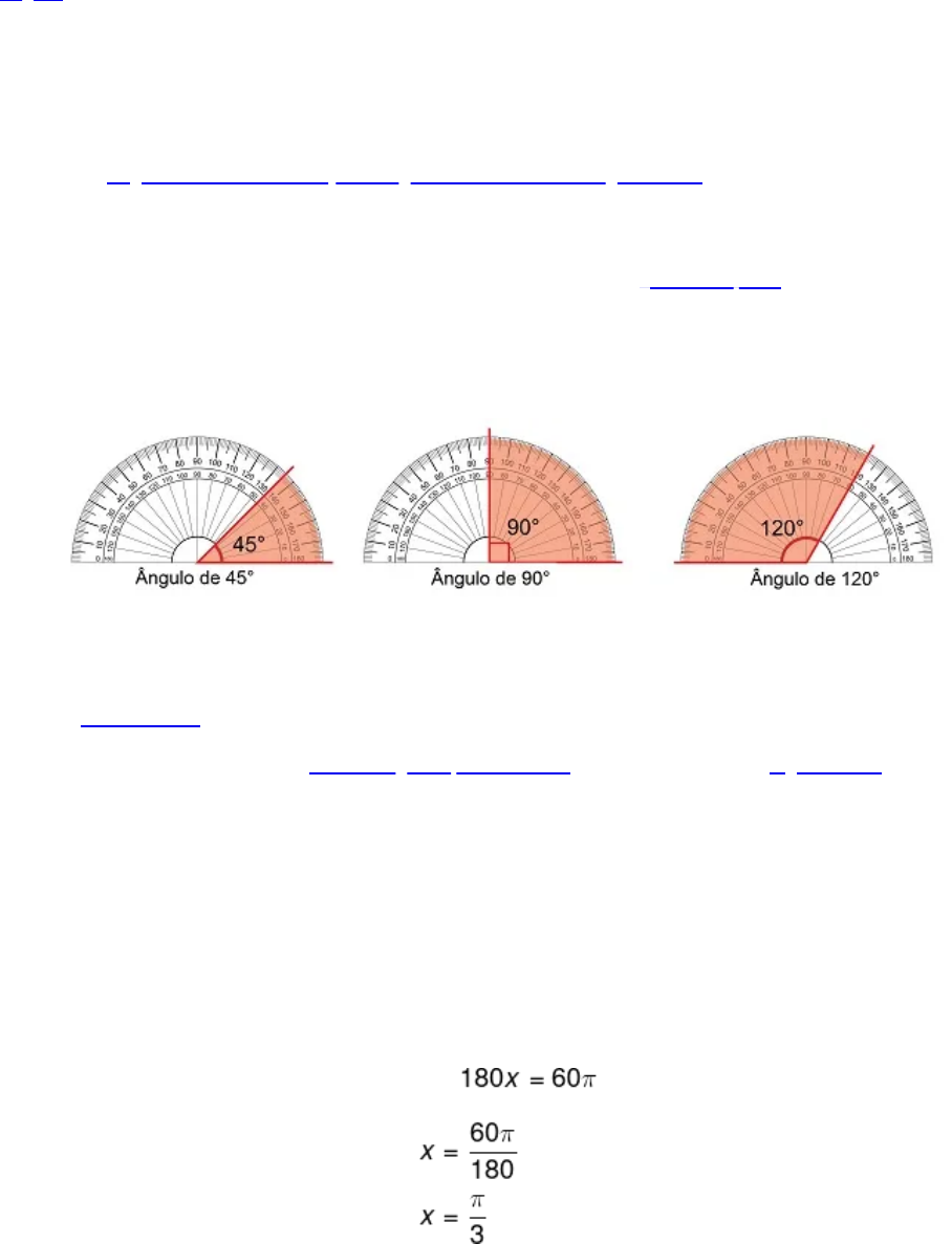 <p>Ângulos</p><p>Conhecemos como ângulo a região delimitada por duas semirretas. Ele pode ser agudo, reto,</p><p>obtuso ou raso.</p><p>O ângulo é uma região delimitada por duas semirretas. Para medi-lo, há duas possíveis unidades: grau ou radiano. De</p><p>acordo com a sua medida, ele pode ser classificado em agudo, reto, obtuso ou raso.</p><p>Quando temos dois ângulos, podemos estabelecer relações entre eles. Caso eles possuam a mesma medida, eles são</p><p>chamados de congruentes. Quando a soma entre eles é igual a 90º ou 180º ou 360º, eles são conhecidos,</p><p>respectivamente, como ângulos complementares, suplementares e replementares.</p><p>Leia também: Ângulos notáveis – conheça os ângulos mais usados na trigonometria</p><p>Como medir um ângulo</p><p>Para a realização de um desenho ou para a medição de um ângulo, na geometria plana utilizamos o compasso e o</p><p>transferidor. Existem alguns outros instrumentos utilizados por profissionais da construção civil, como o teodolito.</p><p>Como o ângulo corresponde à região que está entre duas semirretas, para realizar a medida em um transferidor,</p><p>posicionamos uma das semirretas apontando para 0º e observamos o grau para o qual a outra semirreta está apontada.</p><p>Unidade de medida de ângulos</p><p>Existem duas possibilidades para medirmos um ângulo: o grau e o radiano. 1 rad é o ângulo que faz com que o arco</p><p>formado na circunferência tenha a mesma medida que o raio dessa circunferência.</p><p>É bastante comum a necessidade de converter graus para radianos. Para isso, utilizamos regra de três, sabendo sempre</p><p>que 180º corresponde a π.</p><p>Exemplo</p><p>- Qual é o valor de um ângulo de 60º em radianos?</p><p>Resolução:</p><p>π rad ------------------------- 180º</p><p>x rad ------------------------- 60º</p><p>Agora, para converter de radianos para graus, basta realizarmos a substituição de π por 180º.</p><p>Exemplo</p><p>- Qual é o valor do ângulo que mede a terça parte de 2π rad em graus?</p><p>14/08/2024, 11:03 Ângulos: o que são, tipos, casos particulares, exercícios</p><p>https://brasilescola.uol.com.br/imprimir/2281 1/8</p><p>https://brasilescola.uol.com.br/o-que-e/matematica/o-que-e-angulo.htm</p><p>https://brasilescola.uol.com.br/matematica/angulos-notaveis.htm</p><p>https://brasilescola.uol.com.br/matematica/geometria-plana.htm</p><p>https://brasilescola.uol.com.br/matematica/circunferencia.htm</p><p>https://brasilescola.uol.com.br/matematica/conversoes-medidas-angulos.htm</p><p>https://brasilescola.uol.com.br/o-que-e/matematica/o-que-e-regra-tres.htm</p><p>Classificação dos ângulos</p><p>Um ângulo pode ser classificado de acordo com a sua medida. Além de nulo (ângulo de 0º), um ângulo pode ser agudo,</p><p>reto, obtuso, raso, côncavo ou inteiro.</p><p>Ângulo agudo: quando sua medida é um número maior que 0 e menor que 90º.</p><p>Ângulo agudo</p><p>Note que o ângulo AÔB, representado também por α, é um ângulo maior que 0º e menor que 90º.</p><p>Ângulo reto: possui exatamente 90º. Quando isso acontece, podemos dizer também que as semirretas se cruzam</p><p>de forma perpendicular.</p><p>Ângulo reto</p><p>Geralmente o ângulo reto possui a região angular (região em laranja na imagem) representada por um quadrado.</p><p>Ângulo obtuso: quando sua medida é maior que 90º e menor que 180º.</p><p>Ângulo obtuso</p><p>Ângulo raso: conhecido também como meia-volta ou meia-lua, esse ângulo equivale à metade de um ângulo inteiro,</p><p>logo possui exatamente 180º.</p><p>14/08/2024, 11:03 Ângulos: o que são, tipos, casos particulares, exercícios</p><p>https://brasilescola.uol.com.br/imprimir/2281 2/8</p><p>Ângulo raso</p><p>Ângulo côncavo: menos comum nas situações cotidianas que os demais, é o ângulo que tem medida maior que</p><p>180º e menor que 360º.</p><p>Ângulo côncavo</p><p>Ângulo inteiro: como o nome sugere, esse ângulo representa a volta completa, possuindo exatamente 360º.</p><p>Ângulo inteiro</p><p>Leia também: Polígonos – figuras geométricas formadas por segmentos de reta</p><p>Ângulos congruentes</p><p>Dois ângulos são chamados de congruentes quando possuem a mesma medida. Esse conceito é muito confundido com a</p><p>ideia de igualdade. Para que os ângulos sejam congruentes, eles não precisam ser necessariamente iguais, mas precisam</p><p>ter a mesma medida.</p><p>Os ângulos AÔB e DÊF são congruentes.</p><p>Ângulos opostos pelo vértice</p><p>Um caso bastante comum de ângulos congruentes é quando os ângulos são opostos pelo vértice. Quando temos duas</p><p>retas concorrentes, ou seja, que se cruzam, é possível traçarmos vários ângulos entre elas. Quando comparamos dois</p><p>ângulos que estão em lados opostos de um mesmo vértice, eles sempre serão congruentes, ou seja, terão a mesma</p><p>medida.</p><p>14/08/2024, 11:03 Ângulos: o que são, tipos, casos particulares, exercícios</p><p>https://brasilescola.uol.com.br/imprimir/2281 3/8</p><p>https://brasilescola.uol.com.br/matematica/poligonos.htm</p><p>Ângulos opostos pelo vértice são congruentes.</p><p>Leia também: Ângulos colaterais internos e externos</p><p>Bissetriz de um ângulo</p><p>Definimos como bissetriz de um ângulo a semirreta que divide o ângulo em duas partes congruentes, ou seja, de</p><p>mesma medida.</p><p>EÂF e GÂF são congruentes.</p><p>A bissetriz AF divide o ângulo maior EÂG em dois ângulos congruentes. O ângulo EÂF é congruente ao ângulo FÂG.</p><p>Ângulos consecutivos e ângulos adjacentes</p><p>Dois ângulos são consecutivos quando possuem o mesmo vértice e um de seus lados em comum. O conceito de ângulo</p><p>adjacente, muitas vezes, confunde-se com o de ângulo consecutivo, porém possuem uma diferença sutil – a começar pelo</p><p>fato de que ângulos adjacentes são casos particulares de ângulos consecutivos.</p><p>Dois ângulos consecutivos são adjacentes