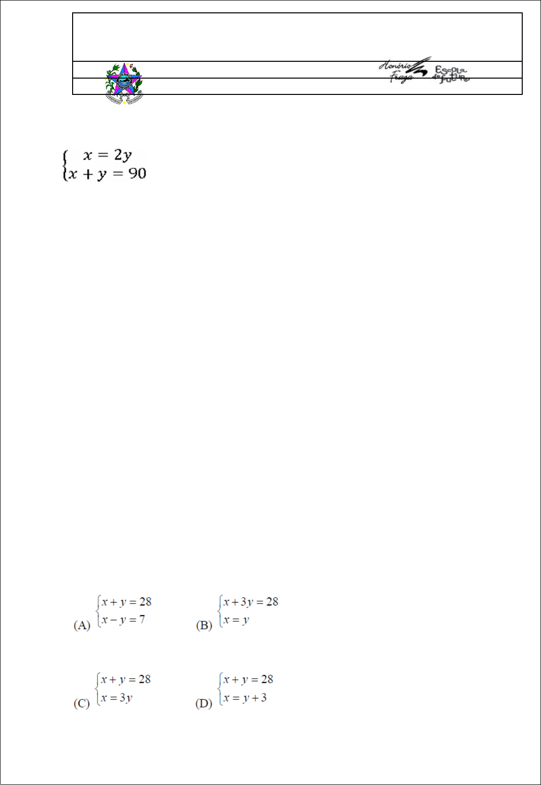 <p>GOVERNO DO ESTADO DO ESPÍRITO SANTO</p><p>SECRETARIA DE ESTADO DA EDUCAÇÃO</p><p>SUPERINTENDÊNCIA REGIONAL DE COLATINA</p><p>EEEM “HONÓRIO FRAGA”</p><p>PROFESSOR: CRISTIANE T RONCONI</p><p>CONTEÚDO: SISTEMAS LINEARES</p><p>1). Observe o sistema de equações a seguir e encontre o valor de x e y e determine a solução do sistema.</p><p>2) A soma de dois números dados é 8 e a diferença entre estes mesmos números é igual a 4. Quais sãos os números?</p><p>3) A quantidade de pontos em um jogo de Alberto é o dobro da quantidade de pontos do Beto nesse mesmo jogo. Somando a pontuação dos dois tem-se o total de 150 pontos. Quantos pontos tem Alberto?</p><p>4) Em um abrigo para animais, entre gatos e cachorros, há 300 animais. Se o número de gatos é igual a metade do número de cachorros, determine o número de gatos e cachorros:</p><p>5) Em um sítio existem cavalos, e galinhas, fazendo um total de 60 cabeças e 180 pés. Quantos são os animais de duas patas e quantos são os de quatro patas?</p><p>6) (Prova Brasil). Um teste é composto por 20 questões classificadas em verdadeiras ou falsas. O número de questões verdadeiras supera o número de questões falsas em 4 unidades. Qual o número de questões verdadeiras? E falsas?</p><p>7) Na 7ª série, há 44 alunos entre meninos e meninas. A diferença entre o número de meninos e o de meninas é 10. Qual é o número de meninas ?</p><p>8) João e Pedro foram a um restaurante almoçar e a conta deles foi de R$ 28,00. A conta de Pedro foi o triplo do valor de seu companheiro. O sistema de equações do 1º grau que melhor traduz o problema é:</p><p>9) Observe o sistema e reponda:</p><p>Qual dos gráficos mostra a solução do sistema:</p><p>image3.jpeg</p><p>image4.png</p><p>image5.png</p><p>image6.png</p><p>image7.png</p><p>image1.png</p><p>image2.png</p>