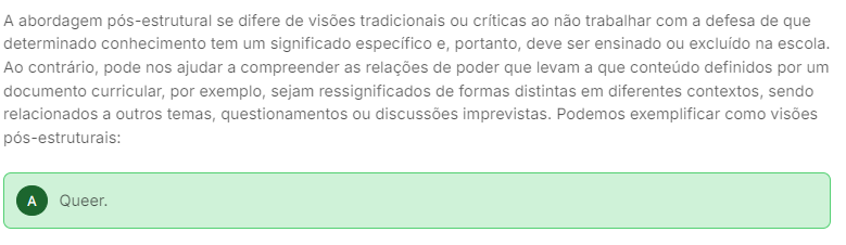 <p>A abordagem pós-estrutural se difere de visões tradicionais ou críticas ao não trabalhar com a defesa de que determinado conhecimento tem um significado específico e, portanto, deve ser ensinado ou excluído na escola. Ao contrário, pode nos ajudar a compreender as relações de poder que levam a que definidos por um documento curricular, por exemplo, sejam ressignificados de formas distintas em diferentes contextos, sendo relacionados a outros temas, questionamentos ou discussões imprevistas. Podemos exemplificar como visões pós-estruturais: A Queer.</p>