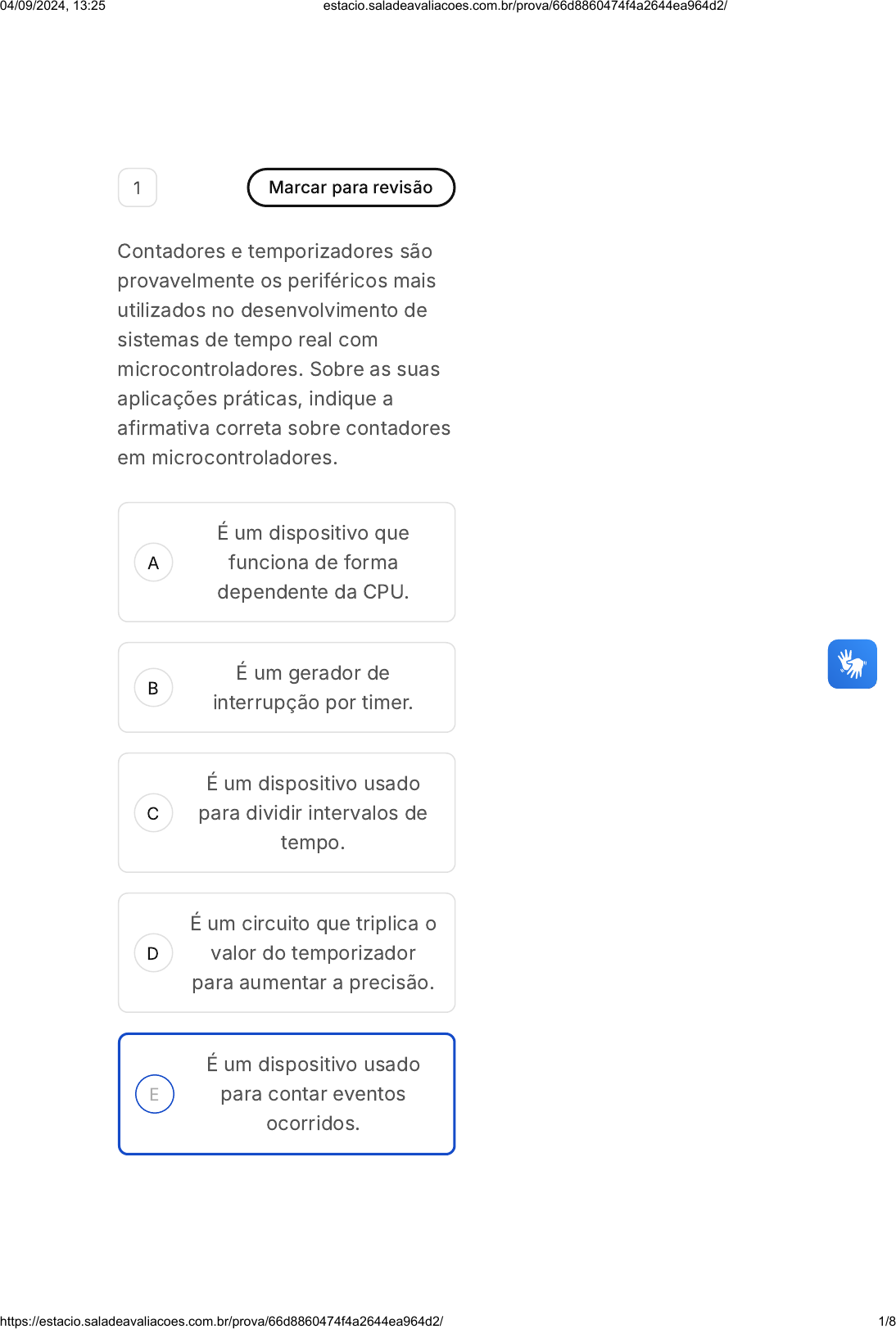 <p>A</p><p>B</p><p>C</p><p>D</p><p>E</p><p>1 Marcar para revisão</p><p>Contadores e temporizadores são</p><p>provavelmente os periféricos mais</p><p>utilizados no desenvolvimento de</p><p>sistemas de tempo real com</p><p>microcontroladores. Sobre as suas</p><p>aplicações práticas, indique a</p><p>afirmativa correta sobre contadores</p><p>em microcontroladores.</p><p>É um dispositivo que</p><p>funciona de forma</p><p>dependente da CPU.</p><p>É um gerador de</p><p>interrupção por timer.</p><p>É um dispositivo usado</p><p>para dividir intervalos de</p><p>tempo.</p><p>É um circuito que triplica o</p><p>valor do temporizador</p><p>para aumentar a precisão.</p><p>É um dispositivo usado</p><p>para contar eventos</p><p>ocorridos.</p><p>04/09/2024, 13:25 estacio.saladeavaliacoes.com.br/prova/66d8860474f4a2644ea964d2/</p><p>https://estacio.saladeavaliacoes.com.br/prova/66d8860474f4a2644ea964d2/ 1/8</p><p>A</p><p>B</p><p>C</p><p>D</p><p>E</p><p>2 Marcar para revisão</p><p>Qual a vantagem de se usar a</p><p>interrupção por temporizador nos</p><p>microcontroladores?</p><p>Liberar os demais</p><p>temporizadores.</p><p>Conseguir intervalos de</p><p>tempo menores entre</p><p>instruções de contagem.</p><p>Deixar o programa em</p><p>espera para executar a</p><p>próxima instrução.</p><p>Deixar o contador livre</p><p>para contar os eventos</p><p>externos.</p><p>Deixar a CPU do</p><p>microcontrolador livre</p><p>para executar outras</p><p>instruções.</p><p>3 Marcar para revisão</p><p>O que faz um ADC ter melhor</p><p>resolução?</p><p>04/09/2024, 13:25 estacio.saladeavaliacoes.com.br/prova/66d8860474f4a2644ea964d2/</p><p>https://estacio.saladeavaliacoes.com.br/prova/66d8860474f4a2644ea964d2/ 2/8</p><p>A</p><p>B</p><p>C</p><p>D</p><p>E</p><p>A</p><p>B</p><p>C</p><p>Uma maior taxa de</p><p>amostragem</p><p>Uma maior tensão de</p><p>referência</p><p>Um menor período de</p><p>amostragem</p><p>Uma menor taxa de</p><p>amostragem</p><p>Um maior número de bits</p><p>4 Marcar para revisão</p><p>Disseram para você que um botão</p><p>foi ligado ao pino de um</p><p>microcontrolador e que este pino</p><p>está na configuração pull down. O</p><p>que acontece quando se pressiona</p><p>o botão?</p><p>O pino oscila entre níveis</p><p>lógicos 0 e 1, dependendo</p><p>do programa.</p><p>O pino vai a nível lógico 0.</p><p>O nível lógico vai</p><p>depender do que foi</p><p>programado.</p><p>04/09/2024, 13:25 estacio.saladeavaliacoes.com.br/prova/66d8860474f4a2644ea964d2/</p><p>https://estacio.saladeavaliacoes.com.br/prova/66d8860474f4a2644ea964d2/ 3/8</p><p>D</p><p>E</p><p>A</p><p>B</p><p>C</p><p>D</p><p>E</p><p>O pino vai a nível lógico 1.</p><p>O nível lógico do pino é</p><p>indefinido.</p><p>5 Marcar para revisão</p><p>Qual das opções a seguir possui</p><p>apenas transmissões de dados</p><p>assíncronas?</p><p>UART e RS232</p><p>RS485 e Comunicação</p><p>paralela</p><p>I2C e SPI</p><p>Comunicação paralela e</p><p>UART</p><p>I2C e RS232</p><p>6 Marcar para revisão</p><p>O display de 7 segmentos é um</p><p>display de baixo custo que consiste</p><p>em sete LEDs organizados de forma</p><p>retangular com a finalidade de</p><p>mostrar informações alfanuméricas</p><p>04/09/2024, 13:25 estacio.saladeavaliacoes.com.br/prova/66d8860474f4a2644ea964d2/</p><p>https://estacio.saladeavaliacoes.com.br/prova/66d8860474f4a2644ea964d2/ 4/8</p><p>A</p><p>B</p><p>C</p><p>D</p><p>E</p><p>A</p><p>B</p><p>C</p><p>(decimal ou hexadecimal) para o</p><p>usuário final. Em um caso de uso</p><p>típico, o display foi configurado</p><p>com os seguintes níveis lógicos</p><p>�B�C�1) e �A�F�G�E�D�0�. Nesse</p><p>caso, o display apresenta o número:</p><p>3.</p><p>2.</p><p>5.</p><p>1.</p><p>6.</p><p>7 Marcar para revisão</p><p>Na IDE do Arduino, qual função</p><p>deve ser chamada quando um</p><p>dispositivo mestre quer estabelecer</p><p>uma comunicação I2C com o</p><p>escravo de número 4?</p><p>Wire.write(4�;</p><p>Wire.beginTransmission(4�</p><p>Wire.onRequest(4�</p><p>04/09/2024, 13:25 estacio.saladeavaliacoes.com.br/prova/66d8860474f4a2644ea964d2/</p><p>https://estacio.saladeavaliacoes.com.br/prova/66d8860474f4a2644ea964d2/ 5/8</p><p>D</p><p>E</p><p>A</p><p>B</p><p>C</p><p>Wire.requestFrom(4�</p><p>I2C.receiveFrom(4�</p><p>8 Marcar para revisão</p><p>Verifique as afirmações sobre V&V</p><p>e diga qual está certa.</p><p>A validação se refere ao</p><p>conjunto de atividades que</p><p>garantem que o software</p><p>implementa corretamente</p><p>uma função específica.</p><p>A validação é definida</p><p>como a demonstração de</p><p>consistência, integridade e</p><p>correção do software em</p><p>cada estágio.</p><p>A validação está</p><p>preocupada em construir</p><p>o produto certo.</p><p>00</p><p>hora</p><p>: 33</p><p>min</p><p>: 33</p><p>seg</p><p>Ocultar</p><p>Questão 10 de 10</p><p>Respondidas �10� Em branco �0�</p><p>Finalizar prova</p><p>1 2 3 4 5</p><p>6 7 8 9 10</p><p>SM2 Programação De Microcontroladores</p><p>04/09/2024, 13:25 estacio.saladeavaliacoes.com.br/prova/66d8860474f4a2644ea964d2/</p><p>https://estacio.saladeavaliacoes.com.br/prova/66d8860474f4a2644ea964d2/ 6/8</p><p>D</p><p>E</p><p>A</p><p>B</p><p>C</p><p>D</p><p>E</p><p>Verificação é a</p><p>determinação da exatidão</p><p>do programa final.</p><p>A verificação se refere a</p><p>um conjunto diferente de</p><p>atividades que garantem</p><p>que o software que foi</p><p>construído seja rastreável</p><p>aos requisitos do cliente.</p><p>9 Marcar para revisão</p><p>Os sistemas críticos embarcados</p><p>devem executar em tempo real as</p><p>respostas aos eventos. Estamos</p><p>falando da característica de:</p><p>Integridade</p><p>Flexibilidade</p><p>Determinismo</p><p>Confiabilidade</p><p>Realismo</p><p>10 Marcar para revisão</p><p>04/09/2024, 13:25 estacio.saladeavaliacoes.com.br/prova/66d8860474f4a2644ea964d2/</p><p>https://estacio.saladeavaliacoes.com.br/p