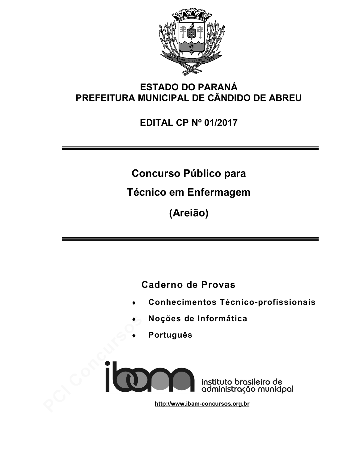 <p>pcimarkpci MDAwMDowMDAwOjAwMDA6MDAwMDowMDAwOmZmZmY6YmI1NTphYjFm:V2VkLCAxNCBBdWcgMjAyNCAyMDoxOToyMiAtMDMwMA==</p><p>www.pciconcursos.com.br</p><p>ESTADO DO PARANÁ</p><p>PREFEITURA MUNICIPAL DE CÂNDIDO DE ABREU</p><p>EDITAL CP Nº 01/2017</p><p>Concurso Público para</p><p>Técnico em Enfermagem</p><p>(Areião)</p><p>Caderno de Provas</p><p> Conhecimentos Técnico-profissionais</p><p> Noções de Informática</p><p> Português</p><p>http://www.ibam-concursos.org.br</p><p>pcimarkpci MDAwMDowMDAwOjAwMDA6MDAwMDowMDAwOmZmZmY6YmI1NTphYjFm:V2VkLCAxNCBBdWcgMjAyNCAyMDoxOToyMiAtMDMwMA==</p><p>www.pciconcursos.com.br</p><p>Concurso Público para a</p><p>Prefeitura Municipal de Cândido de Abreu - PR</p><p>Curso Técnico de Nível Médio – Duração: 3 horas</p><p>Você recebeu o seguinte material:</p><p> Um caderno de provas, contendo 40 (quarenta) questões de múltipla escolha,</p><p>numeradas sequencialmente, cada uma apresentando 4 (quatro) alternativas: A, B, C e</p><p>D. As questões estão assim distribuídas: 01 a 16 – Conhecimentos Técnico-</p><p>profissionais, 17 a 28 – Noções de Informática e 29 a 40 – Português.</p><p> Um cartão de respostas.</p><p>Instruções</p><p> Verifique se o seu nome e o seu número de inscrição estão corretos no cartão de</p><p>respostas.</p><p>Se houver erro, notifique o fiscal.</p><p> Assine o cartão de respostas com caneta azul ou preta.</p><p> Verifique se a impressão e a numeração das questões estão corretas.</p><p>Caso ocorra qualquer erro, comunique o fiscal.</p><p> O caderno de provas pode ser utilizado para suas anotações e cálculos.</p><p> Não é permitido o uso de calculadora.</p><p> Leia atentamente cada questão e escolha a alternativa que mais adequadamente</p><p>responde a cada uma delas. Marque sua resposta no cartão de respostas, onde</p><p>será efetuada a correção.</p><p> O cartão de respostas não pode ser dobrado, amassado, rasurado ou manchado,</p><p>nem conter qualquer registro além das respostas assinaladas e de sua assinatura.</p><p> O cartão de respostas não será substituído em hipótese alguma. Exceto quando</p><p>for comprovado erro do fiscal na entrega do cartão.</p><p> O cartão de respostas deve ser marcado com caneta esferográfica azul ou</p><p>preta e o espaço correspondente à letra assinalada totalmente coberto, conforme o</p><p>modelo abaixo:</p><p>Correto: A B D</p><p>Outras formas de marcação, diferentes da que está determinada acima, farão com que as</p><p>questões sejam anuladas. Não use lápis ou lapiseira no cartão de respostas antes de</p><p>utilizar a caneta esferográfica, pois isto também anulará suas respostas. A leitora de marcas</p><p>não registrará as respostas em que houver falta de nitidez e/ou marcação de mais de uma</p><p>letra.</p><p>Conforme consta no Edital, o candidato não poderá levar o caderno de questões da</p><p>prova objetiva no dia de aplicação do concurso.</p><p>O caderno de prova será disponibilizado no site www.ibam-concursos.org.br no dia 31</p><p>de outubro de 2017.</p><p>Após o término da prova, entregue ao fiscal o caderno de prova e o cartão de respostas</p><p>devidamente preenchido e assinado.</p><p>BOA PROVA!</p><p>pcimarkpci MDAwMDowMDAwOjAwMDA6MDAwMDowMDAwOmZmZmY6YmI1NTphYjFm:V2VkLCAxNCBBdWcgMjAyNCAyMDoxOToyMiAtMDMwMA==</p><p>www.pciconcursos.com.br</p><p>CONHECIMENTOS TÉCNICO-PROFISSIONAIS</p><p>Questão 01</p><p>A identificação do paciente é prática</p><p>indispensável para garantir sua segurança em</p><p>qualquer ambiente de cuidado à saúde, evitando,</p><p>assim, diversos erros, tais como de medicação,</p><p>durante a transfusão de hemocomponentes, em</p><p>testes diagnósticos, de procedimentos realizados</p><p>e de entrega de bebês às famílias erradas. No</p><p>cuidado em pediatria, é também sugerida a</p><p>utilização da etiqueta de identificação, na qual</p><p>deverá constar, além do nome da criança e da</p><p>data de nascimento, o nome da seguinte pessoa:</p><p>A ( ) pai da criança</p><p>B ( ) mãe da criança</p><p>C ( ) médico pediatra responsável</p><p>D ( ) profissional de enfermagem responsável</p><p>Questão 02</p><p>A Enfermagem é uma profissão comprometida</p><p>com a saúde e a qualidade de vida da pessoa,</p><p>família e coletividade. O profissional de</p><p>Enfermagem atua na promoção, prevenção,</p><p>recuperação e reabilitação da saúde, com</p><p>autonomia e em consonância com os preceitos</p><p>éticos e legais. “O dever de fazer o bem e a</p><p>promoção ativa de atos benevolentes, e a injunção</p><p>para não infligir dano” dizem respeito ao seguinte</p><p>princípio ético comum da prática de Enfermagem:</p><p>A ( ) confidencialidade</p><p>B ( ) beneficência</p><p>C ( ) efeito duplo</p><p>D ( ) autonomia</p><p>Questão 03</p><p>Para aplicação intramuscular, um frasco-ampola</p><p>de Keflin de 1g deve ser diluído, de preferência,</p><p>em um volume de 5ml de solvente, obtendo-se</p><p>assim uma solução total de 5ml.</p><p>Para saber quanto do medicamento existe em</p><p>cada ml da dose, deve-se seguir a regra de três</p><p>para cálculo. Desta forma, o resultado obtido, em</p><p>mg, será igual a:</p><p>A ( ) 5</p><p>B ( ) 25</p><p>C ( ) 200</p><p>D ( ) 250</p><p>Questão 04</p><p>Em uma campanha de imunização realizada no</p><p>Município, foi contraindicada a vacinação de</p><p>pacientes que relataram prévia reação anafilática</p><p>à proteína do ovo. Esta cepa é item de base de</p><p>composição da seguinte vacina:</p><p>A ( ) DT</p><p>B ( ) BCG</p><p>C ( ) rotavírus</p><p>D ( ) influenza</p><p>Questão 05</p><p>A alternativa que apresenta um cuidado a ser</p><p>realizado pelo técnico de enfermagem no período</p><p>pós-operatório imediato é:</p><p>A ( ) posicionar o paciente em decúbito dorsal</p><p>horizontal, a cabeça lateralizada e o</p><p>pescoço estendido, visando prevenir</p><p>evento de broncoaspiração em cas