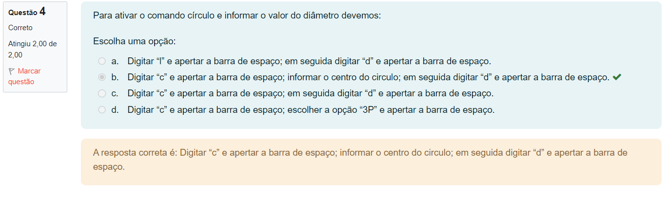 <p>Questão 4 Para ativar comando círculo e informar o valor do diâmetro devemos: Correto Atingiu 2,00 de Escolha uma opção: 2,00 a. Digitar e apertar a barra de espaço; em seguida digitar "d" e apertar a barra de espaço. Marcar questão b. Digitar "c" e apertar a barra de espaço; informar o centro do circulo; em seguida digitar "d" e apertar a barra de espaço. C. Digitar "c" e apertar a barra de espaço; em seguida digitar "d" e apertar a barra de espaço. d. Digitar e apertar a barra de espaço; escolher a opção "3P" e apertar a barra de espaço. A resposta correta é: Digitar e apertar a barra de espaço; informar centro do circulo; em seguida digitar "d" e apertar a barra de espaço.</p>