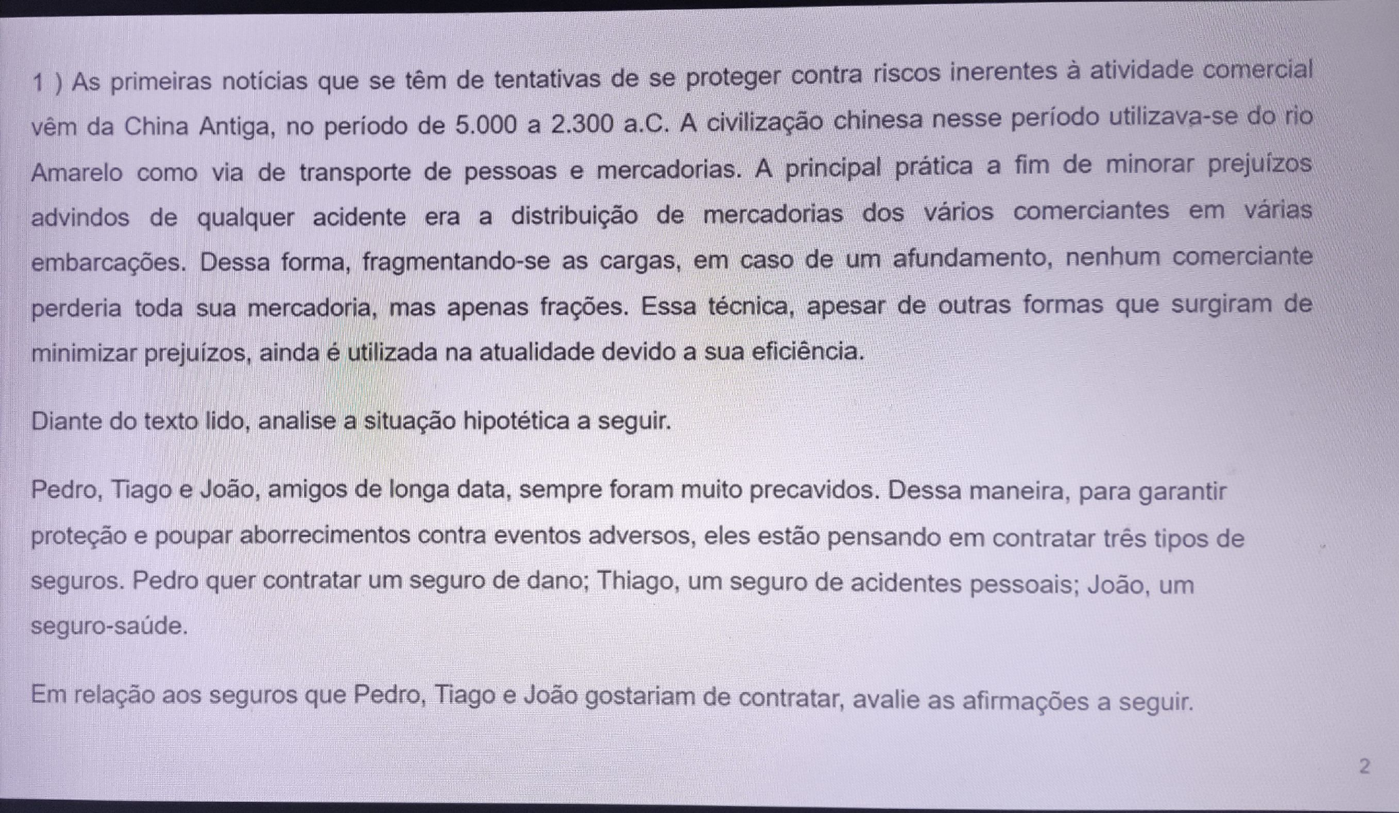 <p>1 ) As primeiras notícias que se têm de tentativas de se proteger contra riscos inerentes à atividade comercial vêm da China Antiga, no período de 5.000 a 2.300 a.C. A civilização chinesa nesse período utilizava-se do rio Amarelo como via de transporte de pessoas e mercadorias. A principal prática a fim de minorar advindos de qualquer acidente era a distribuição de mercadorias dos vários comerciantes em várias embarcações. Dessa forma, fragmentando-se as cargas, em caso de um afundamento, nenhum comerciante perderia toda sua mercadoria, mas apenas frações. Essa técnica, apesar de outras formas que surgiram de minimizar prejuízos, ainda é utilizada na atualidade devido a sua eficiência. Diante do texto lido, analise a situação hipotética a seguir. Pedro, Tiago e João, amigos de longa data, sempre foram muito precavidos. Dessa maneira, para garantir proteção e poupar aborrecimentos contra eventos adversos, eles estão pensando em contratar três tipos de seguros. Pedro quer contratar um seguro de dano; Thiago, um seguro de acidentes pessoais; João, um seguro-saúde. Em relação aos seguros que Pedro, Tiago e João gostariam de contratar, avalie as afirmações a seguir. 2</p><p>1. Ao contratar um seguro de dano, Pedro pode proteger bens materiais ou qualquer outra espécie de bem suscetível de avaliação econômica. Ao contratar um seguro de acidentes pessoais, Thiago pode ter um seguro que cobre riscos decorrentes de lesões corporais que possam levá-lo a ter invalidez parcial ou permanente. III. Ao contratar um seguro-saúde, João pode ter um seguro que se destina ao ressarcimento de despesas médico-hospitalares. É correto o que se afirma em Alternativas A) apenas. B) III, apenas. C) e III, apenas. apenas. E) 3</p><p>2) O contrato de seguro é de natureza bilateral porque o segurador tem uma obrigação a pagar para o segurado caso ocorra o sinistro. prêmio corresponde à obrigação a ser paga pelo segurado ao segurador para ter direito à garantia do risco, e mesmo se ao fim do prazo contratual o risco não se concretizar, o valor do prêmio não é devolvido ao segurado. contrato de seguro é considerado perfeito a partir do momento que é emitida a apólice ou o bilhete de seguro, esses termos, que ainda não haviam sido citados, são, um ou outro, o documento que deve ser apresentado pelo segurado ao segurador em caso de sinistro para ter direito à indenização, isso quer dizer que, mesmo que o prêmio ainda não tenha sido pago, o segurado tem direito a sua garantia desde que o prazo para pagamento não tenha vencido, pois, se o segurado estiver em mora (atraso) no pagamento do prêmio, ele não tem direito à indenização. Diante do exposto, analise a situação hipotética a seguir. Jorge estava voltando devagar para casa quando o carro que dirigia colidiu com o carro de sua filha, Ana Carolina, que estava voltando da academia. pai ficou muito irritado com a filha e acionou o seguro, indicando que a responsável pela batida foi Ana Carolina. 4</p><p>Considerando o caso apresentado, avalie as asserções a seguir e a relação proposta entre elas. I. Ao indenizar o contratante do seguro (Jorge) pelos prejuízos havidos, a seguradora sub-roga-se nos direitos e nas ações, contudo, a seguradora não pode cobrar valor de Ana Carolina. PORQUE II. A seguradora não tem direito de regresso se o causador do sinistro, sem dolo, for descendente do segurado, nos termos do § 1° do art. 786 do Código Civil. A respeito dessas asserções, assinale a opção correta. Alternativas A) As asserções I e são proposições verdadeiras, e a é uma justificativa da I. B) As asserções I e são proposições verdadeiras, mas a não é uma justificativa da C) A asserção é uma proposição verdadeira, e a é uma proposição falsa. D) A asserção é uma proposição falsa, e a é uma proposição verdadeira. E) As asserções I e são proposições falsas. 5</p><p>3) Conceituar não é tarefa fácil. Aliás, apresentar um conceito é missão das mais intrincadas na doutrina, visto que aquele que se arrisca a poderá pecar por presunção, por imaginar que a sua definição criada é a mais perfeita de todas ou simplesmente uma verdade jurídica absoluta; ou por omissão, acreditando que a enunciação simples demais seja a mais didática, quando, em verdade, não passa de uma concepção simplória. Sem pretender incorrer nesses erros, entendemos que o contrato é um negócio jurídico por meio do qual as partes declarantes, limitadas pelos princípios da função social e da boa-fé objetiva, auto disciplinam os efeitos patrimoniais que pretendem atingir, segundo a autonomia das suas próprias vontades. Não se poderá falar em contrato, de fato, sem que se tenha por sua pedra de toque a manifestação de vontade. Sem "querer humano", pois não há negócio jurídico. E, não havendo negócio, não há contrato. Dado o exposto, considere a situação hipotética a seguir. João é amigo de infância de Verônica. Durante a pandemia, Verônica perdeu seu emprego e correu o risco de perder sua casa. Sabendo da necessidade financeira de Verônica, João realizou um empréstimo de R$ 20.000,00 (vinte mil sem juros, para ser devolvido em um ano. Assim, pode-se afirmar que o tipo de contrato presente na situação hipotética é o contrato de Alternativas A) comodato, uma espécie do contrato de empréstimo que, no caso apresentado, pode ser classificado em bilateral, comutativo, execução imediata, temporário, formal e gratuito. B) mútuo, uma espécie do contrato de empréstimo que, na situação apresentada, pode ser classificado em bilateral, comutativo, real, temporário, formal e oneroso. C) comodato, uma espécie do contrato de empréstimo que, no caso em questão, pode ser classificado em unilateral, comutativo, real, temporário, formal e oneroso. mútuo, uma espécie do contrato de empréstimo que, na situação exposta, pode ser classificado em