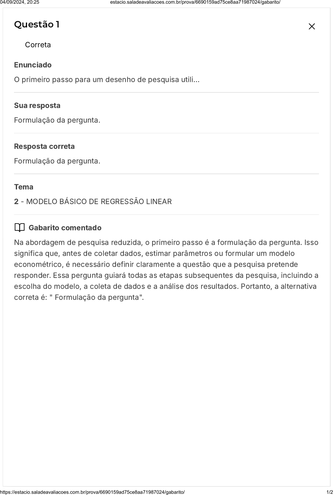 <p>Voltar para Avaliações</p><p>Gabarito da prova</p><p>Confira o gabarito da prova de Introdução À Econometria</p><p>Realizada em 11/07/2024</p><p>Nota 0,9/ 1,0</p><p>O conteúdo do gabarito é apresentado de maneira resumida para preservar a</p><p>integridade do nosso banco de questões.</p><p>Questão Consultar</p><p>Correta</p><p>ID: 654be5a9b5168ccb7466509a</p><p>Correta</p><p>ID: 654be5a9b5168ccb746650ac</p><p>Incorreta</p><p>ID: 654be5a9b5168ccb74665028</p><p>Correta</p><p>ID: 654be5a9b5168ccb7466500a</p><p>Correta</p><p>1</p><p>2</p><p>3</p><p>4</p><p>5</p><p>SM1</p><p>Introdução À Econometria</p><p>Questão 1</p><p>Correta</p><p>Enunciado</p><p>O primeiro passo para um desenho de pesquisa utili...</p><p>Sua resposta</p><p>Formulação da pergunta.</p><p>Resposta correta</p><p>Formulação da pergunta.</p><p>Tema</p><p>2 - MODELO BÁSICO DE REGRESSÃO LINEAR</p><p>Gabarito comentado</p><p>Na abordagem de pesquisa reduzida, o primeiro passo é a formulação da pergunta. Isso</p><p>significa que, antes de coletar dados, estimar parâmetros ou formular um modelo</p><p>econométrico, é necessário definir claramente a questão que a pesquisa pretende</p><p>responder. Essa pergunta guiará todas as etapas subsequentes da pesquisa, incluindo a</p><p>escolha do modelo, a coleta de dados e a análise dos resultados. Portanto, a alternativa</p><p>correta é: " Formulação da pergunta".</p><p>04/09/2024, 20:25 estacio.saladeavaliacoes.com.br/prova/6690159ad75ce8aa71987024/gabarito/</p><p>https://estacio.saladeavaliacoes.com.br/prova/6690159ad75ce8aa71987024/gabarito/ 1/2</p><p>https://estacio.saladeavaliacoes.com.br/avaliacoes/</p><p>ID: 654be5a9b5168ccb74664c38</p><p>Correta</p><p>ID: 654be623b5168ccb74670503</p><p>Correta</p><p>ID: 654be5a9b5168ccb74665136</p><p>Correta</p><p>ID: 662b0f54dcb34ece1253ec8b</p><p>Correta</p><p>ID: 661fcf87dcb34ece12835b50</p><p>Correta</p><p>ID: 654be5a9b5168ccb7466514e</p><p>6</p><p>7</p><p>8</p><p>9</p><p>10</p><p>Encontrou algum problema?</p><p>Você pode copiar o ID da questão, acessar o Campus Virtual �SIA) e abrir</p><p>um requerimento.</p><p>Questão 1</p><p>Correta</p><p>Enunciado</p><p>O primeiro passo para um desenho de pesquisa utili...</p><p>Sua resposta</p><p>Formulação da pergunta.</p><p>Resposta correta</p><p>Formulação da pergunta.</p><p>Tema</p><p>2 - MODELO BÁSICO DE REGRESSÃO LINEAR</p><p>Gabarito comentado</p><p>Na abordagem de pesquisa reduzida, o primeiro passo é a formulação da pergunta. Isso</p><p>significa que, antes de coletar dados, estimar parâmetros ou formular um modelo</p><p>econométrico, é necessário definir claramente a questão que a pesquisa pretende</p><p>responder. Essa pergunta guiará todas as etapas subsequentes da pesquisa, incluindo a</p><p>escolha do modelo, a coleta de dados e a análise dos resultados. Portanto, a alternativa</p><p>correta é: " Formulação da pergunta".</p><p>04/09/2024, 20:25 estacio.saladeavaliacoes.com.br/prova/6690159ad75ce8aa71987024/gabarito/</p><p>https://estacio.saladeavaliacoes.com.br/prova/6690159ad75ce8aa71987024/gabarito/ 2/2</p><p>Voltar para Avaliações</p><p>Gabarito da prova</p><p>Confira o gabarito da prova de Introdução À Econometria</p><p>Realizada em 11/07/2024</p><p>Nota 0,9/ 1,0</p><p>O conteúdo do gabarito é apresentado de maneira resumida para preservar a</p><p>integridade do nosso banco de questões.</p><p>Questão Consultar</p><p>Correta</p><p>ID: 654be5a9b5168ccb7466509a</p><p>Correta</p><p>ID: 654be5a9b5168ccb746650ac</p><p>Incorreta</p><p>ID: 654be5a9b5168ccb74665028</p><p>Correta</p><p>ID: 654be5a9b5168ccb7466500a</p><p>Correta</p><p>1</p><p>2</p><p>3</p><p>4</p><p>5</p><p>SM1</p><p>Introdução À Econometria</p><p>Questão 2</p><p>Correta</p><p>Enunciado</p><p>Assinale a principal e mais comum preocupação de m...</p><p>Sua resposta</p><p>\(\sum_{i=1}^{n} x_i \hat{u_i} = 0\)</p><p>Resposta correta</p><p>\(\sum_{i=1}^{n} x_i \hat{u_i} = 0\)</p><p>Tema</p><p>2 - MODELO BÁSICO DE REGRESSÃO LINEAR</p><p>Gabarito comentado</p><p>A principal e mais comum preocupação de modelos de forma reduzida é que a soma</p><p>dos coeficientes de regressão seja igual a zero. Isso é necessário para garantir que o</p><p>modelo seja linearmente independente.</p><p>04/09/2024, 20:26 estacio.saladeavaliacoes.com.br/prova/6690159ad75ce8aa71987024/gabarito/</p><p>https://estacio.saladeavaliacoes.com.br/prova/6690159ad75ce8aa71987024/gabarito/ 1/2</p><p>https://estacio.saladeavaliacoes.com.br/avaliacoes/</p><p>ID: 654be5a9b5168ccb74664c38</p><p>Correta</p><p>ID: 654be623b5168ccb74670503</p><p>Correta</p><p>ID: 654be5a9b5168ccb74665136</p><p>Correta</p><p>ID: 662b0f54dcb34ece1253ec8b</p><p>Correta</p><p>ID: 661fcf87dcb34ece12835b50</p><p>Correta</p><p>ID: 654be5a9b5168ccb7466514e</p><p>6</p><p>7</p><p>8</p><p>9</p><p>10</p><p>Encontrou algum problema?</p><p>Você pode copiar o ID da questão, acessar o Campus Virtual �SIA) e abrir</p><p>um requerimento.</p><p>Questão 2</p><p>Correta</p><p>Enunciado</p><p>Assinale a principal e mais comum preocupação de m...</p><p>Sua resposta</p><p>\(\sum_{i=1}^{n} x_i \hat{u_i} = 0\)</p><p>Resposta correta</p><p>\(\sum_{i=1}^{n} x_i \hat{u_i} = 0\)</p><p>Tema</p><p>2 - MODELO BÁSICO DE REGRESSÃO LINEAR</p><p>Gabarito comentado</p><p>A principal e mais comum preocupação de modelos de forma reduzida é que a soma</p><p>dos coeficientes de regressão seja igual a zero. Isso é necessário para garantir que o</p><p>modelo seja linearmente independente.</p><p>04/09/2024, 20:26 estacio.saladeavaliacoes.com.br/prova/6690159ad75ce8aa71987024/gabarito/</p><p>https://estacio.saladeavaliacoes.com.br/prova/6690159ad75ce8aa71987024/gabarito/ 2/2</p><p>Voltar para Avaliações</p><p>Gabarito da prova</p><p>Confira o gabarito da prova de Introdução À Econometria</p><p>Realizada em 11/07/2024</p><p>Nota 0,9/ 1,0</p><p>O conteúdo do gabarito é apresentado de maneira resumida para preservar a</p><p>integridade do nosso 