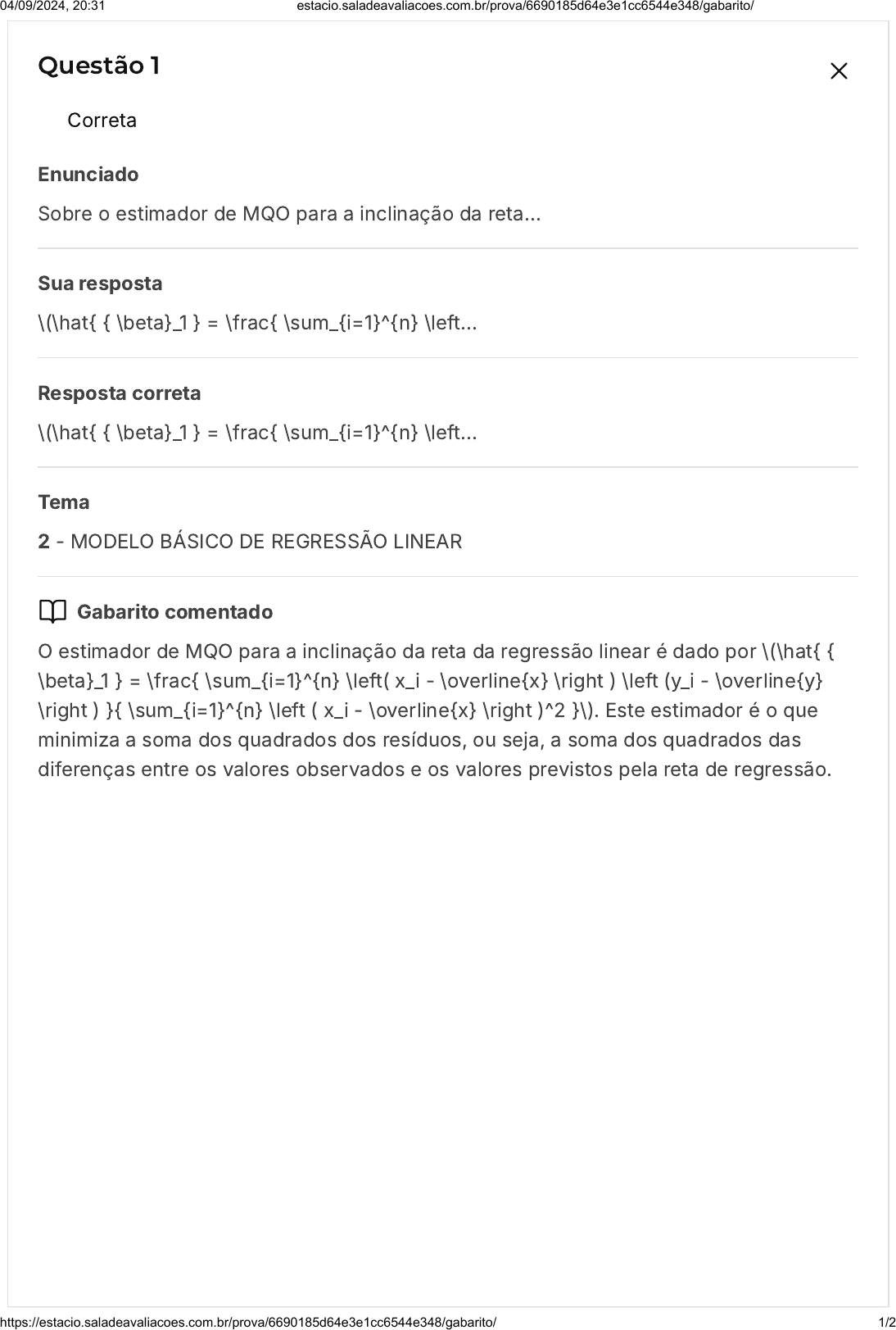 <p>Voltar para Avaliações</p><p>Gabarito da prova</p><p>Confira o gabarito da prova de Introdução À Econometria</p><p>Realizada em 11/07/2024</p><p>Nota 0,9/ 1,0</p><p>O conteúdo do gabarito é apresentado de maneira resumida para preservar a</p><p>integridade do nosso banco de questões.</p><p>Questão Consultar</p><p>Correta</p><p>ID: 654be5a9b5168ccb74664fce</p><p>Correta</p><p>ID: 661fcf87dcb34ece12835b50</p><p>Correta</p><p>ID: 654be5a9b5168ccb7466500a</p><p>Correta</p><p>ID: 654be5a9b5168ccb7466514e</p><p>Correta</p><p>1</p><p>2</p><p>3</p><p>4</p><p>5</p><p>SM2</p><p>Introdução À Econometria</p><p>Questão 1</p><p>Correta</p><p>Enunciado</p><p>Sobre o estimador de MQO para a inclinação da reta...</p><p>Sua resposta</p><p>\(\hat{ { \beta}_1 } = \frac{ \sum_{i=1}^{n} \left...</p><p>Resposta correta</p><p>\(\hat{ { \beta}_1 } = \frac{ \sum_{i=1}^{n} \left...</p><p>Tema</p><p>2 - MODELO BÁSICO DE REGRESSÃO LINEAR</p><p>Gabarito comentado</p><p>O estimador de MQO para a inclinação da reta da regressão linear é dado por \(\hat{ {</p><p>\beta}_1 } = \frac{ \sum_{i=1}^{n} \left( x_i - \overline{x} \right ) \left (y_i - \overline{y}</p><p>\right ) }{ \sum_{i=1}^{n} \left ( x_i - \overline{x} \right )^2 }\). Este estimador é o que</p><p>minimiza a soma dos quadrados dos resíduos, ou seja, a soma dos quadrados das</p><p>diferenças entre os valores observados e os valores previstos pela reta de regressão.</p><p>04/09/2024, 20:31 estacio.saladeavaliacoes.com.br/prova/6690185d64e3e1cc6544e348/gabarito/</p><p>https://estacio.saladeavaliacoes.com.br/prova/6690185d64e3e1cc6544e348/gabarito/ 1/2</p><p>https://estacio.saladeavaliacoes.com.br/avaliacoes/</p><p>ID: 654be623b5168ccb746704fd</p><p>Correta</p><p>ID: 654be623b5168ccb74670503</p><p>Correta</p><p>ID: 662b10eadcb34ece125409c5</p><p>Correta</p><p>ID: 662b0f54dcb34ece1253ec8b</p><p>Correta</p><p>ID: 654be5a9b5168ccb7466509a</p><p>Incorreta</p><p>ID: 654be5a9b5168ccb74665034</p><p>6</p><p>7</p><p>8</p><p>9</p><p>10</p><p>Encontrou algum problema?</p><p>Você pode copiar o ID da questão, acessar o Campus Virtual �SIA) e abrir um</p><p>requerimento.</p><p>Questão 1</p><p>Correta</p><p>Enunciado</p><p>Sobre o estimador de MQO para a inclinação da reta...</p><p>Sua resposta</p><p>\(\hat{ { \beta}_1 } = \frac{ \sum_{i=1}^{n} \left...</p><p>Resposta correta</p><p>\(\hat{ { \beta}_1 } = \frac{ \sum_{i=1}^{n} \left...</p><p>Tema</p><p>2 - MODELO BÁSICO DE REGRESSÃO LINEAR</p><p>Gabarito comentado</p><p>O estimador de MQO para a inclinação da reta da regressão linear é dado por \(\hat{ {</p><p>\beta}_1 } = \frac{ \sum_{i=1}^{n} \left( x_i - \overline{x} \right ) \left (y_i - \overline{y}</p><p>\right ) }{ \sum_{i=1}^{n} \left ( x_i - \overline{x} \right )^2 }\). Este estimador é o que</p><p>minimiza a soma dos quadrados dos resíduos, ou seja, a soma dos quadrados das</p><p>diferenças entre os valores observados e os valores previstos pela reta de regressão.</p><p>04/09/2024, 20:31 estacio.saladeavaliacoes.com.br/prova/6690185d64e3e1cc6544e348/gabarito/</p><p>https://estacio.saladeavaliacoes.com.br/prova/6690185d64e3e1cc6544e348/gabarito/ 2/2</p><p>Voltar para Avaliações</p><p>Gabarito da prova</p><p>Confira o gabarito da prova de Introdução À Econometria</p><p>Realizada em 11/07/2024</p><p>Nota 0,9/ 1,0</p><p>O conteúdo do gabarito é apresentado de maneira resumida para preservar a</p><p>integridade do nosso banco de questões.</p><p>Questão Consultar</p><p>Correta</p><p>ID: 654be5a9b5168ccb74664fce</p><p>Correta</p><p>ID: 661fcf87dcb34ece12835b50</p><p>Correta</p><p>ID: 654be5a9b5168ccb7466500a</p><p>Correta</p><p>ID: 654be5a9b5168ccb7466514e</p><p>Correta</p><p>1</p><p>2</p><p>3</p><p>4</p><p>5</p><p>SM2</p><p>Introdução À Econometria</p><p>Questão 2</p><p>Correta</p><p>Enunciado</p><p>Assinale a definição correta sobre m...</p><p>Sua resposta</p><p>\�1 � R^2 = \frac { SQR } { SQT }.\)</p><p>Resposta correta</p><p>\�1 � R^2 = \frac { SQR } { SQT }.\)</p><p>Tema</p><p>2 - MODELO BÁSICO DE REGRESSÃO LINEAR</p><p>Gabarito comentado</p><p>A definição correta sobre métricas para a qualidade da regressão linear é: \�1 � R^2 =</p><p>\frac { SQR } { SQT }.\)</p><p>A métrica \�R^2\� é uma medida de ajuste do modelo de regressão linear. Ela indica a</p><p>proporção da variância da variável dependente que é explicada pela variável</p><p>independente. O valor de \�R^2\� varia de 0 a 1, sendo que quanto mais próximo de 1,</p><p>melhor o ajuste do modelo. A métrica \�R^2\�é calculada como a razão entre a variância</p><p>explicada e a variância total. A variância explicada é a variância da variável dependente</p><p>que é explicada pela variável independente. A variância total é a variância total da</p><p>variável dependente. A métrica \�R^2\� é uma medida útil para avaliar a qualidade do</p><p>modelo de regressão linear. Ela pode ser usada para comparar diferentes modelos de</p><p>regressão linear e para selecionar o modelo que melhor se ajusta aos dados.</p><p>04/09/2024, 20:32 estacio.saladeavaliacoes.com.br/prova/6690185d64e3e1cc6544e348/gabarito/</p><p>https://estacio.saladeavaliacoes.com.br/prova/6690185d64e3e1cc6544e348/gabarito/ 1/2</p><p>https://estacio.saladeavaliacoes.com.br/avaliacoes/</p><p>ID: 654be623b5168ccb746704fd</p><p>Correta</p><p>ID: 654be623b5168ccb74670503</p><p>Correta</p><p>ID: 662b10eadcb34ece125409c5</p><p>Correta</p><p>ID: 662b0f54dcb34ece1253ec8b</p><p>Correta</p><p>ID: 654be5a9b5168ccb7466509a</p><p>Incorreta</p><p>ID: 654be5a9b5168ccb74665034</p><p>6</p><p>7</p><p>8</p><p>9</p><p>10</p><p>Encontrou algum problema?</p><p>Você pode copiar o ID da questão, acessar o Campus Virtual �SIA) e abrir um</p><p>requerimento.</p><p>Questão 2</p><p>Correta</p><p>Enunciado</p><p>Assinale a definição correta sobre m...</p><p>Sua resposta</p><p>\�1 � R^2 = \frac { SQR } { SQT }.\)</p><p>Resposta correta</p><p>\�1 � R^2 = \