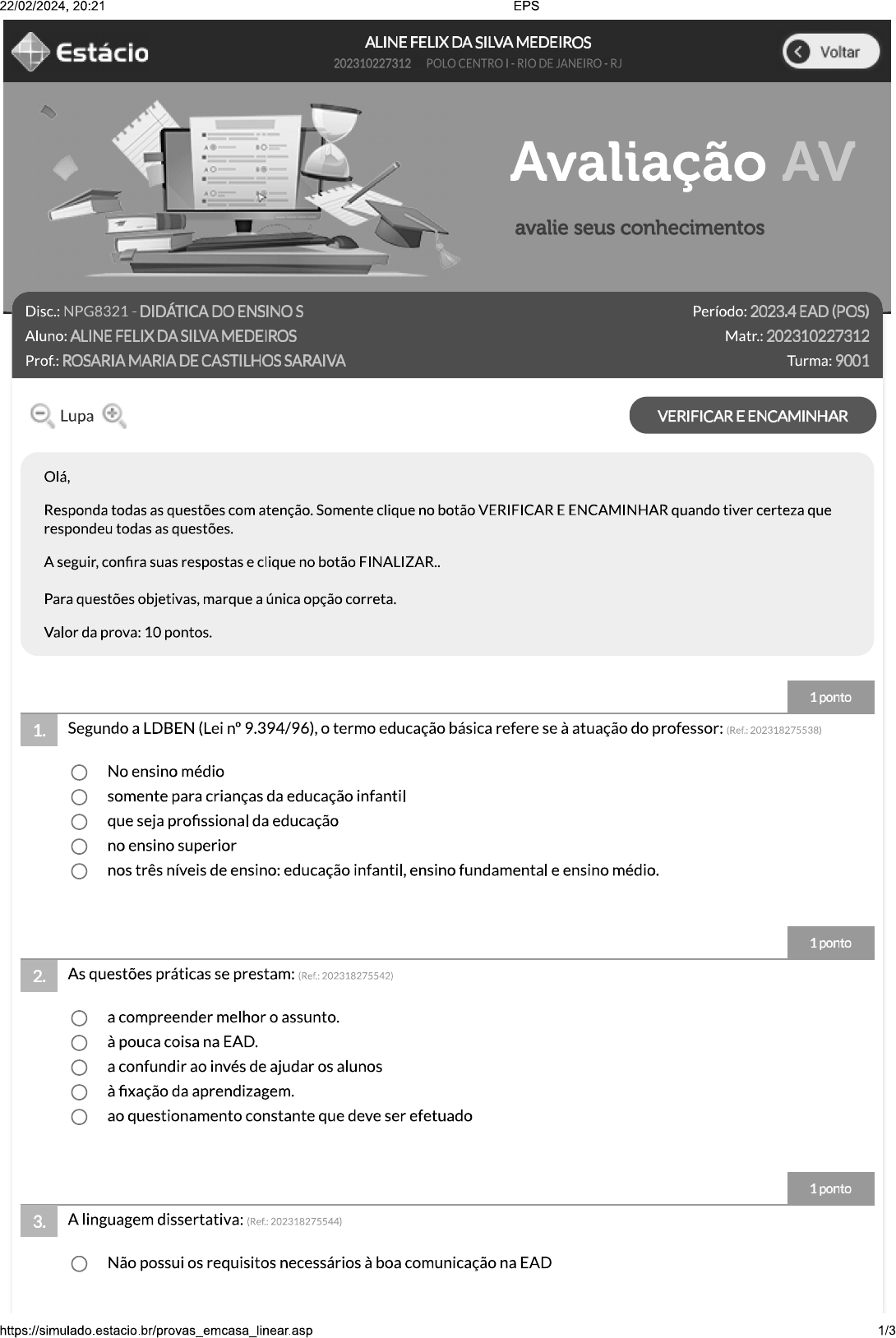 <p>22/02/2024, 20:21 EPS ALINEFELIXDASILVAMEDEIROS Estácio Voltar 202310227312 POLO CENTRO RIO DE JANEIRO RJ Avaliação AV avalie seus conhecimentos Disc.: NPG8321 - DIDÁTICA DO ENSINO S Período: 2023.4 EAD (POS) Aluno: ALINE FELIX DA SILVA MEDEIROS Matr.: 202310227312 Prof.: ROSARIA MARIA DE CASTILHOS SARAIVA Turma: 9001 Lupa VERIFICAR E ENCAMINHAR Olá, Responda todas as questões com atenção. Somente clique no botão VERIFICAR E ENCAMINHAR quando tiver certeza que respondeu todas as questões. A seguir, confira suas respostas e clique no botão FINALIZAR.. Para questões objetivas, marque a única opção correta. Valor da prova: 10 pontos. 1 ponto 1. Segundo a LDBEN (Lei n° 9.394/96), o termo educação básica refere se à atuação do professor: (Ref.: 202318275538) No ensino médio somente para crianças da educação infantil que seja profissional da educação no ensino superior nos três níveis de ensino: educação infantil, ensino fundamental e ensino médio. 1 ponto 2. As questões práticas se prestam: (Ref.: 202318275542) a compreender melhor o assunto. à pouca coisa na EAD. a confundir ao invés de ajudar os alunos à fixação da aprendizagem. ao questionamento constante que deve ser efetuado 1 ponto 3. A linguagem dissertativa: (Ref.: 202318275544) Não possui os requisitos necessários à boa comunicação na EAD 1/3</p><p>22/02/2024, 20:21 EPS Possui os requisitos necessários à boa comunicação na EAD, desde que usada em conjunto com as outras formas de linguagem. Não prejudica as exposições da educação a distância Nunca deve ser usada na EAD. Somente às vezes mostra-se útil para a EAD. 1 ponto 4. Quanto à associação verbo-pictórica em EAD: (Ref.: 202318275540) Facilita a aprendizagem. Não garante boa qualidade É irrelevante. Dificulta a aprendizagem. É inócua. 1 ponto 5. Precisamos acabar com esse mito de que a avaliação é punitiva e ameaçadora e compreender que avaliar a aprendizagem dos alunos é uma das funções do professor. Deve-se lembrar que: (Ref.: 202318275534) Os professores devem agir como juízes implacáveis, prontos para punir qualquer sinal de fraqueza acadêmica. o professor deve estar preparado para avaliar o aluno dentro do que o sistema cobra, por meio de testes e provas. ela deve apenas exigir a tipologia conceitual, não sendo necessário, nessa fase saber se aquilo que o aluno aprendeu ele vivenciou, se mudou suas atitudes. ela deve servir como um retorno de como está o processo de ensino- aprendizagem, como os alunos estão aprendendo, se estão realmente aprendendo, como o professor está ensinando. a avaliação precisa ser punitiva e ameaçadora, só assim o aluno estudará para as provas. 1 ponto 6. Os objetivos específicos referem-se a: (Ref.: 202318275548) Unidades de ensino Conhecimentos, atitudes e habilidades Conhecimento e valores atitudes e ações. valores e habilidades 1 ponto 7. Os objetivos específicos da EAD: (Ref.: 202318275547) Em alguns casos chegam a ser contraindicados. Em alguns cursos são fundamentais e em outros não. São sempre fundamentais, porque explicitam as realizações operacionais do conteúdo do curso. São opcionais ao projeto de curso, pois podem ou não ser apresentados. Esforços envolvidos propiciam o desempenho esperado 1 ponto 8. Quanto às reflexões de caráter crítico, a EAD: (Ref.: https://simulado.estacio.br/provas_emcasa_linear.a 2/3</p><p>22/02/2024, 20:21 EPS Pode ser utilizada em conteúdo que possibilitem sua introdução Só pode ser utilizada nas Ciências Humanas Não pode ser utilizada É proibido Pode ser utilizada em todos os conteúdos disciplinares 1 ponto 9. A didática contribui com a formação pedagógica do professor porque ela investiga, como ciência: (Ref.: 202318275537) o processo de ensinar e aprender. o modo como se deve ensinar Como dar aula EAD o projeto pedagógico de um curso. a educação escolar 1 ponto 10. A aula expositiva sempre fez parte da prática docente, independentemente da concepção pedagógica dominante. Esse procedimento de ensino, embora amplamente questionado, pode ser muito útil na produção da aprendizagem, desde que: (Ref.: 202318275536) o professor continue sendo o único produtor de conhecimentos do grupo o professor assuma uma postura dialógica a mensagem do professor não possa ser contestada seja utilizada apenas para expor novos conteúdos professor deve selecionar um tema para ser debatido em sala VERIFICAR E ENCAMINHAR Não respondida Não gravada Gravada</p>