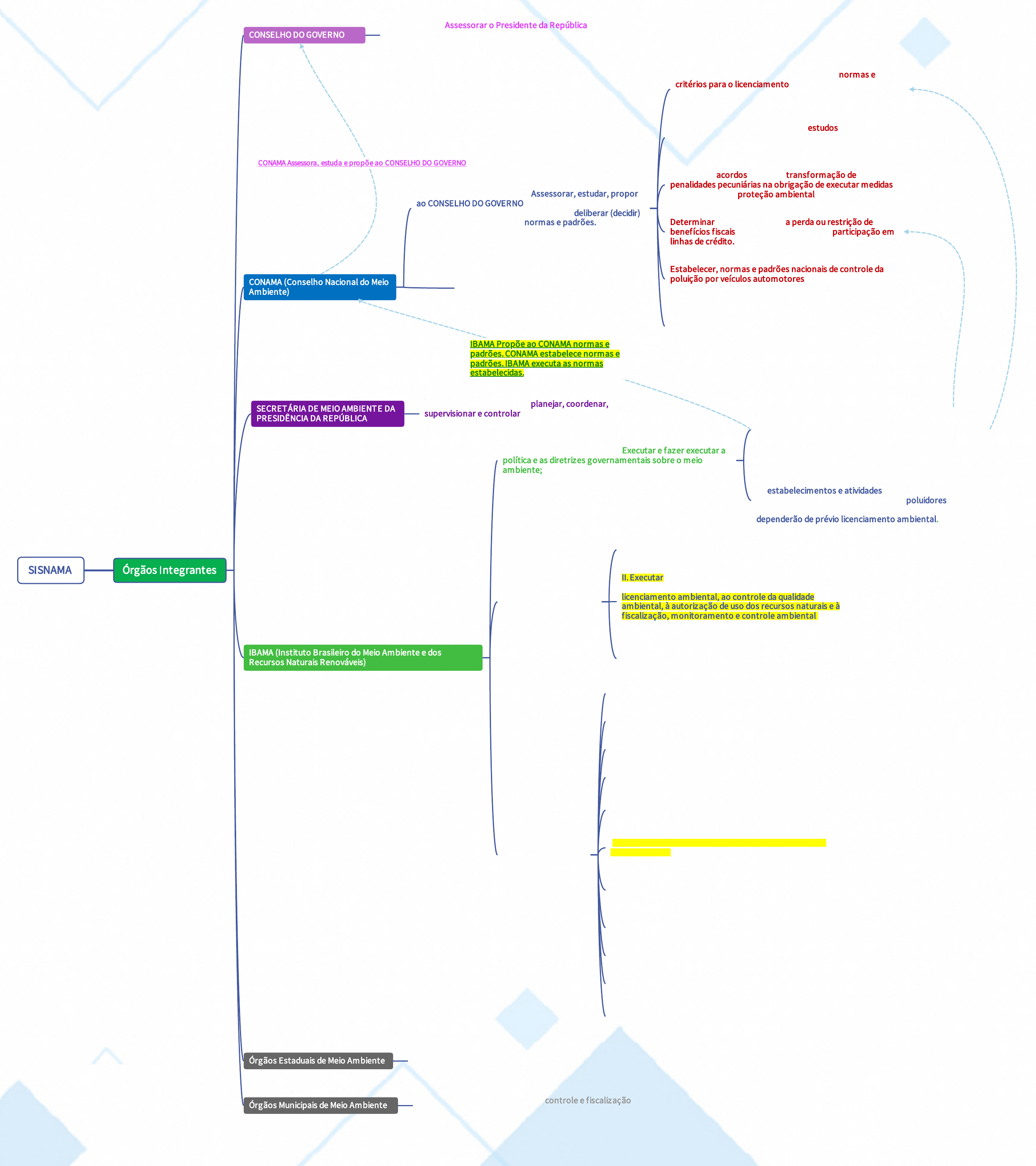 <p>SISNAMA Órgãos�Integrantes</p><p>CONSELHO�DO�GOVERNO</p><p>CONAMA�(Conselho�Nacional�do�Meio</p><p>Ambiente)</p><p>SECRETÁRIA�DE�MEIO�AMBIENTE�DA</p><p>PRESIDÊNCIA�DA�REPÚBLICA</p><p>IBAMA�(Instituto�Brasileiro�do�Meio�Ambiente�e�dos</p><p>Recursos�Naturais�Renováveis)�</p><p>Órgãos�Estaduais�de�Meio�Ambiente</p><p>Órgãos�Municipais�de�Meio�Ambiente</p><p>Órgão�Superior:�Assessorar�o�Presidente�da�República�na</p><p>formulação�da�política�nacional�e�diretrizes</p><p>governamentais�(conselho�em�contato�direto�com</p><p>presidente)</p><p>Órgãos�Locais:�responsáveis�pelo�controle�e�f iscalização</p><p>dessas�atividades,�nas�suas�jurisdições;�</p><p>Órgãos�Seccionais:�Executar�programas,�projetos�e</p><p>também�controle�e�f iscalização�de�atividades�capazes�de</p><p>provocar�degradação�ambiental.�(apenas�órgãos�públicos).</p><p>Órgão�Executores:�Finalidade�de�Executar�e�fazer�executar�a</p><p>política�e�as�diretrizes�governamentais�sobre�o�meio</p><p>ambiente;�</p><p>PRINCIPAIS�ATRIBUIÇÕES</p><p>OUTRAS�ATRIBUIÇÕES</p><p>Propor�e�editar�normas�e�padrões�de�qualidade�ambiental.</p><p>O�zoneamento�e�a�avaliação�de�impactos�ambientais.</p><p>O�licenciamento�ambiental,�nas�atribuições�federais.�</p><p>A�implementação�do�Cadastro�Técnico�Federal.</p><p>A�f iscalização�ambiental�e�a�aplicação�de�penalidades</p><p>administrativas.</p><p>�A�geração�e�a�disseminação�de�informações�relativas�ao</p><p>meio�ambiente.</p><p>�O�monitoramento�ambiental,�principalmente�no�que�diz</p><p>respeito�à�prevenção�e�controle�de�desmatamentos,</p><p>queimadas�e�incêndios�f lorestais.</p><p>O�apoio�às�emergências�ambientais.</p><p>A�execução�de�programas�de�educação�ambiental.</p><p>�A�elaboração�do�sistema�de�informação.</p><p>O�estabelecimento�de�critérios�para�a�gestão�do�uso�dos</p><p>recursos�faunísticos,�pesqueiros�e�f lorestais;�dentre�outros.</p><p>I.�Exercer�o�poder�de�polícia�ambiental;</p><p>II.�Executar�ações�das�políticas�nacionais�de�meio�ambiente,</p><p>referentes�às�atribuições�federais,�relativas�ao</p><p>licenciamento�ambiental,�ao�controle�da�qualidade</p><p>ambiental,�à�autorização�de�uso�dos�recursos�naturais�e�à</p><p>f iscalização,�monitoramento�e�controle�ambiental,</p><p>observadas�as�diretrizes�emanadas�do�Ministério�do�Meio</p><p>Ambiente;�e</p><p>III.�Executar�as�ações�supletivas�de�competência�da�União,</p><p>de�conformidade�com�a�legislação�ambiental�vigente.</p><p>Órgão�Central:�Finalidade�de�planejar,�coordenar,</p><p>supervisionar�e�controlar�a�política�nacional�e�ações</p><p>governamentais�f ixadas.�</p><p>Art.�11�‒�Compete�ao�IBAMA�propor�ao�CONAMA�normas�e</p><p>padrões�para�implantação,�acompanhamento�e</p><p>f iscalização�do�licenciamento�previsto�no�artigo�anterior.</p><p>Além�dos�licenciamentos�oriundos�do�próprio�CONAMA.�</p><p>Art.�10�- �A�construção,�instalação,�ampliação�e�funcionamento</p><p>de�estabelecimentos�e�atividades�utilizadores�de�recursos</p><p>ambientais,�efetiva�ou�potencialmente�poluidores�ou�capazes,</p><p>sob�qualquer�forma,�de�causar�degradação�ambiental</p><p>dependerão�de�prévio�licenciamento�ambiental.��</p><p>Órgão�Consultivo�Deliberativo:�Assessorar,�estudar,�propor</p><p>ao�CONSELHO�DO�GOVERNO�diretrizes�de�politicas</p><p>governamentais�para�o�meio�ambiente�e�deliberar�(decidir),</p><p>dentro�da�sua�competência,�normas�e�padrões.</p><p>Único�com�poder�de�Legislar</p><p>Estabelecer�mediante�proposta�do�IBAMA,�normas�e</p><p>critérios�para�o�licenciamento�de�atividades�efetivamente</p><p>poluidoras,�a�ser�concedido�pelo�ESTADO�e�supervisionado</p><p>pelo�IBAMA;�</p><p>Determinar,�caso�julgue�necessário,�estudos�das</p><p>alternativas�e�das�possíveis�consequências�ambientais�de</p><p>projetos�públicos�e�privados.��</p><p>Homologar�acordos�visando�a�transformação�de</p><p>penalidades�pecuniárias�na�obrigação�de�executar�medidas</p><p>de�interesse�para�proteção�ambiental�</p><p>Determinar,�mediante�IBAMA,�a�perda�ou�restrição�de</p><p>benef ícios�f iscais�e�perda�ou�suspensão�de�participação�em</p><p>linhas�de�crédito.�</p><p>Estabelecer,�normas�e�padrões�nacionais�de�controle�da</p><p>poluição�por�veículos�automotores,�aeronaves�e</p><p>embarcações�</p><p>Estabelecer�normas,�critérios�e�padrões�relativos�ao</p><p>controle�e�à�manutenção�da�qualidade�do�meio�ambiente,</p><p>visando�o�uso�racional�dos�recursos.��</p><p>CONAMA�Assessora,�estuda�e�propõe�ao�CONSELHO�DO�GOVERNO</p><p>IBAMA�Propõe�ao�CONAMA�normas�e</p><p>padrões.�CONAMA�estabelece�normas�e</p><p>padrões.�IBAMA�executa�as�normas</p><p>estabelecidas.</p>
