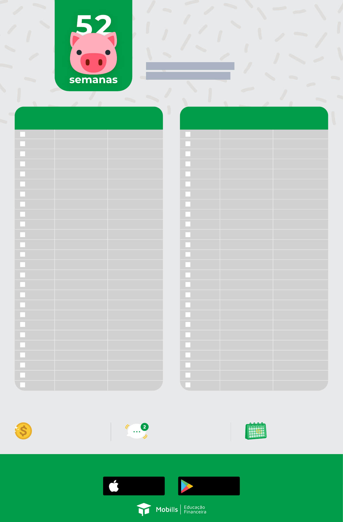 <p>Vantagens do Desafio das 52 semanas</p><p>Crie o hábito de poupar</p><p>e comece o desafio a</p><p>partir de 1 real;</p><p>Receba notificações</p><p>semanais como lembrete</p><p>para os depósitos;</p><p>Acompanhe as tabelas</p><p>de 1, 2 até 5 reais de</p><p>forma automática.</p><p>BAIXE O APP!</p><p>D E S A F I O !</p><p>Aprenda na prática a dizer</p><p>"Não" ao desperdício e às</p><p>compras impulsivas</p><p>Baixar na</p><p>App Store</p><p>Disponível no</p><p>Google Play</p><p>SEMANA</p><p>1</p><p>2</p><p>3</p><p>4</p><p>5</p><p>6</p><p>7</p><p>8</p><p>9</p><p>10</p><p>11</p><p>12</p><p>13</p><p>14</p><p>15</p><p>16</p><p>17</p><p>18</p><p>19</p><p>20</p><p>21</p><p>22</p><p>23</p><p>24</p><p>25</p><p>26</p><p>R$ 10,00</p><p>R$ 20,00</p><p>R$ 30,00</p><p>R$ 40,00</p><p>R$ 50,00</p><p>R$ 60,00</p><p>R$ 70,00</p><p>R$ 80,00</p><p>R$ 90,00</p><p>R$ 100,00</p><p>R$ 110,00</p><p>R$ 120,00</p><p>R$ 130,00</p><p>R$ 140,00</p><p>R$ 150,00</p><p>R$ 160,00</p><p>R$ 170,00</p><p>R$ 180,00</p><p>R$ 190,00</p><p>R$ 200,00</p><p>R$ 210,00</p><p>R$ 220,00</p><p>R$ 230,00</p><p>R$ 240,00</p><p>R$ 250,00</p><p>R$ 260,00</p><p>R$ 10,00</p><p>R$ 30,00</p><p>R$ 60,00</p><p>R$ 100,00</p><p>R$ 150,00</p><p>R$ 210,00</p><p>R$ 280,00</p><p>R$ 360,00</p><p>R$ 450,00</p><p>R$ 550,00</p><p>R$ 660,00</p><p>R$ 780,00</p><p>R$ 910,00</p><p>R$ 1 .050,00</p><p>R$ 1 .200,00</p><p>R$ 1 .360,00</p><p>R$ 1 .530,00</p><p>R$ 1 .710,00</p><p>R$ 1 .900,00</p><p>R$ 2.100,00</p><p>R$ 2.310,00</p><p>R$ 2.530,00</p><p>R$ 2.760,00</p><p>R$ 3.000,00</p><p>R$ 3.250,00</p><p>R$ 3.510,00</p><p>VALOR A</p><p>DEPOSITAR</p><p>VALOR</p><p>ACUMULADO SEMANA</p><p>27</p><p>28</p><p>29</p><p>30</p><p>31</p><p>32</p><p>33</p><p>34</p><p>35</p><p>36</p><p>37</p><p>38</p><p>39</p><p>40</p><p>41</p><p>42</p><p>43</p><p>44</p><p>45</p><p>46</p><p>47</p><p>48</p><p>49</p><p>50</p><p>51</p><p>52</p><p>R$ 270,00</p><p>R$ 280,00</p><p>R$ 290,00</p><p>R$ 300,00</p><p>R$ 310,00</p><p>R$ 320,00</p><p>R$ 330,00</p><p>R$ 340,00</p><p>R$ 350,00</p><p>R$ 360,00</p><p>R$ 370,00</p><p>R$ 380,00</p><p>R$ 390,00</p><p>R$ 400,00</p><p>R$ 410,00</p><p>R$ 420,00</p><p>R$ 430,00</p><p>R$ 440,00</p><p>R$ 450,00</p><p>R$ 460,00</p><p>R$ 470,00</p><p>R$ 480,00</p><p>R$ 490,00</p><p>R$ 500,00</p><p>R$ 510,00</p><p>R$ 520,00</p><p>R$ 3.780,00</p><p>R$ 4 .060,00</p><p>R$ 4 .350,00</p><p>R$ 4 .650,00</p><p>R$ 4 .960,00</p><p>R$ 5.280,00</p><p>R$ 5.610,00</p><p>R$ 5.950,00</p><p>R$ 6.300,00</p><p>R$ 6.660,00</p><p>R$ 7.030,00</p><p>R$ 7.410,00</p><p>R$ 7.800,00</p><p>R$ 8.200,00</p><p>R$ 8.610,00</p><p>R$ 9.030,00</p><p>R$ 9.460,00</p><p>R$ 9.900,00</p><p>R$ 10.350,00</p><p>R$ 10.810,00</p><p>R$ 11 .280,00</p><p>R$ 11 .760,00</p><p>R$ 12 .250,00</p><p>R$ 12 .750,00</p><p>R$ 13.260,00</p><p>R$ 13.780,00</p><p>VALOR A</p><p>DEPOSITAR</p><p>VALOR</p><p>ACUMULADO</p>