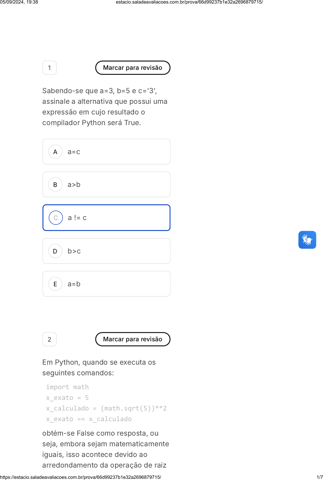 <p>A</p><p>B</p><p>C</p><p>D</p><p>E</p><p>1 Marcar para revisão</p><p>Sabendo-se que a=3, b=5 e c='3',</p><p>assinale a alternativa que possui uma</p><p>expressão em cujo resultado o</p><p>compilador Python será True.</p><p>a=c</p><p>a>b</p><p>a != c</p><p>b>c</p><p>a=b</p><p>2 Marcar para revisão</p><p>Em Python, quando se executa os</p><p>seguintes comandos:</p><p>import math</p><p>x_exato = 5</p><p>x_calculado = (math.sqrt(5))**2</p><p>x_exato == x_calculado</p><p>obtém-se False como resposta, ou</p><p>seja, embora sejam matematicamente</p><p>iguais, isso acontece devido ao</p><p>arredondamento da operação de raiz</p><p>05/09/2024, 19:38 estacio.saladeavaliacoes.com.br/prova/66d99237b1e32a2696879715/</p><p>https://estacio.saladeavaliacoes.com.br/prova/66d99237b1e32a2696879715/ 1/7</p><p>A</p><p>B</p><p>C</p><p>D</p><p>E</p><p>A</p><p>B</p><p>C</p><p>quadrada. Calcule, utilizando o</p><p>Python, o erro relativo dessa</p><p>operação.</p><p>1,5811 � 10�15</p><p>1,5811 � 10�16</p><p>8,8811 � 10�15</p><p>8,8811 � 10�14</p><p>8,8811 � 10�16</p><p>3 Marcar para revisão</p><p>Seja uma matriz A de ordem 30�30,</p><p>foi realizada uma decomposição LU, a</p><p>soma dos elementos da diagonal</p><p>principal da matriz L é:</p><p>30</p><p>26</p><p>27</p><p>05/09/2024, 19:38 estacio.saladeavaliacoes.com.br/prova/66d99237b1e32a2696879715/</p><p>https://estacio.saladeavaliacoes.com.br/prova/66d99237b1e32a2696879715/ 2/7</p><p>D</p><p>E</p><p>A</p><p>B</p><p>C</p><p>D</p><p>E</p><p>28</p><p>29</p><p>4 Marcar para revisão</p><p>O método de Gauss-Jordan</p><p>transforma a matriz A do sistema</p><p>Ax=b, em uma matriz:</p><p>Tridiagonal.</p><p>Triangular inferior.</p><p>Triangular superior.</p><p>Pentadiagonal.</p><p>Identidade.</p><p>5 Marcar para revisão</p><p>Assinale a ÚNICA alternativa que</p><p>apresenta o valor da integral de</p><p>sen (x) no intervalo de 1 a 2. Utilize o</p><p>método de Romberg, com</p><p>aproximação até n = 2�</p><p>2</p><p>05/09/2024, 19:38 estacio.saladeavaliacoes.com.br/prova/66d99237b1e32a2696879715/</p><p>https://estacio.saladeavaliacoes.com.br/prova/66d99237b1e32a2696879715/ 3/7</p><p>A</p><p>B</p><p>C</p><p>D</p><p>E</p><p>A</p><p>B</p><p>C</p><p>D</p><p>E</p><p>0,91651</p><p>0,97651</p><p>0,93651</p><p>0,95651</p><p>0,99651</p><p>6 Marcar para revisão</p><p>Assinale a única alternativa que</p><p>apresenta o valor da integral de x -</p><p>cos(x) no intervalo de 1 a 2. Utilize o</p><p>método de Romberg, com</p><p>aproximação até n = 2�</p><p>1,49217</p><p>1,41217</p><p>1,47217</p><p>1,45217</p><p>1,43217</p><p>05/09/2024, 19:38 estacio.saladeavaliacoes.com.br/prova/66d99237b1e32a2696879715/</p><p>https://estacio.saladeavaliacoes.com.br/prova/66d99237b1e32a2696879715/ 4/7</p><p>A</p><p>B</p><p>C</p><p>D</p><p>E</p><p>7 Marcar para revisão</p><p>Assinale a ÚNICA alternativa que</p><p>apresenta o valor de y(3) em face da</p><p>resolução da EDO de 1ª ordem y'= y ,</p><p>sendo y(0� = 0,3. Considere h = 0,30.</p><p>Utilize o método de Runge-Kutta:</p><p>2</p><p>2,685</p><p>2,785</p><p>2,585</p><p>2,885</p><p>2,985</p><p>8 Marcar para revisão</p><p>Adaptado de Cesgranrio - Concurso</p><p>Petrobrás/2012, cargo: Analista de</p><p>Pesquisa Operacional Júnior</p><p>Considere o seguinte problema de</p><p>programação linear:</p><p>Maximize Z � 2x + 3x - 4x</p><p>Sujeito a:</p><p>x + x + 3x ≤ 15</p><p>x + 2x - x ≤ 20</p><p>x ≥ 0 x ≥ 0 x ≥ 0</p><p>O valor ótimo da função objetivo é:</p><p>1 2 3</p><p>1 2 3</p><p>1 2 3</p><p>1 2 3</p><p>05/09/2024, 19:38 estacio.saladeavaliacoes.com.br/prova/66d99237b1e32a2696879715/</p><p>https://estacio.saladeavaliacoes.com.br/prova/66d99237b1e32a2696879715/ 5/7</p><p>A</p><p>B</p><p>C</p><p>D</p><p>E</p><p>A</p><p>B</p><p>C</p><p>D</p><p>E</p><p>25</p><p>45</p><p>35</p><p>15</p><p>5</p><p>9 Marcar para revisão</p><p>Qual é o formato principal de declarar</p><p>e formatar string no Python 3?</p><p>Aspas duplas e Hashtag</p><p>Aspas duplas e Parênteses</p><p>Aspas simples e Parênteses</p><p>Aspas simples e Aspas</p><p>duplas</p><p>Hashtag e Parênteses</p><p>00</p><p>hora</p><p>: 24</p><p>min</p><p>: 11</p><p>seg</p><p>Ocultar</p><p>Questão 8 de 10</p><p>Respondidas �10� Em branco �0�</p><p>Finalizar prova</p><p>1 2 3 4 5</p><p>6 7 8 9 10</p><p>SM1 Modelagem Matemática</p><p>05/09/2024, 19:38 estacio.saladeavaliacoes.com.br/prova/66d99237b1e32a2696879715/</p><p>https://estacio.saladeavaliacoes.com.br/prova/66d99237b1e32a2696879715/ 6/7</p><p>A</p><p>B</p><p>C</p><p>D</p><p>E</p><p>10 Marcar para revisão</p><p>�CESGRANRIO/2011 � Adaptada)</p><p>Métodos numéricos são</p><p>fundamentais para a resolução de</p><p>sistemas lineares. Dentre os métodos</p><p>diretos utilizados para a resolução de</p><p>sistemas de equações lineares, estão</p><p>os de</p><p>Decomposição LU e de</p><p>Gauss-Seidel.</p><p>Decomposição LU e de</p><p>Gauss-Jacobi.</p><p>Gauss-Seidel e de Gauss-</p><p>Jordan.</p><p>Eliminação de Gauss e de</p><p>Gauss-Jacobi.</p><p>Eliminação de Gauss e de</p><p>Gauss-Jordan.</p><p>05/09/2024, 19:38 estacio.saladeavaliacoes.com.br/prova/66d99237b1e32a2696879715/</p><p>https://estacio.saladeavaliacoes.com.br/prova/66d99237b1e32a2696879715/ 7/7</p>