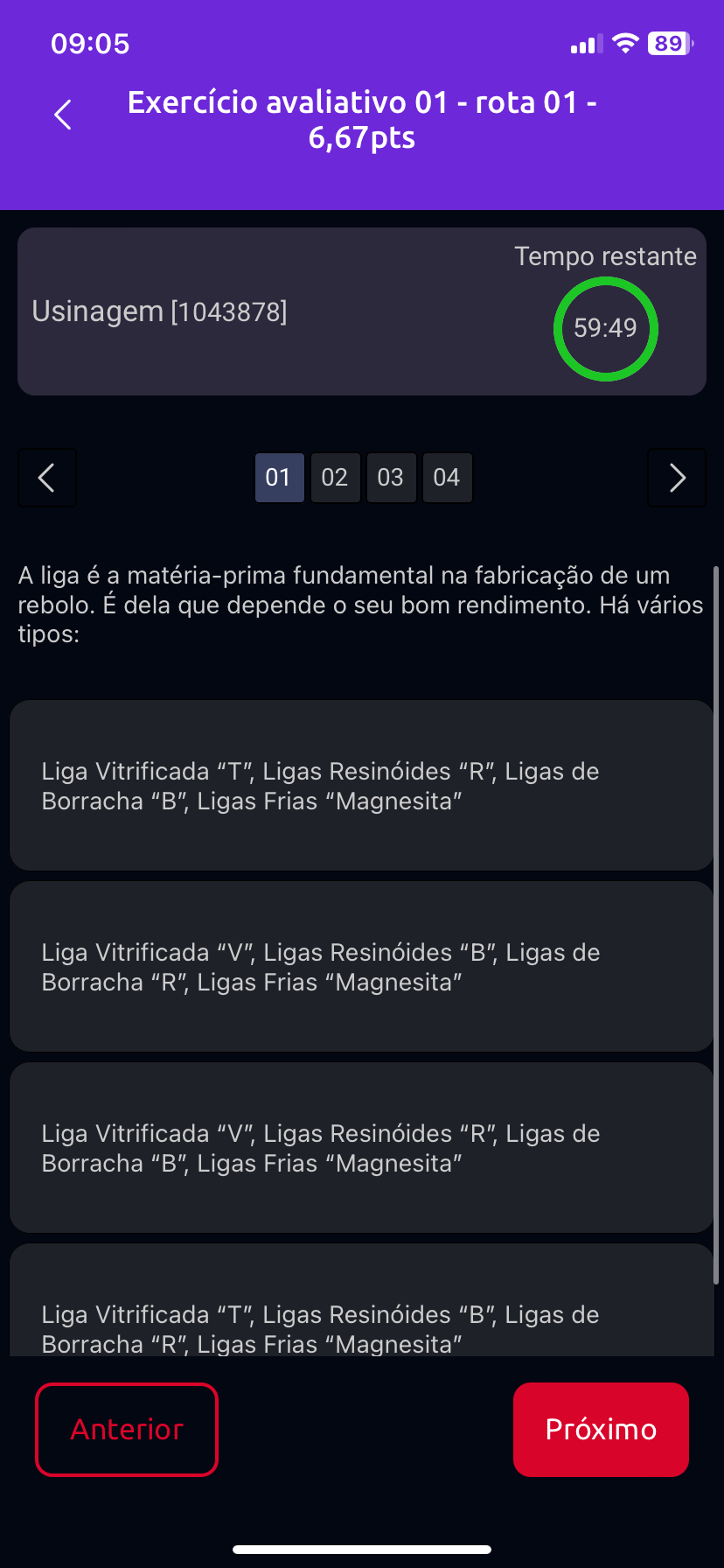 <p>09:05 89 Exercício avaliativo 01 - rota 01 - 6,67pts Tempo restante Usinagem [1043878] 59:49 01 02 03 04 A liga é a matéria-prima fundamental na fabricação de um rebolo. É dela que depende seu bom rendimento. Há vários tipos: Liga Vitrificada "T", Ligas Resinóides "R", Ligas de Borracha "B", Ligas Frias "Magnesita" Liga Vitrificada "V", Ligas Resinóides "B", Ligas de Borracha "R", Ligas Frias "Magnesita" Liga Vitrificada "V", Ligas Resinóides "R", Ligas de Borracha "B", Ligas Frias "Magnesita" Liga Vitrificada "T", Ligas Resinóides Ligas de Borracha "R", Ligas Frias "Magnesita" Anterior Próximo</p>