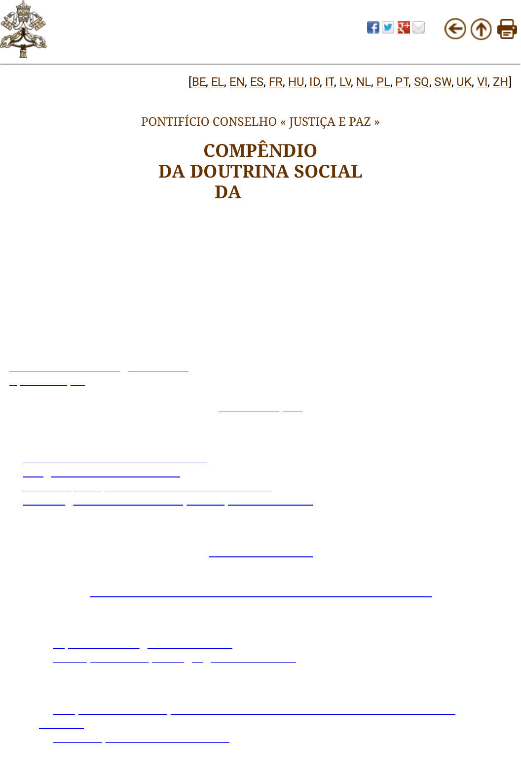 <p>[BE, EL, EN, ES, FR, HU, ID, IT, LV, NL, PL, PT, SQ, SW, UK, VI, ZH]</p><p>PONTIFÍCIO CONSELHO « JUSTIÇA E PAZ »</p><p>COMPÊNDIO</p><p>DA DOUTRINA SOCIAL</p><p>DA IGREJA</p><p>A JOÃO PAULO II</p><p>MESTRE DE DOUTRINA SOCIAL</p><p>TESTEMUNHA EVANGÉLICA</p><p>DE JUSTIÇA E DE PAZ</p><p>ÍNDICE GERAL</p><p>Carta do Cardeal Angelo Sodano</p><p>Apresentação</p><p>INTRODUÇÃO</p><p>UM HUMANISMO INTEGRAL E SOLIDÁRIO</p><p>a) No alvorecer do terceiro milênio</p><p>b) O significado do documento</p><p>c) Ao serviço da plena verdade sobre o homem</p><p>d) Sob o signo da solidariedade, do respeito e do amor</p><p>PRIMEIRA PARTE</p><p>CAPÍTULO I</p><p>O DESÍGNIO DE AMOR DE DEUS A TODA A HUMANIDADE</p><p>I. O AGIR LIBERTADOR DE DEUS NA HISTÓRIA DE ISRAEL</p><p>a) A proximidade gratuita de Deus</p><p>b) Princípio da criação e agir gratuito de Deus</p><p>II. JESUS CRISTO CUMPRIMENTO DO DESÍGNIO DE AMOR DO PAI</p><p>a) Em Jesus Cristo cumpre-se o evento decisivo da história de Deus com os</p><p>homens</p><p>b) A revelação do Amor Trinitário</p><p>https://www.vatican.va/index.htm</p><p>https://www.vatican.va/index.htm</p><p>https://www.facebook.com/sharer.php?u=</p><p>https://www.facebook.com/sharer.php?u=</p><p>https://twitter.com/home?status=vatican.va:%0A</p><p>https://twitter.com/home?status=vatican.va:%0A</p><p>https://plus.google.com/share?url=</p><p>https://plus.google.com/share?url=</p><p>mailto:</p><p>mailto:</p><p>javascript:history.go(-1)</p><p>javascript:history.go(-1)</p><p>javascript:up()</p><p>javascript:up()</p><p>https://www.vatican.va/roman_curia/pontifical_councils/justpeace/documents/rc_pc_justpeace_doc_20060526_compendio-dott-soc_be.pdf</p><p>https://www.vatican.va/roman_curia/pontifical_councils/justpeace/documents/rc_pc_justpeace_doc_20060526_compendio-dott-soc_el.pdf</p><p>https://www.vatican.va/roman_curia/pontifical_councils/justpeace/documents/rc_pc_justpeace_doc_20060526_compendio-dott-soc_en.html</p><p>https://www.vatican.va/roman_curia/pontifical_councils/justpeace/documents/rc_pc_justpeace_doc_20060526_compendio-dott-soc_sp.html</p><p>https://www.vatican.va/roman_curia/pontifical_councils/justpeace/documents/rc_pc_justpeace_doc_20060526_compendio-dott-soc_fr.html</p><p>https://www.vatican.va/roman_curia/pontifical_councils/justpeace/documents/rc_pc_justpeace_doc_20060526_compendio-dott-soc_hu.html</p><p>https://www.vatican.va/roman_curia/pontifical_councils/justpeace/documents/rc_pc_justpeace_doc_20060526_compendio-dott-soc_id.html</p><p>https://www.vatican.va/roman_curia/pontifical_councils/justpeace/documents/rc_pc_justpeace_doc_20060526_compendio-dott-soc_it.html</p><p>https://www.vatican.va/roman_curia/pontifical_councils/justpeace/documents/rc_pc_justpeace_doc_20060526_compendio-dott-soc_lv.pdf</p><p>https://www.vatican.va/roman_curia/pontifical_councils/justpeace/documents/rc_pc_justpeace_doc_20060526_compendio-dott-soc_nl.html</p><p>https://www.vatican.va/roman_curia/pontifical_councils/justpeace/documents/rc_pc_justpeace_doc_20060526_compendio-dott-soc_pl.html</p><p>https://www.vatican.va/roman_curia/pontifical_councils/justpeace/documents/rc_pc_justpeace_doc_20060526_compendio-dott-soc_po.html</p><p>https://www.vatican.va/roman_curia/pontifical_councils/justpeace/documents/rc_pc_justpeace_doc_20060526_compendio-dott-soc_sq.html</p><p>https://www.vatican.va/roman_curia/pontifical_councils/justpeace/documents/rc_pc_justpeace_doc_20060526_compendio-dott-soc_sw.html</p><p>https://www.vatican.va/roman_curia/pontifical_councils/justpeace/documents/rc_pc_justpeace_doc_20060526_compendio-dott-soc_uk.pdf</p><p>https://www.vatican.va/roman_curia/pontifical_councils/justpeace/documents/rc_pc_justpeace_doc_20060526_compendio-dott-soc_vi.html</p><p>https://www.vatican.va/roman_curia/pontifical_councils/justpeace/documents/rc_pc_justpeace_doc_20060526_compendio-dott-soc_zh.pdf</p><p>III. A PESSOA HUMANA NO DESÍGNIO DE AMOR DE DEUS</p><p>a) O Amor trinitário, origem e meta da pessoa humana</p><p>b) A salvação cristã: para todos os homens e do homem todo</p><p>c) O discípulo de Cristo qual nova criatura</p><p>d) Transcendência da salvação e autonomia das realidades terrestres</p><p>IV. DESÍGNIO DE DEUS E MISSÃO DA IGREJA</p><p>a) A Igreja, sinal e tutela da transcendência da pessoa humana</p><p>b) Igreja, Reino de Deus e renovação das relações sociais</p><p>c) Novos céus e nova terra</p><p>d) Maria e o Seu «fiat» ao desígnio de amor de Deus</p><p>CAPÍTULO II</p><p>MISSÃO DA IGREJA E DOUTRINA SOCIAL</p><p>I. EVANGELIZAÇÃO E DOUTRINA SOCIAL</p><p>a) A Igreja, morada de Deus com os homens</p><p>b) Fecundar e fermentar com o Evangelho a sociedade</p><p>c) Doutrina social, evangelização e promoção humana</p><p>d) Direito e dever da Igreja</p><p>II. A NATUREZA DA DOUTRINA SOCIAL</p><p>a) Um saber iluminado pela fé</p><p>b) Em diálogo cordial com todo o saber</p><p>c) Expressão do ministério de ensinamento da Igreja</p><p>d) Por uma sociedade reconciliada na justiça e no amor</p><p>e) Uma mensagem para os filhos da Igreja e para a humanidade</p><p>f) No signo da continuidade e da renovação</p><p>III. A DOUTRINA SOCIAL DO NOSSO TEMPO: ACENOS HISTÓRICOS</p><p>a) O início de um novo caminho</p><p>b) Da «Rerum novarum» aos nossos dias</p><p>c) À luz e sob o impulso do Evangelho</p><p>CAPÍTULO III</p><p>A PESSOA E OS SEUS DIREITOS</p><p>I. DOUTRINA SOCIAL E PRINCÍPIO PERSONALISTA</p><p>II. A PESSOA HUMANA «IMAGO DEI»</p><p>a) Criatura à imagem de Deus</p><p>b) O drama do pecado</p><p>c) Universalidade do pecado e universalidade da salvação</p><p>III. A PESSOA HUMANA E OS SEUS VÁRIOS PERFIS</p><p>A) A UNIDADE DA PESSOA</p><p>B) ABERTURA À TRANSCENDÊNCIA E UNICIDADE DA PESSOA</p><p>a) Aberta à transcendência</p><p>b) Única e irrepetível</p><p>c) O respeito da dignidade humana</p><p>C) A LIBERDADE DA PESSOA</p><p>a) Valor e limites da liberdade</p><p>b) O vínculo da liberdade com a verdade e a lei natural</p><p>D) A