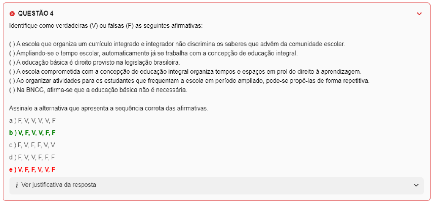 <p>QUESTÃO 4 Identifique como verdadeiras (V) ou falsas (F) as seguintes afirmativas: A escola que organiza um currículo integrado e integrador não discrimina os saberes que advêm da comunidade Ampliando-se o tempo escolar, automaticamente já se trabalha com a concepção de educação () A educação básica é direito previsto na legislação brasileira. A escola comprometida com a concepção de educação integral organiza tempos e espaços em prol do direito à aprendizagem. Ao organizar atividades para os estudantes que frequentam a escola em período ampliado, pode-se propô-las de forma repetitiva. Na BNCC, afirma-se que a educação básica não é necessária. Assinale a alternativa que apresenta a sequência correta das afirmativas. b F V F F i Ver justificativa da resposta</p>