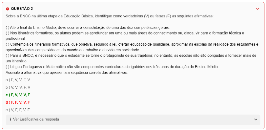 <p>QUESTÃO 2 Sobre a BNCC na última etapa da Educação Básica, identifique como verdadeiras (V) ou falsas (F) as seguintes afirmativas: ( Até o final do Ensino Médio, deve ocorrer a consolidação de uma das dez competências gerais. Nos itinerários formativos, os alunos podem se aprofundar em uma ou mais áreas do conhecimento ou, ainda, vir para a formação técnica e profissional Contempla os itinerários formativos, que objetiva, segundo a lei, ofertar educação de qualidade, aproximar as escolas da realidade dos estudantes e aproximá-los das complexidades do mundo do trabalho e da vida em Para a BNCC, é necessário que o estudante se torne o protagonista de sua trajetória; no entanto, as escolas não são obrigadas a fornecer mais de um Língua Portuguesa e Matemática não são componentes curriculares obrigatórios nos três anos de duração do Ensino Médio. Assinale a alternativa que apresenta a sequência correta das afirmativas. a b i Ver justificativa da resposta</p>