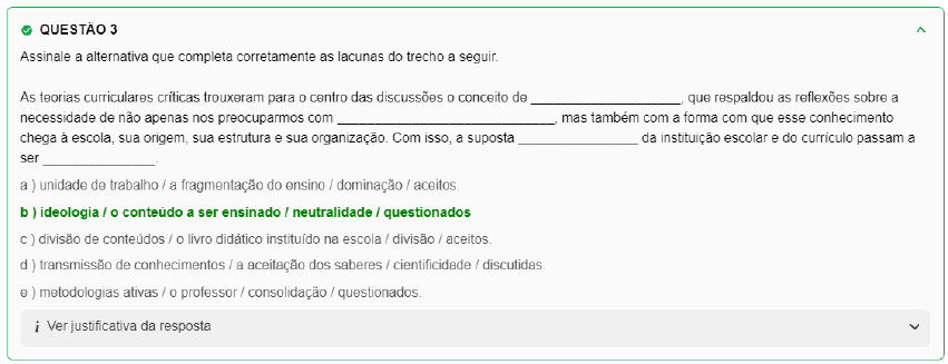 <p>QUESTÃO 3 Assinale a alternativa que completa corretamente as lacunas do trecho a seguir. As teorias curriculares críticas trouxeram para centro das discussões o conceito de que respaldou as reflexões sobre a necessidade de não apenas nos preocuparmos com mas também com a forma com que esse conhecimento chega à escola, sua origem, sua estrutura e sua organização. Com isso, a suposta da instituição escolar e do currículo passam a ser a ) unidade de trabalho / a fragmentação do ensino / dominação / b ) ideologia / o conteúdo a ser ensinado / neutralidade / questionados C ) divisão de conteúdos / o livro didático instituído na escola / divisão / aceitos. d) transmissão de conhecimentos / a aceitação dos saberes / cientificidade / e) metodologias ativas / o professor / consolidação / questionados. i Ver justificativa da resposta</p>