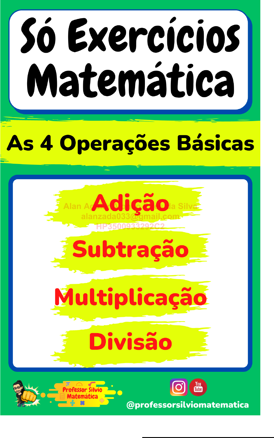 <p>1</p><p>Autor: Silvio José Pereira Galvão</p><p>Alan Aguiar Alonso Pires da Silva</p><p>alanzada033@gmail.com</p><p>HP3500933292C2</p><p>2</p><p>Atividade 01: Arme e efetue as operações de adição (soma).</p><p>1) 39 + 2</p><p>2) 71 + 6</p><p>3) 62 + 8</p><p>4) 80 + 4</p><p>5) 17 + 9</p><p>6) 25 + 5</p><p>7) 53 + 7</p><p>8) 68 + 1</p><p>9) 90 + 2</p><p>10) 13 + 6</p><p>11) 57 + 5</p><p>12) 83 + 8</p><p>13) 42 + 9</p><p>14) 30 + 6</p><p>15) 89 + 4</p><p>16) 49 + 7</p><p>17) 28 + 5</p><p>18) 10 + 2</p><p>19) 64 + 6</p><p>20) 22 + 4</p><p>21) 77 + 1</p><p>22) 14 + 9</p><p>23) 45 + 8</p><p>24) 32 + 5</p><p>25) 59 + 6</p><p>26) 96 + 3</p><p>27) 15 + 2</p><p>28) 23 + 8</p><p>29) 87 + 4</p><p>30) 55 + 9</p><p>31) 19 + 6</p><p>32) 74 + 4</p><p>33) 20 + 7</p><p>34) 36 + 6</p><p>35) 11 + 5</p><p>36) 61 + 3</p><p>37) 44 + 8</p><p>38) 76 + 1</p><p>39) 93 + 6</p><p>40) 27 + 9</p><p>41) 70 + 7</p><p>42) 56 + 4</p><p>43) 35 + 6</p><p>44) 81 + 8</p><p>45) 18 + 1</p><p>46) 97 + 2</p><p>47) 48 + 6</p><p>48) 67 + 4</p><p>49) 31 + 7</p><p>50) 19 + 6</p><p>51) 84 + 15</p><p>52) 23 + 27</p><p>53) 75 + 16</p><p>54) 60 + 53</p><p>55) 12 + 71</p><p>56) 86 + 48</p><p>57) 40 + 39</p><p>58) 65 + 12</p><p>59) 17 + 95</p><p>60) 92 + 60</p><p>61) 38 + 8</p><p>62) 50 + 23</p><p>63) 16 + 42</p><p>64) 91 + 64</p><p>65) 24 + 76</p><p>66) 54 + 51</p><p>67) 46 + 98</p><p>68) 79 + 35</p><p>69) 11 + 10</p><p>70) 66 + 57</p><p>71) 21 + 46</p><p>72) 95 + 89</p><p>73) 18 + 31</p><p>74) 34 + 66</p><p>75) 73 + 29</p><p>76) 15 + 55</p><p>77) 99 + 18</p><p>78) 43 + 93</p><p>79) 69 + 67</p><p>80) 85 + 45</p><p>81) 26 + 25</p><p>82) 78 + 80</p><p>83) 32 + 2</p><p>84) 58 + 59</p><p>85) 98 + 37</p><p>86) 33 + 50</p><p>87) 88 + 22</p><p>88) 47 + 74</p><p>89) 94 + 91</p><p>90) 14 + 14</p><p>91) 72 + 70</p><p>92) 26 + 4</p><p>93) 37 + 86</p><p>94) 82 + 63</p><p>95) 51 + 19</p><p>96) 29 + 88</p><p>97) 63 + 33</p><p>98) 12 + 54</p><p>99) 10 + 63</p><p>100) 25 + 60</p><p>Alan Aguiar Alonso Pires da Silva</p><p>alanzada033@gmail.com</p><p>HP3500933292C2</p><p>3</p><p>Gabarito – Atividade 01</p><p>1) 41</p><p>2) 77</p><p>3) 70</p><p>4) 84</p><p>5) 26</p><p>6) 30</p><p>7) 60</p><p>8) 69</p><p>9) 92</p><p>10) 19</p><p>11) 62</p><p>12) 91</p><p>13) 51</p><p>14) 36</p><p>15) 93</p><p>16) 56</p><p>17) 33</p><p>18) 12</p><p>19) 70</p><p>20) 26</p><p>21) 78</p><p>22) 23</p><p>23) 53</p><p>24) 37</p><p>25) 65</p><p>26) 99</p><p>27) 17</p><p>28) 31</p><p>29) 91</p><p>30) 64</p><p>31) 25</p><p>32) 78</p><p>33) 27</p><p>34) 42</p><p>35) 16</p><p>36) 64</p><p>37) 52</p><p>38) 77</p><p>39) 99</p><p>40) 36</p><p>41) 77</p><p>42) 60</p><p>43) 41</p><p>44) 89</p><p>45) 19</p><p>46) 99</p><p>47) 54</p><p>48) 71</p><p>49) 38</p><p>50) 25</p><p>51) 99</p><p>52) 50</p><p>53) 91</p><p>54) 113</p><p>55) 83</p><p>56) 134</p><p>57) 79</p><p>58) 77</p><p>59) 112</p><p>60) 152</p><p>61) 46</p><p>62) 73</p><p>63) 58</p><p>64) 155</p><p>65) 100</p><p>66) 105</p><p>67) 144</p><p>68) 114</p><p>69) 21</p><p>70) 123</p><p>71) 67</p><p>72) 184</p><p>73) 49</p><p>74) 100</p><p>75) 102</p><p>76) 70</p><p>77) 117</p><p>78) 136</p><p>79) 136</p><p>80) 130</p><p>81) 51</p><p>82) 158</p><p>83) 34</p><p>84) 117</p><p>85) 135</p><p>86) 83</p><p>87) 110</p><p>88) 121</p><p>89) 185</p><p>90) 28</p><p>91) 142</p><p>92) 30</p><p>93) 123</p><p>94) 145</p><p>95) 70</p><p>96) 117</p><p>97) 96</p><p>98) 66</p><p>99) 73</p><p>100) 85</p><p>Alan Aguiar Alonso Pires da Silva</p><p>alanzada033@gmail.com</p><p>HP3500933292C2</p><p>4</p><p>Atividade 02: Arme e efetue as operações de adição (soma).</p><p>1) 125 + 2</p><p>2) 234 + 9</p><p>3) 321 + 8</p><p>4) 134 + 2</p><p>5) 185 + 5</p><p>6) 243 + 4</p><p>7) 276 + 6</p><p>8) 359 + 1</p><p>9) 158 + 7</p><p>10) 176 + 3</p><p>11) 198 + 4</p><p>12) 354 + 6</p><p>13) 231 + 2</p><p>14) 222 + 8</p><p>15) 412 + 4</p><p>16) 498 + 6</p><p>17) 703 + 5</p><p>18) 562 + 2</p><p>19) 825 + 1</p><p>20) 381 + 4</p><p>21) 906 + 3</p><p>22) 284 + 6</p><p>23) 670 + 7</p><p>24) 591 + 5</p><p>25) 146 + 1</p><p>26) 359 + 43</p><p>27) 208 + 18</p><p>28) 619 + 79</p><p>29) 753 + 52</p><p>30) 492 + 67</p><p>31) 165 + 21</p><p>32) 832 + 89</p><p>33) 720 + 34</p><p>34) 516 + 95</p><p>35) 286 + 60</p><p>36) 109 + 12</p><p>37) 474 + 45</p><p>38) 639 + 87</p><p>39) 751 + 26</p><p>40) 387 + 58</p><p>41) 953 + 94</p><p>42) 810 + 39</p><p>43) 256 + 76</p><p>44) 419 + 50</p><p>45) 685 + 64</p><p>46) 573 + 27</p><p>47) 146 + 83</p><p>48) 835 + 10</p><p>49) 607 + 36</p><p>50) 402 + 71</p><p>51) 132 + 624</p><p>52) 274 + 970</p><p>53) 214 + 148</p><p>54) 147 + 531</p><p>55) 102 + 817</p><p>56) 392 + 359</p><p>57) 301 + 706</p><p>58) 205 + 428</p><p>Alan Aguiar Alonso Pires da Silva</p><p>alanzada033@gmail.com</p><p>HP3500933292C2</p><p>5</p><p>59) 623 + 613</p><p>60) 108 + 885</p><p>61) 480 + 392</p><p>62) 721 + 279</p><p>63) 903 + 546</p><p>64) 379 + 794</p><p>65) 618 + 482</p><p>66) 295 + 661</p><p>67) 804 + 923</p><p>68) 739 + 507</p><p>69) 531 + 135</p><p>70) 671 + 846</p><p>71) 920 + 210</p><p>72) 284 + 759</p><p>73) 157 + 464</p><p>74) 496 + 593</p><p>75) 758 + 871</p><p>76) 604 + 254</p><p>77) 201 + 719</p><p>78) 384 + 986</p><p>79) 543 + 583</p><p>80) 972 + 327</p><p>81) 619 + 675</p><p>82) 352 + 912</p><p>83) 765 + 506</p><p>84) 837 + 138</p><p>85) 102 + 892</p><p>86) 408 + 430</p><p>87) 527 + 768</p><p>88) 936 + 589</p><p>89) 820 + 104</p><p>90) 195 + 227</p><p>91) 394 + 879</p><p>92) 672 + 645</p><p>93) 581 + 521</p><p>94) 714 + 394</p><p>95) 263 + 740</p><p>96) 579 + 968</p><p>97) 431 + 145</p><p>98) 826 + 632</p><p>99) 305 + 421</p><p>100) 126 + 253</p><p>Alan Aguiar Alonso Pires da Silva</p><p>alanzada033@gmail.com</p><p>HP3500933292C2</p><p>6</p><p>Gabarito – Atividade 02</p><p>1) 127</p><p>2) 243</p><p>3) 329</p><p>4) 136</p><p>5) 190</p><p>6) 247</p><p>7) 282</p><p>8) 360</p><p>9) 165</p><p>10) 179</p><p>11) 202</p><p>12) 360</p><p>13) 233</p><p>14) 230</p><p>15) 416</p><p>16) 504</p><p>17) 708</p><p>18) 564</p><p>19) 826</p><p>20) 385</p><p>21) 909</p><p>