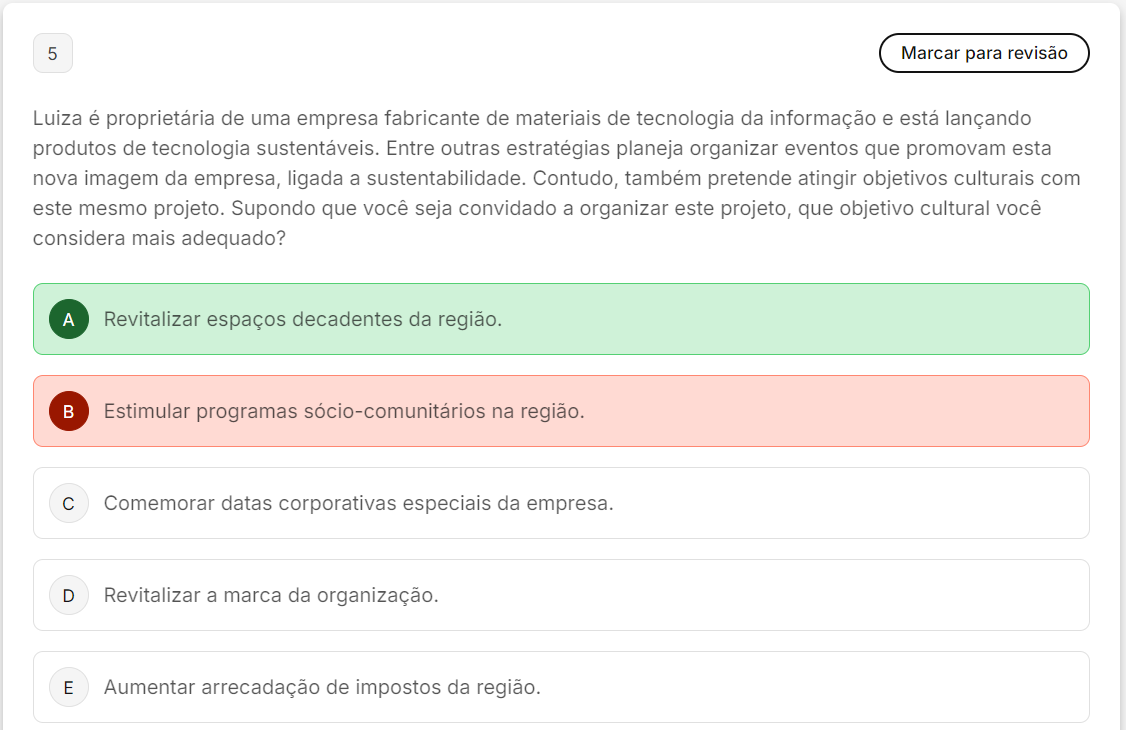 <p>5 Marcar para revisão Luiza é proprietária de uma empresa fabricante de materiais de tecnologia da informação e está lançando produtos de tecnologia sustentáveis. Entre outras estratégias planeja organizar eventos que promovam esta nova imagem da empresa, ligada a sustentabilidade. Contudo, também pretende atingir objetivos culturais com este mesmo projeto. Supondo que você seja convidado a organizar este projeto, que objetivo cultural você considera mais adequado? A Revitalizar espaços decadentes da região. B Estimular programas sócio-comunitários na região. C Comemorar datas corporativas especiais da empresa. D Revitalizar a marca da organização. E Aumentar arrecadação de impostos da região.</p>