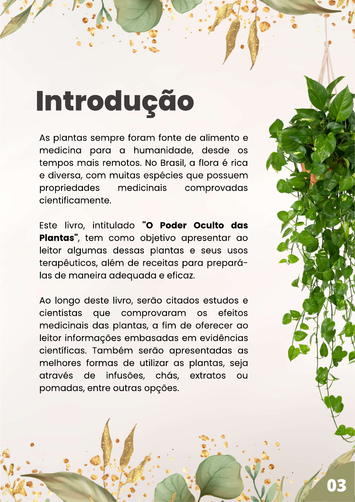 <p>Introdução As plantas sempre foram fonte de alimento e medicina para a humanidade, desde os tempos mais remotos. No Brasil, a flora é rica e diversa, com muitas espécies que possuem propriedades medicinais comprovadas cientificamente. Este livro, intitulado "o Poder Oculto das Plantas", tem como objetivo apresentar ao leitor algumas dessas plantas e seus usos terapêuticos, além de receitas para prepará- las de maneira adequada e eficaz. Ao longo deste livro, serão citados estudos e cientistas que comprovaram os efeitos medicinais das plantas, a fim de oferecer ao leitor informações embasadas em evidências científicas. Também serão apresentadas as melhores formas de utilizar as plantas, seja através de infusões, chás, extratos ou pomadas, entre outras opções. 03</p><p>Serão abordados temas específicos, como as plantas com propriedades analgésicas para o tratamento de dores, como a dor de cabeça, dor muscular, dor de barriga e reumatismo. Além disso, serão apresentadas receitas para o tratamento de diversas doenças, como diabetes, hipertensão, alergias, enxaqueca, problemas de circulação, falta de disposição, problemas de insônia, ansiedade e problemas gástricos. Outro tema importante que será abordado neste livro são os blends de ervas adaptógenos e imunomodeladores, que ajudam a controlar doenças autoimunes e fortalecer o sistema imunológico. Além disso, serão apresentadas plantas e receitas naturais para diminuir a insônia e melhorar a energia, bem como aquelas ricas em cromo, que ajudam no controle da diabetes. 04</p><p>Será dedicado um capítulo específico para apresentar plantas que ajudam a prevenir acúmulo ou infecção de urina e cuidar da inflamação que afeta os músculos do sistema urinário. E, por fim, será apresentado um capítulo para mostrar plantas e receitas naturais que ajudam a melhorar sistema respiratório, trazendo benefícios para o tratamento de diversas condições como a asma e a bronquite. Esperamos que este livro seja útil para aqueles que buscam uma alternativa natural e eficaz para tratar diferentes condições de saúde. Compartilhar o conhecimento sobre as plantas medicinais brasileiras é um ato de amor e cuidado com a nossa saúde e bem-estar. Além dos estudos mais antigos, também existem diversos artigos científicos modernos que comprovam a eficácia do uso de plantas na medicina. Por exemplo, um estudo publicado no Journal of Ethnopharmacology em 2019 avaliou a atividade antioxidante e antimicrobiana de extratos de várias plantas medicinais brasileiras. Os resultados mostraram que essas plantas apresentam potencial para uso em tratamentos de diversas doenças. 05</p><p>Outro estudo recente, publicado na revista Frontiers in Pharmacology em 2020, analisou potencial anti-inflamatório de extratos de plantas medicinais brasileiras em modelos experimentais de artrite. Os resultados indicaram que as plantas estudadas, apresentaram atividade anti-inflamatória significativa e podem ser úteis no tratamento de doenças inflamatórias. Esses são apenas alguns exemplos de artigos científicos que demonstram a eficácia do uso de plantas medicinais. Ao longo deste livro, você encontrará diversos outros estudos e pesquisas que comprovam os efeitos medicinais das plantas e suas propriedades terapêuticas. É importante lembrar que uso de plantas na medicina deve ser sempre acompanhado de orientação médica e respeitando as dosagens e formas corretas de utilização. 06</p><p>SUMÁRIO 08 Capítulo 1 - Plantas medicinais brasileiras com eficácia comprovada cientificamente 14 Capítulo 2 - Propriedades analgésicas de plantas para tratamento de dores 26 Capítulo 3 - Receitas de plantas para tratar e controlar a Diabetes 36 Capítulo 4 - Receitas de plantas para tratar e controlar a Hipertensão 46 Capítulo 5 - Receitas de plantas para tratar e controlar a Enxaqueca 56 Capítulo 6 - Receitas de plantas para tratar e controlar Alergias 64 Capítulo 7 - Receitas de plantas para tratar e controlar Problemas de Circulação 73 Capítulo 8 - Receitas de plantas para tratar e controlar a Falta de Disposição e Aumentar a Energia 81 Capítulo 9 - Receitas de plantas para tratar e controlar a Ansiedade 91 Capítulo 10 - Receitas de plantas para tratar e controlar Problemas 103 Capítulo 11 - Adaptógenos e imunomodeladores para controlar doenças autoimunes 111 Capítulo 12 - Receitas de plantas para tratar e prevenir acúmulo ou infecção de urina e para cuidar da inflamação que afeta os músculos do sistema urinário 123 Capítulo 13 - Plantas e receitas naturais para melhorar sistema respiratório 132 Capítulo 14 - Receitas de plantas para tratar e controlar a Falta de Disposição e Aumentar a Energia 139 Capítulo 15 - As melhores tinturas e blends para uma imunidade poderosa 147 Capítulo 16 - Conclusão 07</p><p>Capítulo 1: Plantas medicinais brasileiras com eficácia comprovada cientificamente</p><p>Capítulo 01 Plantas medicinais brasileiras com eficácia comprovada cientificamente As plantas medicinais têm sido usadas há séculos para tratar diversas doenças e condições de saúde. No Brasil, temos uma grande variedade de plantas com propriedades medicinais, muitas delas com eficácia comprovada cientificamente. Neste capítulo, vamos explorar algumas das principais plantas medicinais brasileiras e os estudos que comprovam seus efeitos terapêuticos. Começando pela famosa planta conhecida como aloe vera, ou babosa, ela tem sido amplamente estudada por sua capacidade de aliviar queimaduras, acelerar a cicatrização de feridas e promover a saúde da pele. 09</p><p>Um estudo realizado pela Universidade Federal de Viçosa, em Minas Gerais, comprovou que o extrato de babosa é eficaz na redução da inflamação e no combate radicais livres, contribuindo para uma pele mais saudável e bonita. Outra planta comum no Brasil é o boldo, amplamente utilizado como chá para problemas digestivos. boldo te