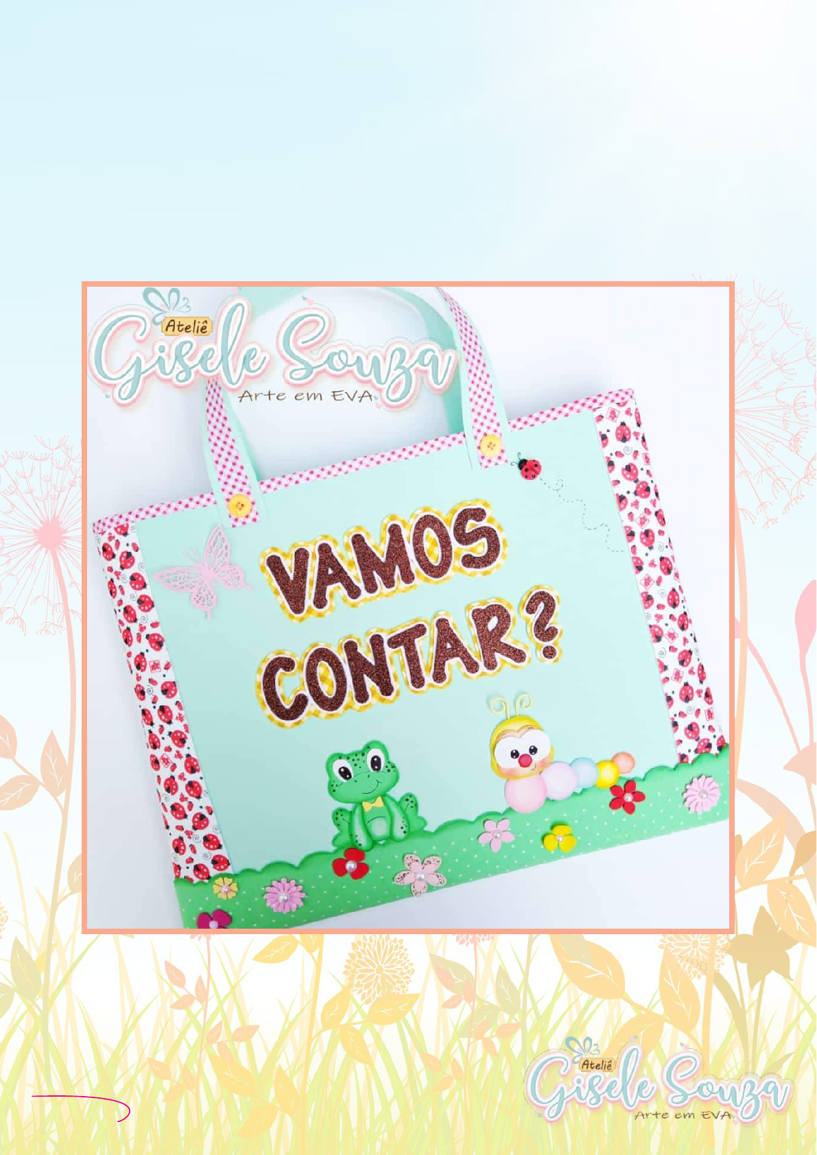<p>Vamos Contar?Vamos Contar?Vamos Contar?</p><p>Apostila Digital</p><p>by Gisele Souza</p><p>Vetorizi</p><p>Produzida por</p><p>É expressamente proibida a venda, compartilhamento ou</p><p>doação deste material ficando sob risco de pena e</p><p>punição judicial. O material a seguir é de pura autoria da</p><p>artesã Gisele Souza e fica expressamente proibido</p><p>qualquer meio de distribuição deste material.</p><p>Termos de UsoTermos de UsoTermos de Uso</p><p>Meu nome é Gisele Souza, artesã de Governador Valadares/MG, 34 anos,</p><p>mineira e apaixonada pelo E.V.A.</p><p>Criei essa apostila para trabalhar os números com as crianças dos anos iniciais.</p><p>Com esses moldes e dicas você poderá confeccionar muitas peças lindas e encantar</p><p>as crianças.</p><p>Lembrando que é proibida a divulgação, compartilhamento, doação ou troca</p><p>desse material, tendo em vista que este conteúdo é de propriedade da Gisele Souza.</p><p>Conto com a sua ética, profissionalismo e compreensão.</p><p>Espero que gostem e sempre que fizerem suas peças não se esqueça de</p><p>postas nas redes sociais e marcar o @ateliegiselesouza.</p><p>Beijos carinhosos,</p><p>Até a próxima!</p><p>Gisele Souza</p><p>ApresentaçãoApresentaçãoApresentação</p><p>E.V.As nas cores:</p><p>- Azul céu de primavera</p><p>- Azul</p><p>- Verde Claro</p><p>- Amarelo Baunilha</p><p>- Amarelo</p><p>- Rosa Bebê</p><p>- Rosa Algodão Doce</p><p>- Laranja</p><p>- Vermelho</p><p>- Preto</p><p>- Branco</p><p>- Lilás</p><p>- Pele ou Bege</p><p>- E.V.A Xadrez Amarelo Light (Para o bolso)</p><p>- E.V.A com glitter marrom (Para os números)</p><p>- 12 metros de viés de sua preferência / Viés estreito - Largura inicial 24mm</p><p>- Largura Parte Externa 18mm</p><p>- 60 palitos de picolé grande</p><p>- Cola quente</p><p>- Cola instantânea</p><p>- Giz pastel oleoso</p><p>- Lápis de cor Tris</p><p>- Caneta Cis Spiro Preta/Azul/Rosa/Vermelha</p><p>- Blush e pincel de aplicar</p><p>- Tinta acrílica fosca branca/preta/ verde oliva</p><p>- Pincel ou cotonete para iluminar</p><p>- Tesoura comum e tesoura escalope (opcional)</p><p>- Régua</p><p>- Palito para riscar E.V.A</p><p>- Apliques de flores variados</p><p>Lista de MateriaisLista de MateriaisLista de Materiais</p><p>- Recorte 10 retângulos 17x27cm (molde na última página da seção “moldes”) e cole</p><p>com cola quente o viés nas bordas só por cima do E.V.A. Agora cole esses retângulos</p><p>por cima de um E.V.A verde claro e recorte deixando uma margem de 1 cm nas</p><p>laterais. Cole novamente sobre o E.V.A azul e recorte deixando mais uma vez uma</p><p>margem de 1 cm em todas as laterais. Se desejar, use a tesoura escalope.</p><p>- Recorte 10 bolsos xadrez e passe a carretilha em volta de todas as extremidades</p><p>para fazer um efeito de costurinha. Passe cola instantânea nas laterais e na parte de</p><p>baixo do bolso, posicione e cole o bolso na base. Agora cole os números</p><p>- Monte os bichinhos de E.V.A e cole-os em cima de outro E.V.A da cor de sua</p><p>preferência para fazer o forro, recorte deixando uma margem de 2mm. Cole os</p><p>bichinhos na ponta dos palitos de picolé com a cola quente.</p><p>-Medidas da sacola:</p><p>-- 2 pedaços de E.V.A Verde Água 40cm de largura x 36cm de altura</p><p>-- 2 pedaços de E.V.A decorado 10cm de largura x 36cm de altura</p><p>-- Grama: 12cm de largura x 55cm de comprimento</p><p>-- Alças: 50 cm x 4cm (2x Verde Água)</p><p>--- Tem vídeo com o PAP da sacola no meu Instagram @ateliegiselesouza</p><p>Dicas de MontagemDicas de MontagemDicas de Montagem</p><p>- Para fazer as antenas eu usei uma parte dessa</p><p>faquinha de laço, mas se você não tiver essa</p><p>faquinha, pode fazer as antenas com arame</p><p>galvanizado.</p><p>- Para os números eu usei essa faquinha de número</p><p>mas se você não tiver, pode fazer os números com</p><p>os moldes presentes neste material.</p><p>- Para fazer os narizinhos dos bichinhos corte o</p><p>círculo de acordo com o molde e aqueça o E.V.A em</p><p>um ferro de passar roupa (pode ser na chapinha ou</p><p>na sanduicheira também). Aqueça o E.V.A até ele</p><p>ficar estufado tipo uma concha. Passe cola</p><p>instantânea somente nas bordas.</p><p>- Para fazer os olhos, use tinta preta. Faça as</p><p>bolinhas com o auxílio do pinta bolinhas ou com o</p><p>cabo do próprio pincel.</p><p>Dicas de MontagemDicas de MontagemDicas de Montagem</p><p>- Faquinhas: @raquelgallete</p><p>(21)98509-1337</p><p>Cupom de desconto: RAQUELGI5</p><p>- Aviamentos e ferramentas: @la_na_ro_armarinhos</p><p>Cupom de desconto: ROSEGI01 (acima de R$50,00)</p><p>- E.V.As: @clubedoeva</p><p>www.clubedoeva.com.br</p><p>CPGISELE5 (5% de desconto)</p><p>VIPGISELE (15,00 de desconto acima de 150,00)</p><p>GOLDGISELE (50,00 de desconto acima de 300,00)</p><p>- Para imprimir sua apostila, dê preferência ao papel opaline 180cgramas, por ser mais</p><p>grossinho os moldes ficam mais fáceis de manusear e duram mais.</p><p>- Sugestão de preço para venda:</p><p>-- 120,00 a 130,00 (sem a sacola)</p><p>-- 140,00 a 170,00 (com a sacola)</p><p>FornecedoresFornecedoresFornecedores</p><p>http://www.clubedoeva.com.br</p><p>CadernoCaderno</p><p>dede</p><p>MoldesMoldes</p><p>Caderno</p><p>de</p><p>Moldes</p><p>1x</p><p>Amarelo</p><p>1x Pele</p><p>1x</p><p>1x</p><p>Branco</p><p>1x Laranja</p><p>1x Lilás</p><p>1x Verde</p><p>1x Rosa</p><p>1x Azul</p><p>1x Lilás</p><p>1x Branco</p><p>1x Lilás</p><p>1x Rosa</p><p>1x</p><p>Vermelho</p><p>Nariz</p><p>2x Pé Laranja</p><p>1x Bico Laranja</p><p>Molde 1 - Corujinha</p><p>Molde 2 - Centopéia</p><p>(Repetir todos os moldes 2x)</p><p>Dica: Cole os bichinhos prontos em um E.V.A branco para fazer o forro e recorte deixando uma margem de 2mm</p><p>Molde 3 - Abelha</p><p>(Fazer 3x)</p><p>1x Nariz</p><p>1x</p><p>Branco</p><p>1x</p><p>Preto</p><p>1x</p><p>Preto</p><p>1x</p><p>Pele</p><p>1x</p><p>Amarelo</p><p>1x</p><p>Amarelo</p><p>Asa</p><p>1