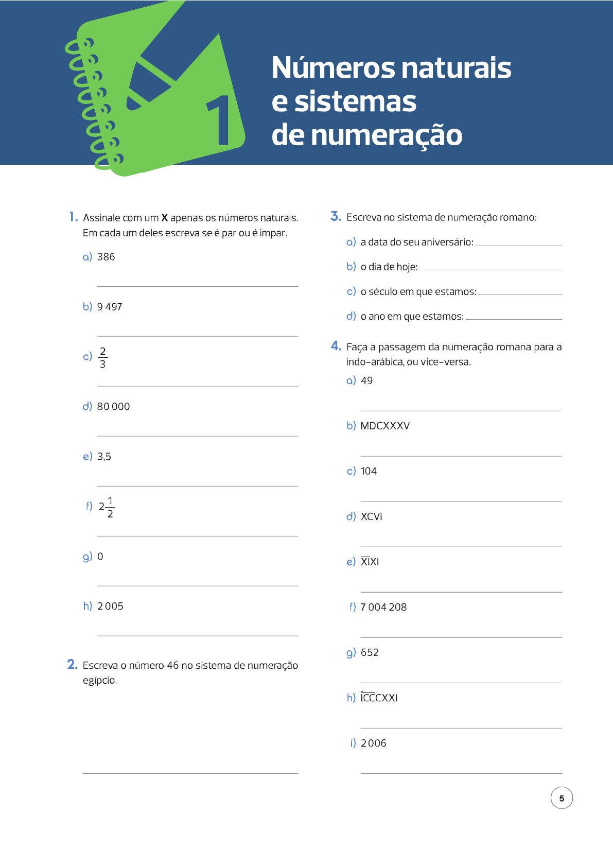 <p>Números naturais 1 e sistemas de numeração 1. Assinale com um X apenas os números naturais. 3. Escreva no sistema de numeração romano: Em cada um deles escreva se é par ou é impar. a) a data do seu a) 386 b) dia de hoje: c) século em que estamos: b) 9 497 d) ano em que estamos: 2 4. Faça a passagem da numeração romana para a c) 3 indo-arábica, ou vice-versa. a) 49 d) 80 b) MDCXXXV e) 3,5 c) 104 f) 2 1 d) XCVI 9) 0 e) XIXI h) f) 7 9) 652 2. Escreva número 46 no sistema de numeração egípcio. h) ICCCXXI i) 2006 5</p><p>5. Escreva em algarismos indo-arábicos: 10. Veja a medida aproximada do diâmetro de alguns planetas do Sistema Solar a) O menor número impar com quatro algarismos. Júpiter: km Marte: 6786km b) menor número com cinco algarismos sem Mercúrios 4 878 km repetir nenhum deles. Terra: 12 756 km 12 103 km Escreva esses números em ordem crescente. c) maior número com cinco algarismos sem re- petir nenhum d) maior número par com dois algarismos. 11. Descubra um padrão e complete as sequências. 6. Existe número natural que não possui sucessor? a) VI, XII, XVIII, 8, 24 , 35. , . 7. Maria tem 5 irmãos e Camila tem sucessor do sucessor do número de irmãos de Maria. Quantos Camila tem? c) 141, 242, 343, 444, , , 12. Para cada item dê pelo menos um exemplo. 8. Assinale com um X apenas as sentenças verda- a) Um número que não é número natural. deiras: a) 8 é antecessor de 7. b) 20 é sucessor de 19. c) 1000 000 é sucessor par de b) Um número natural de quatro algarismos pares e distintos. d) 2 é sucessor do sucessor de 0. 9. Escreva com algarismos: a) antecessor de seis mil e duzentos; c) Um número natural par de quatro algarismos com o 3 sendo o algarismo das b) o sucessor de nove mil, novecentos e noventa e nove; c) consecutivo de mil e um; d) Um número natural maior do que e menor do que 10 001. d) o consecutivo par de duzentos e setenta e qua- tro. 6 Números naturais e sistemas de numeração</p><p>13. Escreva número formado por: 16. Números naturais, grandezas e medidas Vamos testar seus conhecimentos sobre unidades a) duas dezenas mais cinco unidades; de medida (símbolos e valores). Complete e es- creva nome da grandeza correspondente. Con- fira as suas respostas com as de seus colegas. b) cinco centenas mais oito dezenas mais quatro Veja exemplo: 1h = 60 min (tempo). unidades; a) 1km = m ( ); b) 1ano = meses ( ); c) três dezenas de milhar mais seis unidades de milhar mais oito unidades; c) centavos ( ); d) 1m mm ( ); d) nove unidades de milhar mais nove dezenas. e) h ( ); mL ( ); 14. Números naturais e localização 1min = S ( ); Tendo o ponto O como partida, marque a posição h) 1quinzena = dias ( ); de cada um dos seguintes pontos: i) = kg ( ); a) M(4,1) c) N(3,4) e) Y(1,4) b) D(5,2) d) X(5,5) f) P(3,3) j) 1m cm ( ); y k) 1bimestre = 2 ( ); 5 l) g ( ); 4 m) 1semana = dias ( ); 3 2 n) anos ( ); 1 S ( ); 1 2 3 4 5 kg ( ); 1g mg ( ); 15. Números naturais e possibilidades No lançamento simultâneo de dois dados, cujas r) 1 milênio ( ). faces estão numeradas 2 de 1 a 6, quais são as possíveis somas dos nú- 5 3 4 6 17. Escreva antecessor e sucessor dos números naturais: meros das faces que fi- Uma possível soma é 3 cam voltadas paracima? (1 2). a) 36 b) 699 c) 3 d) 5 200 e) 15 999 Números naturais e sistemas de numeração 7</p><p>18. Escreva com algarismos. a) Escreva como se lê número da população un - bana citada; a) Sete mil, quatrocentos e vinte e cinco. b) Dez mil, quinhentos e três. c) Oitenta e cinco mil e novecentos. b) Escreva número da população rural usando a representação simplificada com vírgula; d) Cinco milhões, trezentos e dezessete mil, quatrocentos e trinta. c) Compare os números das duas populações e) Seiscentos mil e setenta e dois. usando os sinais > , < ou = f) Dois bilhões, duzentos milhões, trezentos mil, cento e oitenta e um. 20. Escreva por extenso os números naturais. a) 5 Setemilhões, setemile sete. 19. Carlos e Flávia fizeram uma pesquisa para a aula b) de História e acharam a seguinte informação: "Segundo Censo realizado no ano de 2010, a população urbana do Brasil era de 160 879 708 c) 360 021 habitantes, e a população rural era de 29852986 habitantes". Faça que se pede. d) 4 930 000 000 e) População urbana de Manaus (AM). 21. Indique o valor posicional do 7 em cada um dos números abaixo. a) 35731 b) c) População rural de Macajai (RR). d) 72 439 011 8 Números naturais e sistemas de numeração</p><p>22. Relacione cada item da primeira coluna com 25. Represente usando apenas algarismos. valor correspondente da segunda. a) Vinte e cinco bilhões, duzentos e dezesseis a) 1,8 milhão A) 1800 milhões, cento e vinte mil, oitocentos e seten- b) 1,08 mil B) ta e três. c) 1,8 mil C) 1080 d) 1,08 milhão D) b) Três milhões, trinta e cinco mil, trezentos e um. 23. Desafio Qual é o menor número natural de quatro algaris- c) 200 bilhões, 35 mil e 16. mos cuja soma é 8? d) 2 + 1000 000 + + 24. Escreva com algarismos cada um dos números + 3 000 + 200 + 60 + 9. abaixo, fazendo sua composição. a) e) 2 unidades de milhão + 3 centenas de milhar + + 1unidade de milhar + 4 centenas + 5 deze- nas + 2 unidades b) f) 4000000 + c) 9) 1 dezena de milhão + 2 unidades de milhar + + 6 dezenas + 7 unidades d) 100 + h) 7 unidades de bilhão + 4 dezenas de milhão + + + 9 centenas de milhar + 2 unidades de milhar + + 6 dezenas e) 7 X + i) 8,6 bilhões 26. Desafio f) 8 Eu sou um número natural impar maior do que e menor do que Que número eu sou? Números naturais e sistemas de numeração 9</p><p>27. Decomponha os números e escreva como se lê cada um deles. a) b) 2 c) 28. Examine esta decomposição do número 123458 : 1X + 10 000 + 3 X 1000 + 4 X 100 + Decomponha dessa forma os seguintes números: a) 95 d) 3789 b) 387 e) 10128 c) 905 f) 29. A medida do diâmetro do planeta Marte é de 6 786 quilômetros. diâmetro a) Qual é valor posicional do algarismo 7 nesse número? US 