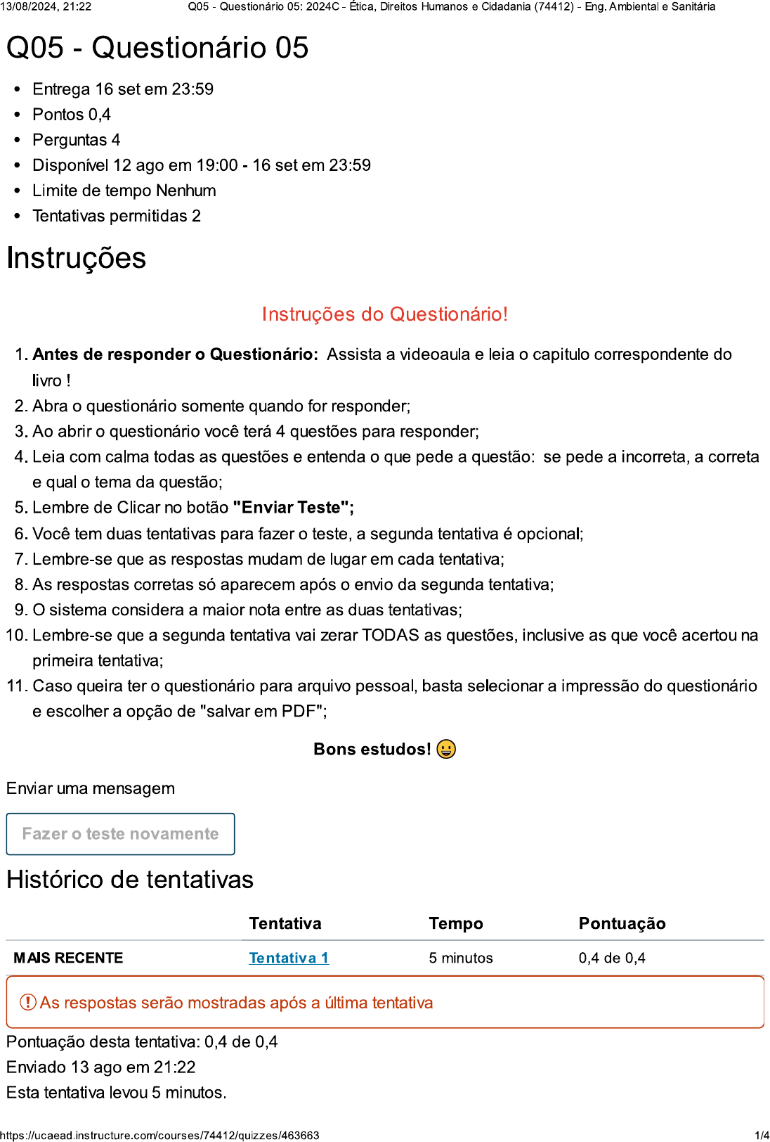 <p>13/08/2024, 21:22 Q05 Questionário 05: 2024C Ética, Direitos Humanos e Cidadania (74412) Eng. Ambiental e Sanitária Q05 - Questionário 05 Entrega 16 set em 23:59 Pontos 0,4 Perguntas 4 Disponível 12 ago em 19:00 - 16 set em 23:59 Limite de tempo Nenhum Tentativas permitidas 2 Instruções Instruções do Questionário! 1. Antes de responder o Questionário: Assista a videoaula e leia o capitulo correspondente do livro ! 2. Abra o questionário somente quando for responder; 3. Ao abrir o questionário você terá 4 questões para responder; 4. Leia com calma todas as questões e entenda o que pede a questão: se pede a incorreta, a correta e qual o tema da questão; 5. Lembre de Clicar no botão "Enviar Teste"; 6. Você tem duas tentativas para fazer o teste, a segunda tentativa é opcional; 7. Lembre-se que as respostas mudam de lugar em cada tentativa; 8. As respostas corretas só aparecem após o envio da segunda tentativa; 9. O sistema considera a maior nota entre as duas tentativas; 10. Lembre-se que a segunda tentativa vai zerar TODAS as questões, inclusive as que você acertou na primeira tentativa; 11. Caso queira ter o questionário para arquivo pessoal, basta selecionar a impressão do questionário e escolher a opção de "salvar em PDF"; Bons estudos! Enviar uma mensagem Fazer teste novamente Histórico de tentativas Tentativa Tempo Pontuação MAIS RECENTE Tentativa 1 5 minutos 0,4 de 0,4 ! As respostas serão mostradas após a última tentativa Pontuação desta tentativa: 0,4 de 0,4 Enviado 13 ago em 21:22 Esta tentativa levou 5 minutos. https://ucaead.instructure.com/courses/74412/quizzes/463663 1/4</p><p>13/08/2024, 21:22 Q05 - Questionário 05: 2024C - Ética, Direitos Humanos e Cidadania (74412) - Eng. Ambiental e Sanitária Pergunta 1 0,1/0,1 pts Estudo da Moral tem diversos campos teóricos sendo que cada área de conhecimento aborda a moral de forma distinta principalmente quanto a sua formação e sua relação com o indivíduo. Dois segmentos teóricos principais norteiam o estudo da moral, sendo eles: Abordagem dedutiva e abordagem indutiva. Abordagem filosófica e abordagem didática. Abordagem científica e abordagem teleológica Abordagem social e abordagem individual. Abordagem afetiva e abordagem racional. Pergunta 2 0,1 / 0,1 pts Analise os itens abaixo e assinale a alternativa correta. - Diversas teorias e métodos são adotados para o estudo da ética e da moral. - Os termos ética e moral nas concepções atuais, são considerados sinônimos. III - Moral e Ética estão relacionadas ao contexto do comportamento e da vida em sociedade. IV - As palavras ética e moral têm origem etimológica distintas, sendo que uma vem do Grego e outra do Latim. Está correto somente o que se afirma nos itens I, e IV Está correto somente o que se afirma nos itens I, III e IV. Está correto somente o que se afirma nos itens e III. Está correto somente o que se afirma nos itens III e IV. Está correto somente o que se afirma nos itens e II. 2/4</p><p>13/08/2024, 21:22 Q05 Questionário 05: 2024C Ética, Direitos Humanos e Cidadania (74412) Eng. Ambiental e Sanitária Pergunta 3 0,1/0,1 pts A dimensão racional do comportamento moral se propõe a definir conteúdos mais precisos para a moral relacionando a moral com termos como igualdade, reciprocidade e justiça e tem por motivação as operações da inteligência (TAILLE, 2006). Sobre a dimensão racional da moral, assinale a alternativa correta: Na abordagem racional o comportamento moral é produto da ação do indivíduo dando a ele mais autonomia. Na abordagem racional leva-se em consideração especialmente aquilo que está no inconsciente do indivíduo. Na abordagem racional não cabe ao indivíduo criar a moral e sim adotar condutas de acordo com a moral criada no âmbito subjetivo. Na abordagem racional o comportamento moral de uma pessoa está ligado ao seu medo intrínseco de descumprir aquele preceito ensinado como moral. Na abordagem racional se atribui maior relevância aos aspectos sentimentais do ser humano do que o produto da razão humana. Pergunta 4 pts Só se fala em ética porque homens, mulheres vivemos em coletividade. Se eu fosse sozinho, não existiria a questão da ética. Afinal, ética é a regulação da conduta da vida coletiva. Se só existisse um ser humano no planeta, o tema da ética não viria à tona, porque ele seria soberano para fazer qualquer coisa sem se importar com nada. Disponível em: http://www.mscortella.com.br Analise os itens abaixo. - Ética é sinônimo de moral afetiva. - Ética e moral se referem ao fenômeno social. III - - A diferença entre ética e moral é algo consolidado e já definido em absoluto pelos estudiosos. IV - a moral então é considerada o comportamento em si do indivíduo que por sua educação formal, tradição, crenças, costumes, ambiente familiar e social adota no dia a dia em suas ações sociais. V - a ética é um conjunto de regras compostas pelos valores da coletividade que foram consolidados por meio dos comportamentos (moral). https://ucaead.instructure.com/courses/74412/quizzes/463663 3/4</p><p>13/08/2024, 21:22 Q05 - Questionário 05: 2024C - Ética, Direitos Humanos e Cidadania (74412) - Eng. Ambiental e Sanitária Está correto somente que se afirma nos itens: II, III e V. I, e IV. le IV. III e V. II, IV e V. Pontuação do teste: 0,4 de 0,4 4/4</p>