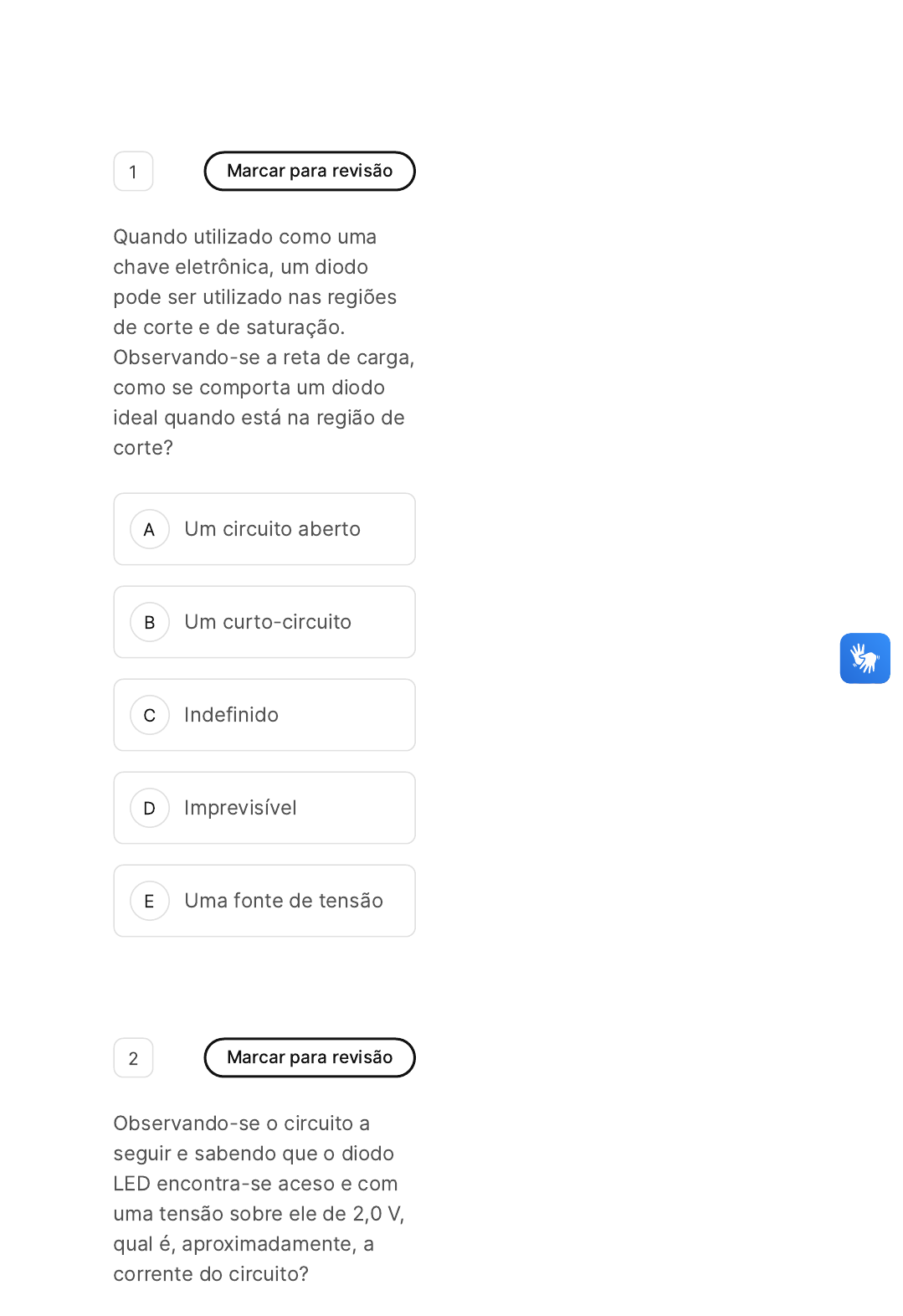<p>05/04/2024, 16:48 estacio.saladeavaliacoes.com.br/prova/661053b7203295ff6161e846/</p><p>https://estacio.saladeavaliacoes.com.br/prova/661053b7203295ff6161e846/ 1/9</p><p>A</p><p>B</p><p>C</p><p>D</p><p>E</p><p>1 Marcar para revisão</p><p>Quando utilizado como uma</p><p>chave eletrônica, um diodo</p><p>pode ser utilizado nas regiões</p><p>de corte e de saturação.</p><p>Observando-se a reta de carga,</p><p>como se comporta um diodo</p><p>ideal quando está na região de</p><p>corte?</p><p>Um circuito aberto</p><p>Um curto-circuito</p><p>Indefinido</p><p>Imprevisível</p><p>Uma fonte de tensão</p><p>2 Marcar para revisão</p><p>Observando-se o circuito a</p><p>seguir e sabendo que o diodo</p><p>LED encontra-se aceso e com</p><p>uma tensão sobre ele de 2,0 V,</p><p>qual é, aproximadamente, a</p><p>corrente do circuito?</p><p>05/04/2024, 16:48 estacio.saladeavaliacoes.com.br/prova/661053b7203295ff6161e846/</p><p>https://estacio.saladeavaliacoes.com.br/prova/661053b7203295ff6161e846/ 2/9</p><p>A</p><p>B</p><p>C</p><p>D</p><p>E</p><p>17 mA</p><p>21,28 mA</p><p>0 mA</p><p>4,25 mA</p><p>12,8 mA</p><p>3 Marcar para revisão</p><p>Dado o circuito apresentado a</p><p>seguir, assinale a alternativa</p><p>que indica o valor da tensão no</p><p>coletor V .C</p><p>05/04/2024, 16:48 estacio.saladeavaliacoes.com.br/prova/661053b7203295ff6161e846/</p><p>https://estacio.saladeavaliacoes.com.br/prova/661053b7203295ff6161e846/ 3/9</p><p>A</p><p>B</p><p>C</p><p>D</p><p>E</p><p>A</p><p>B</p><p>0V</p><p>2V</p><p>5V</p><p>10V</p><p>12V</p><p>4 Marcar para revisão</p><p>No circuito da figura a seguir, o</p><p>transistor PNP tem β � 100 e</p><p>VBE � �0,7 V. Sendo R1 � 20</p><p>KΩ, R2 � 20 KΩ, RC � 3 KΩ,</p><p>RE � 1 KΩ e VCC � 10 V, qual o</p><p>valor da corrente Ic?</p><p>0, 38mA</p><p>3, 87mA</p><p>05/04/2024, 16:48 estacio.saladeavaliacoes.com.br/prova/661053b7203295ff6161e846/</p><p>https://estacio.saladeavaliacoes.com.br/prova/661053b7203295ff6161e846/ 4/9</p><p>C</p><p>D</p><p>E</p><p>A</p><p>B</p><p>C</p><p>D</p><p>E</p><p>5, 13mA</p><p>4, 25mA</p><p>5, 64mA</p><p>5 Marcar para revisão</p><p>Um transistor pode ter</p><p>diferentes polarizações de</p><p>acordo com a forma que a</p><p>fonte de alimentação se</p><p>conecta aos terminais. Quando</p><p>uma fonte de alimentação</p><p>contínua é conectada aos</p><p>terminais de um transistor de</p><p>tal maneira que as junções</p><p>emissor/base e coletor/base</p><p>estão polarizadas diretamente,</p><p>falamos que a polarização é:</p><p>Direta.</p><p>Direta-Direta.</p><p>Reversa-Direta.</p><p>Reversa.</p><p>Direta-Reversa.</p><p>00</p><p>hora</p><p>: 42</p><p>min</p><p>: 24</p><p>seg</p><p>Ocultar</p><p>Questão 6 de 10</p><p>Respondidas �3� Em branco �7�</p><p>Finalizar prova</p><p>1 2 3 4 5</p><p>6 7 8 9 10</p><p>SM2 Eletrônica Analógica Sair</p><p>05/04/2024, 16:48 estacio.saladeavaliacoes.com.br/prova/661053b7203295ff6161e846/</p><p>https://estacio.saladeavaliacoes.com.br/prova/661053b7203295ff6161e846/ 5/9</p><p>A</p><p>B</p><p>C</p><p>D</p><p>E</p><p>6 Marcar para revisão</p><p>Observando o circuito da figura</p><p>a seguir e considerando que V</p><p>� V , determine a tensão</p><p>V .</p><p>Fonte: EnsineMe.</p><p>P</p><p>GS(off)</p><p>D</p><p>�4V</p><p>0V</p><p>�18V</p><p>4V</p><p>18V</p><p>7 Marcar para revisão</p><p>05/04/2024, 16:48 estacio.saladeavaliacoes.com.br/prova/661053b7203295ff6161e846/</p><p>https://estacio.saladeavaliacoes.com.br/prova/661053b7203295ff6161e846/ 6/9</p><p>A</p><p>B</p><p>C</p><p>D</p><p>E</p><p>Calcule a tensão de saída para</p><p>o circuito da figura. Considere:</p><p>V � 5mV; V � 10mV e V �</p><p>15mV; R � 10kΩ; R � 10kΩ; R</p><p>� 10kΩ e R � 10kΩ.</p><p>Fonte: Raphael de Souza dos</p><p>Santos.</p><p>1 2 3</p><p>f 1 2</p><p>3</p><p>20mV</p><p>0V</p><p>30mV</p><p>�30mV</p><p>�20mV</p><p>8 Marcar para revisão</p><p>Calcule a tensão de saída do</p><p>circuito da figura a seguir:</p><p>05/04/2024, 16:48 estacio.saladeavaliacoes.com.br/prova/661053b7203295ff6161e846/</p><p>https://estacio.saladeavaliacoes.com.br/prova/661053b7203295ff6161e846/ 7/9</p><p>A</p><p>B</p><p>C</p><p>D</p><p>E</p><p>Fonte: Raphael de Souza dos</p><p>Santos.</p><p>12,12 mV</p><p>�12,12mV</p><p>�1,2mV</p><p>1,2m V</p><p>0V</p><p>9 Marcar para revisão</p><p>Em um circuito com diodo</p><p>semicondutor (modelo linear), o</p><p>ponto de operação �Ponto</p><p>Quiescente) é definido pelos</p><p>pontos V � 0,7 V e I � 3,5</p><p>mA. Determine a resistência</p><p>interna do diodo.</p><p>DQ DQ</p><p>05/04/2024, 16:48 estacio.saladeavaliacoes.com.br/prova/661053b7203295ff6161e846/</p><p>https://estacio.saladeavaliacoes.com.br/prova/661053b7203295ff6161e846/ 8/9</p><p>A</p><p>B</p><p>C</p><p>D</p><p>E</p><p>A</p><p>B</p><p>2 Ω</p><p>200 Ω</p><p>0 Ω</p><p>2.000 Ω</p><p>20 Ω</p><p>10 Marcar para revisão</p><p>Analise o circuito a seguir.</p><p>Dado o circuito representado</p><p>pela figura, o valor de VCE e a</p><p>região de operação do circuito</p><p>são, respectivamente:</p><p>�Considere: VBE � 0,7V e β �</p><p>100).</p><p>�3.9V, região reversa.</p><p>10V, região de corte.</p><p>05/04/2024, 16:48 estacio.saladeavaliacoes.com.br/prova/661053b7203295ff6161e846/</p><p>https://estacio.saladeavaliacoes.com.br/prova/661053b7203295ff6161e846/ 9/9</p><p>C</p><p>D</p><p>E</p><p>5V, região linear.</p><p>�5V, região linear.</p><p>0V, região de</p><p>saturação.</p>