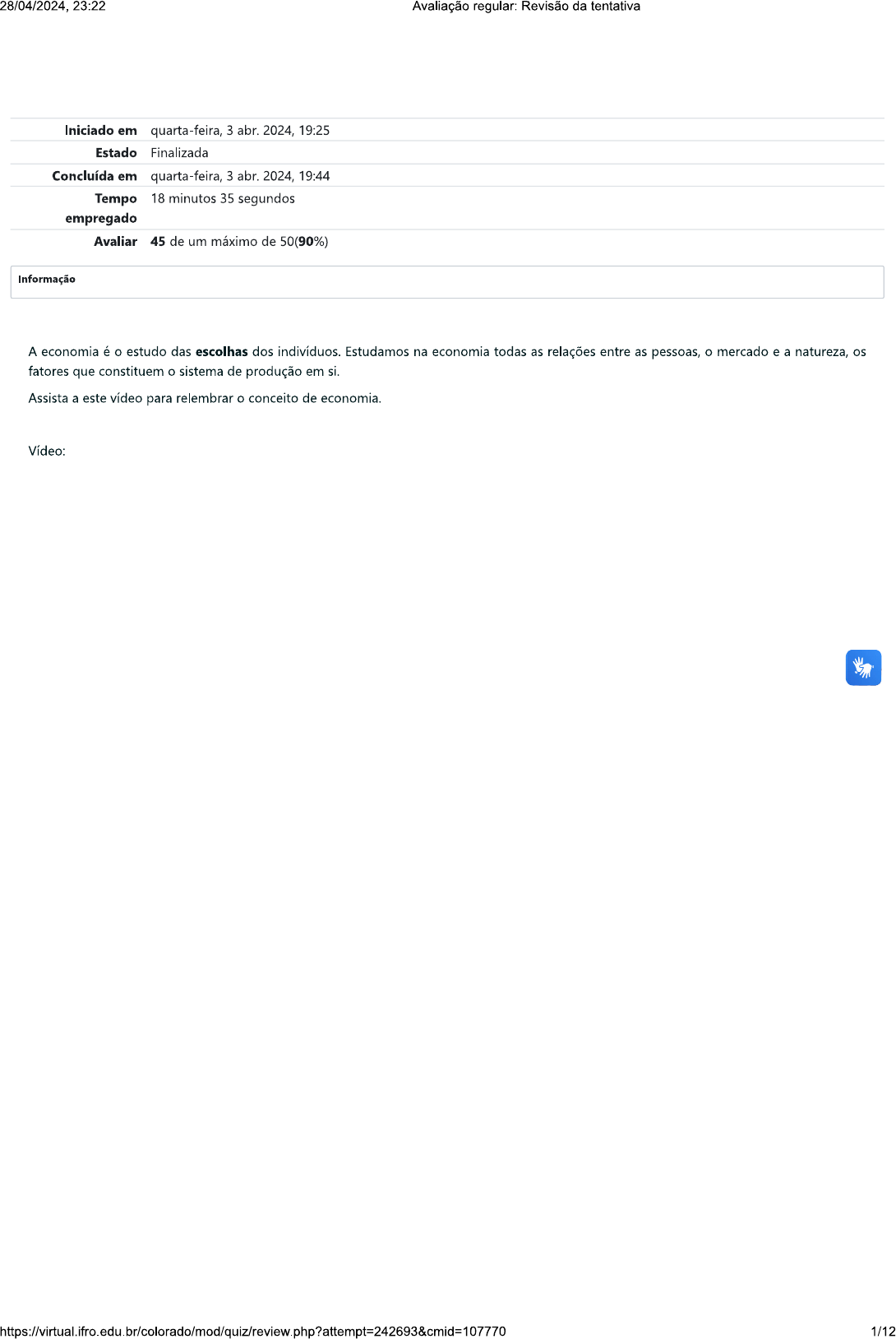 <p>28/04/2024, 23:22 Avaliação regular: Revisão da tentativa Iniciado em quarta-feira, 3 abr. 2024, 19:25 Estado Finalizada Concluída em quarta-feira, 3 abr. 2024, 19:44 Tempo 18 minutos 35 segundos empregado Avaliar 45 de um máximo de 50(90%) Informação A economia é o estudo das escolhas dos indivíduos. Estudamos na economia todas as relações entre as pessoas, o mercado e a natureza, os fatores que constituem o sistema de produção em si. Assista a este vídeo para relembrar o conceito de economia. Vídeo: 1/12</p><p>28/04/2024, 23:22 Avaliação regular: Revisão da tentativa Questão 1 Incorreto Atingiu 0 de 5 Julgue os itens a seguir, considerando os conceitos de economia. I) "Economia são todas as atividades desenvolvidas pelos homens com a finalidade de produção, distribuição e consumo de bens e serviços necessários à sobrevivência e à qualidade de vida". II) "O estudo da economia é todo baseado na escassez". III) "Na teoria econômica, necessidades básicas são limitadas e continuamente modificadas por constantes inovações tecnológicas". IV) "A renda não influencia as nossas necessidades humanas". Escolha uma opção: a. Apenas o item I está certo. x b. Apenas os itens II e III estão certos. C. Apenas o item III está certo. d. Apenas o item IV está errado. e. Apenas os itens e estão certos. Sua resposta está incorreta. Os itens III e IV estão errados III) Na teoria econômica, necessidades básicas são ILIMITADAS e continuamente modificadas por constantes inovações tecnológicas. IV) A renda INFLUENCIA as nossas necessidades humanas. A resposta correta é: Apenas os itens e II estão certos. 2/12</p><p>28/04/2024, 23:22 Avaliação regular: Revisão da tentativa Questão 2 Correto Atingiu 5 de 5 Julgue os itens a seguir, relativos às características básicas da economia. Marque V para as assertivas verdadeiras e F para falsas: ( ) A lei da escassez implica que nem todos os objetivos e necessidades da sociedade podem ser atingidos ao mesmo ( ) Os bens livres têm como característica a utilidade, a escassez e a possibilidade de transferência. Os bens econômicos, por outro lado, são aqueles disponíveis em quantidade suficiente para satisfazer todo mundo, como o ar que respiramos, por exemplo. ( ) objeto de estudo da economia é o patrimônio. ( ) A inflação é o aumento contínuo e generalizado do nível de preços. A distribuição de renda é o modo como a sociedade distribui os frutos da produção. As áreas de estudo da economia se dividem em duas partes: a microeconomia, que estuda os comportamentos individuais, e a macroeconomia, que estuda o resultado agregado dos vários comportamentos individuais Escolha uma opção: a. EVEVEV b. d. e. Sua resposta está correta. Verdadeira F: Os conceitos estão trocados. Os bens econômicos têm como característica a utilidade, a escassez e a possibilidade de transferência. Os b livres, por outro lado, são aqueles disponíveis em quantidade suficiente para satisfazer todo mundo, como o ar que respiramos, por exemp F: objeto de estudo da economia NÃO é o patrimônio. Ao estudar as escolhas dos homens para lidar com a escassez, a economia passa a se aprofundar em alguns objetos de estudos. Os seus principais são o estudo das características de concorrência de cada mercado e a formação de preços, o estudo do crescimento da produção e do emprego, o controle da inflação, a distribuição de renda, entre outros. Verdadeira Verdadeira Verdadeira A resposta correta é: 3/12</p><p>28/04/2024, 23:22 Avaliação regular: Revisão da tentativa Questão 3 Correto Atingiu 5 de 5 No campo da economia, quando há escassez, a sociedade deve decidir como alocar e usar os recursos, constituindo-se em uma de suas principais razões de ser, pois cabe a ela estudar como melhor alocar os recursos limitados aos desejos ilimitados. Daí conclui-se que a escassez está intimamente relacionada com a lei: Escolha uma opção: a. da oferta e da procura. b. do crescimento decrescente. C. do consumismo. d. da mão invisível. e. do monopólio. Sua resposta está correta. A resposta correta é: da oferta e da procura. Informação Em relação à história do pensamento econômico, pode ser denominado "escola de pensamento econômico" um grupo de pensadores econômicos (economistas) que compartilham uma visão em comum sobre o funcionamento das economias. Juntos, esses pensado touxeram ideias e contribuem para o debate do que forma a teoria econômica. Fonte: Pixabay pensamento econômico pode ser dividido em três fases: 1) pré-moderna, formado pelas escolas greco-romana, indiana, persa, islâmica e imperial chinesa; 2) início da fase moderna, com os mercantilistas e os fisiocratas; e 3) moderna, começando com Adam Smith e a economia clássica no final do século XVIII. Nesta esteira, vamos resolver algumas questões acerca deste tema. 4/12</p><p>28/04/2024, 23:22 Avaliação regular: Revisão da tentativa Questão 4 Correto Atingiu 5 de 5 São características da escola clássica, EXCETO: Escolha uma opção: a. Trata-se de uma escola segundo a qual a iniciativa privada deve agir livremente, com pouca ou nenhuma intervenção governamental. b. Defende-se que a mudança para um ambiente de livre concorrência deve ocorrer quando o mercado nacional estiver mais maduro. C. Smith explica que as pessoas são movidas pelo "autointeresse", pelo individualismo, e isso, entre outros fatores, é o que promove o crescimento econômico e a inovação tecnológica. d. Os debates teóricos dessa escola se concentram na tendência dos mercados de se moverem para um equilíbrio de quantidades e preços de mercadorias. e. Adam Smith é considerado o pai da economia moderna. Seu livro mais famoso intitula-se Uma investigação sobre a natureza e a causa da riqueza das nações. Sua resposta está correta. A assertiva "Defende-se que a mudança para um ambiente de livre concorrência deve ocorrer quando o mercado nacional 